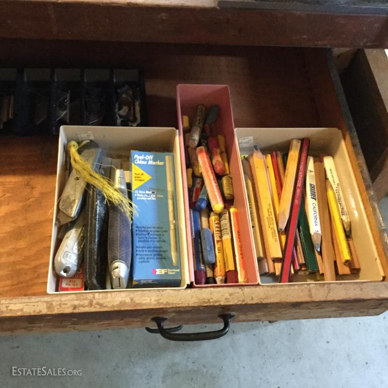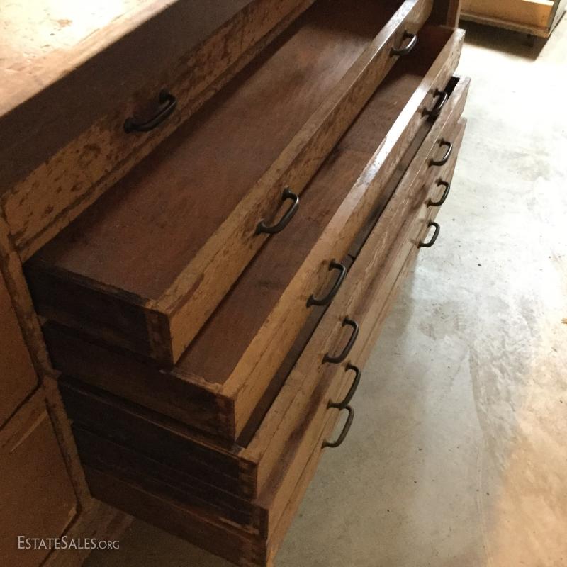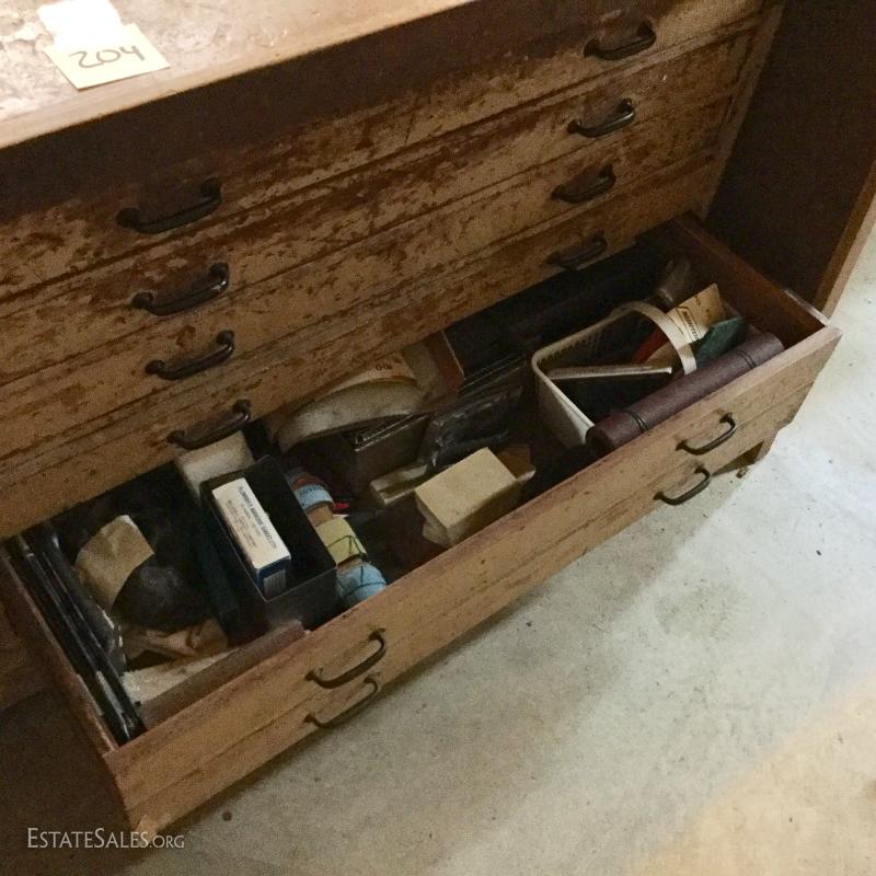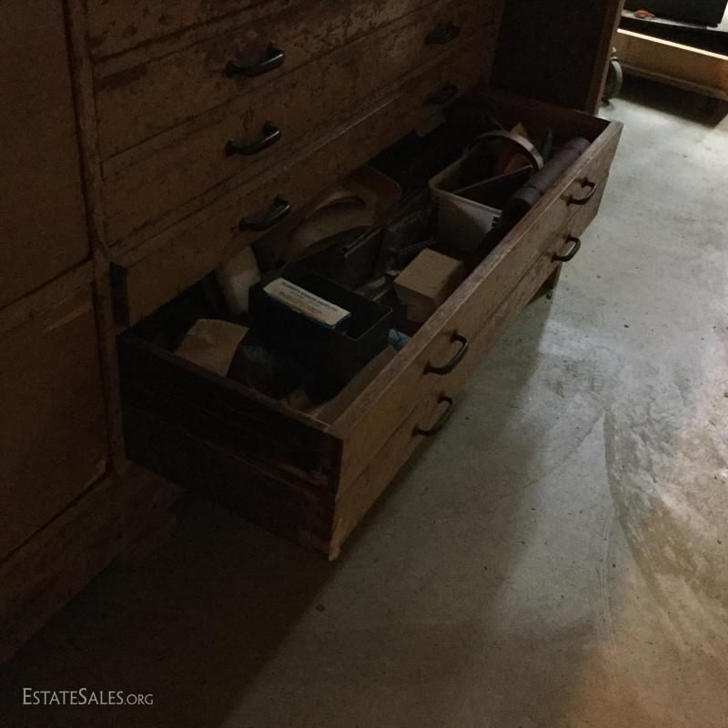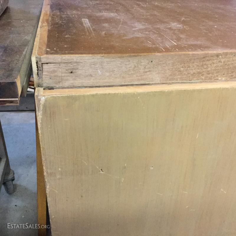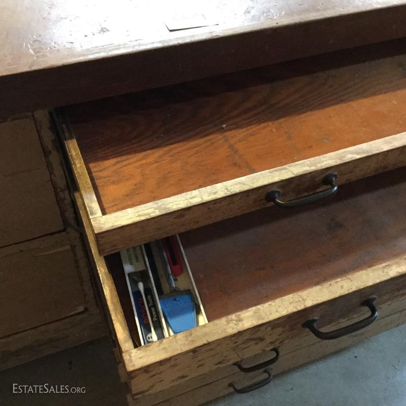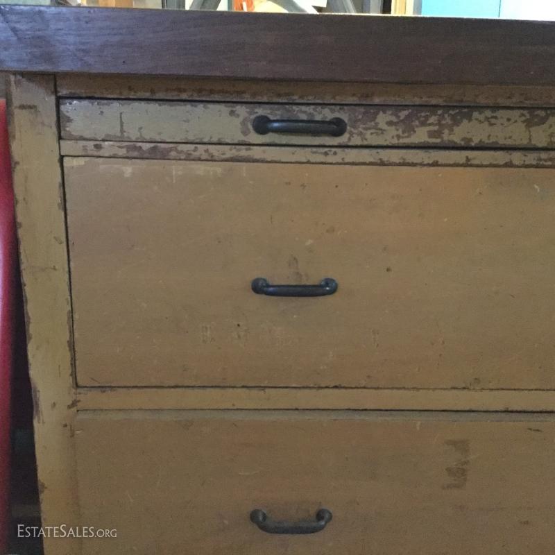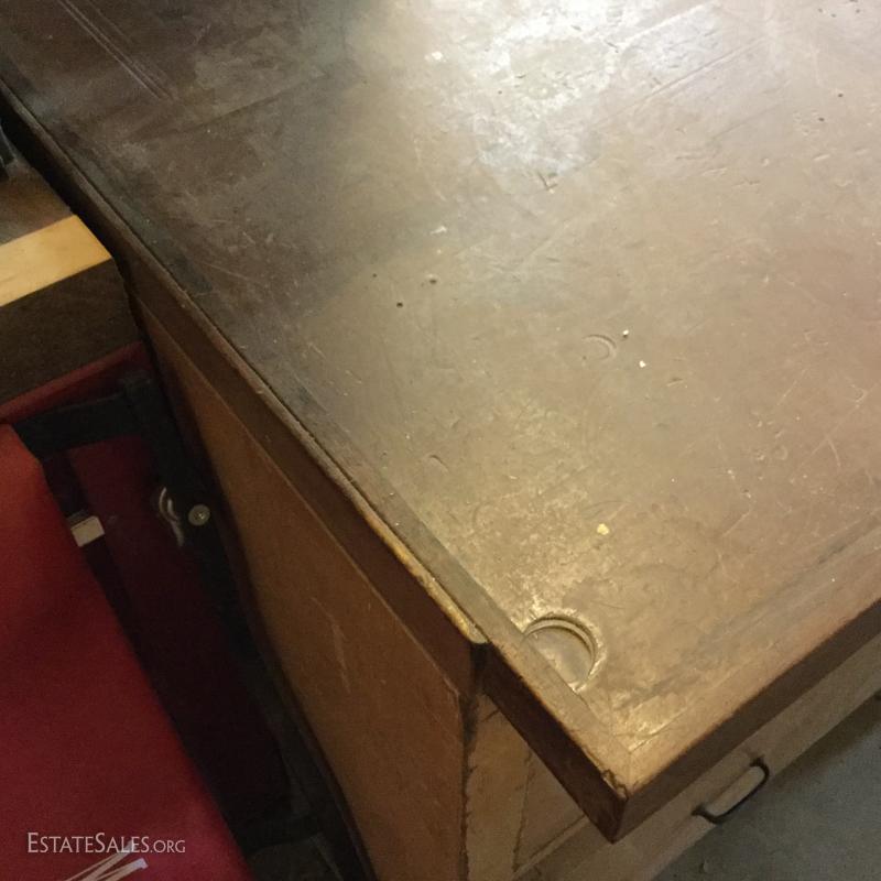 Very large workshop table, 84.5"l x 35"w x 36"h. Incredibly heavy!! Do NOT bid unless you have the means to move it. Will likely need more than just muscle. Bottom is one solid piece. Top is 2.5" thick. Table is super sturdy and comes with drawer contents. Also includes attached vice and brackets.