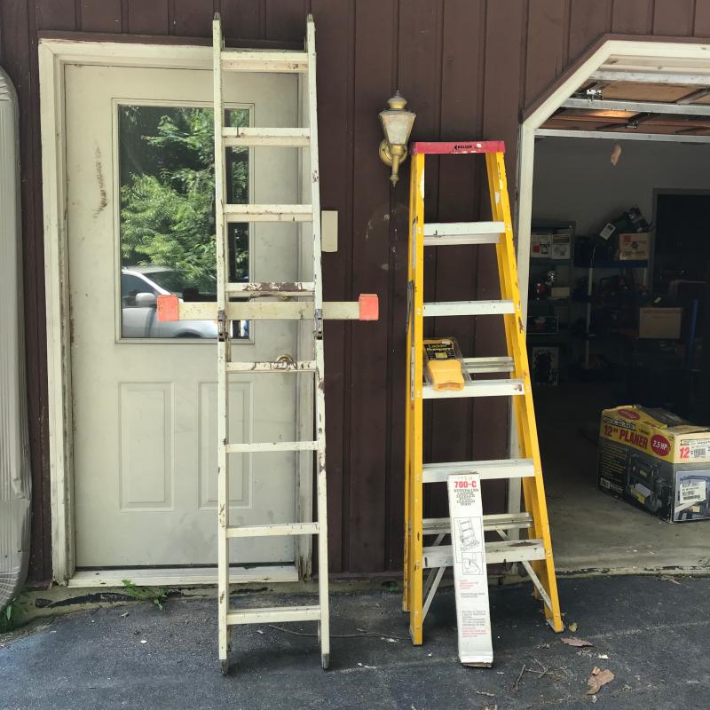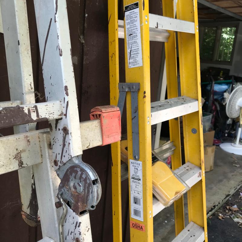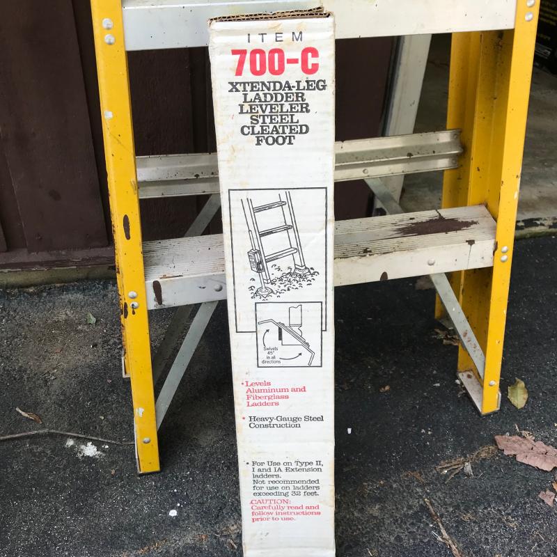 Two large OSHA approved ladders. Yellow one is a 6’ fiberglass Keller, other one is an extraction ladder and approx. 91” long when folded. Lot also includes a ladder leveler, and ladder bumpers. No shipping. Local pickup only.
