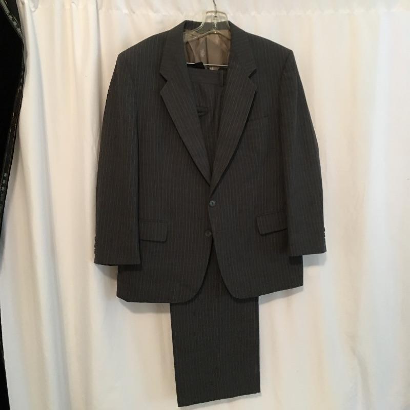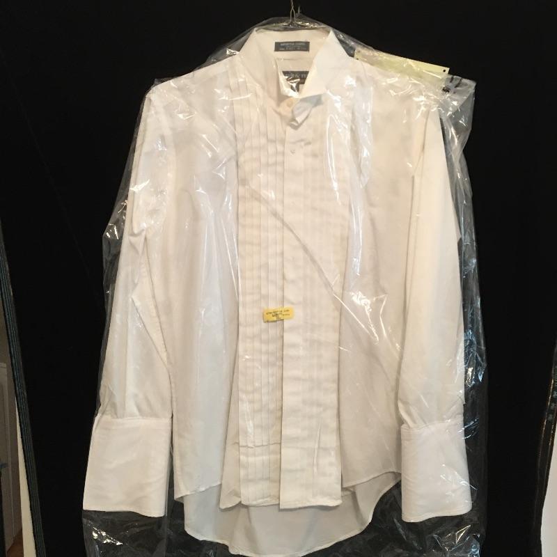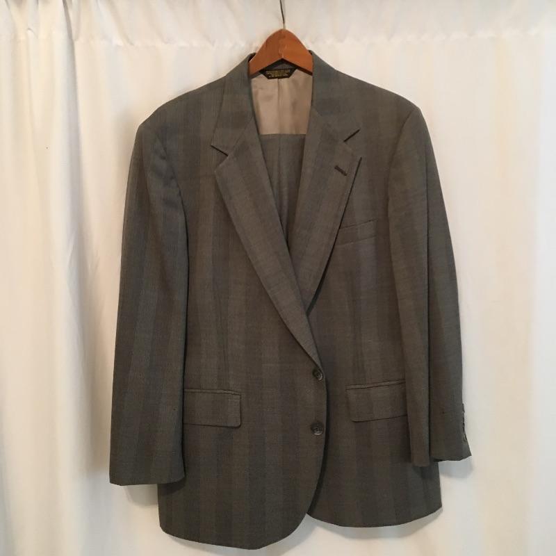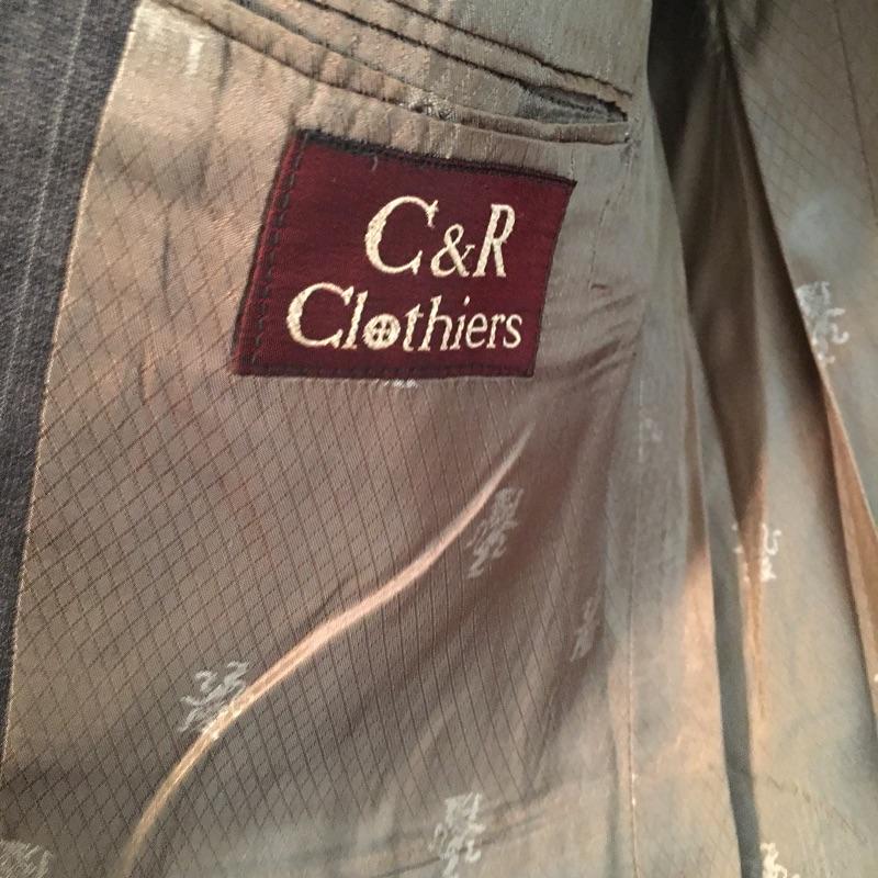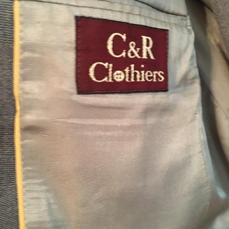 Pair of men’s suits both by C & R Clothiers, tuxedo shirt, cashmere sweater and two that are unmarked but feel like the cashmere sweater, two pair of shoes that seem to be size 7-7.5 and a Scottish tartan tie.