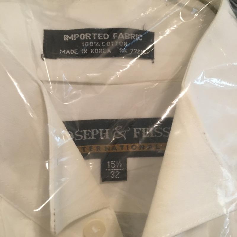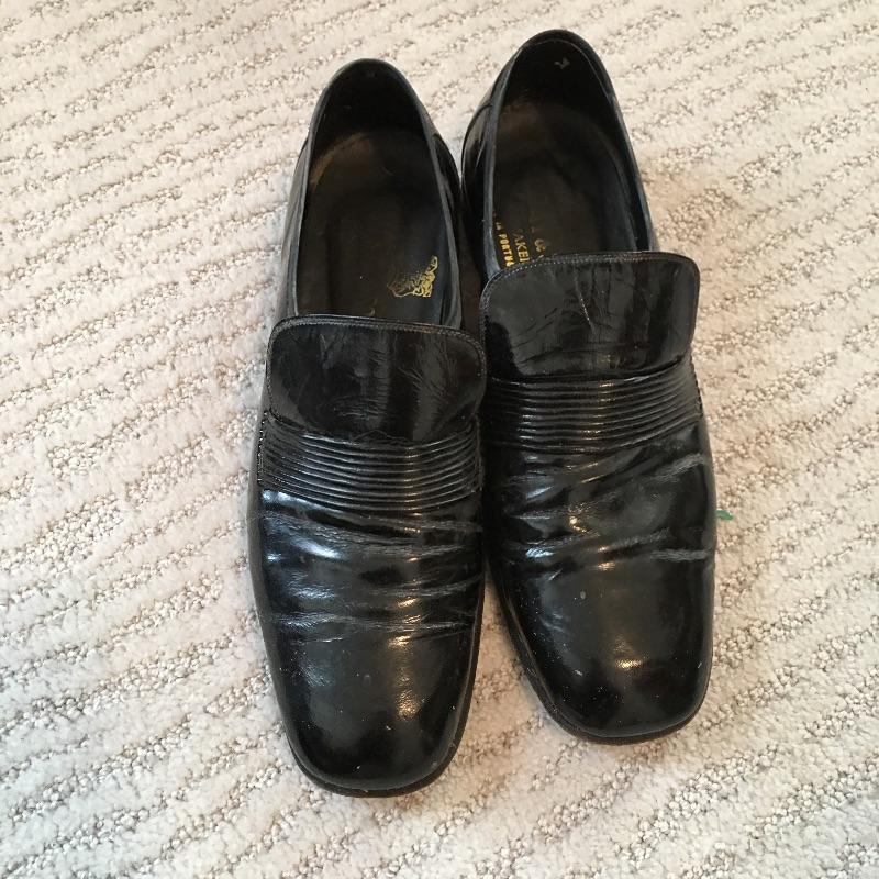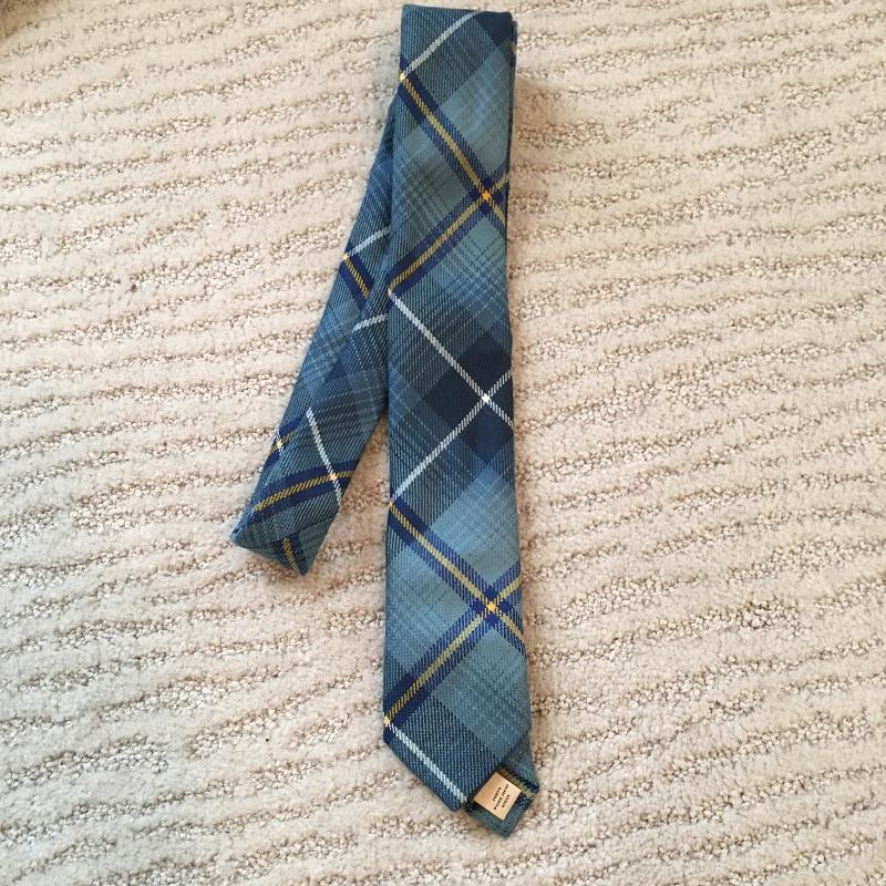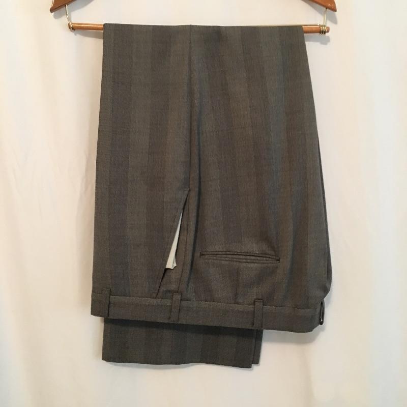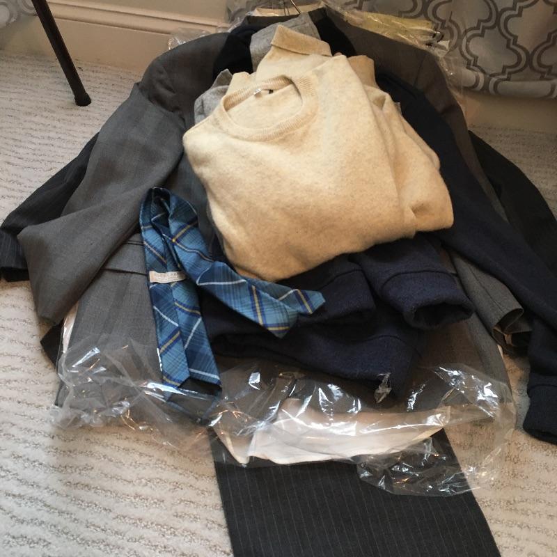 Pair of men’s suits both by C & R Clothiers, tuxedo shirt, cashmere sweater and two that are unmarked but feel like the cashmere sweater, two pair of shoes that seem to be size 7-7.5 and a Scottish tartan tie.