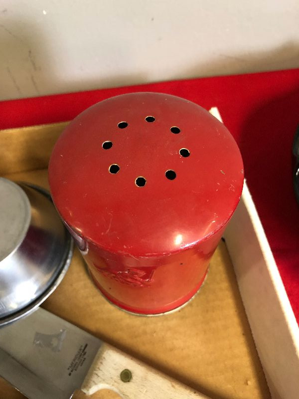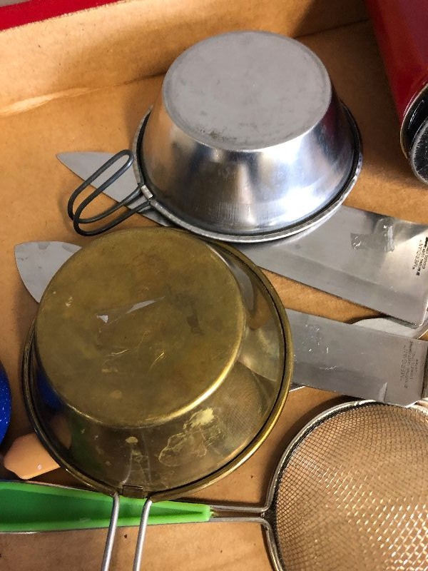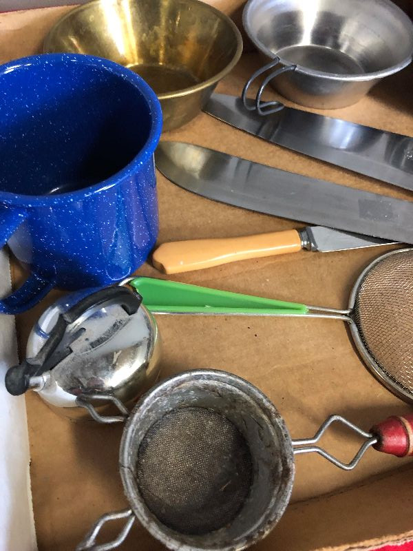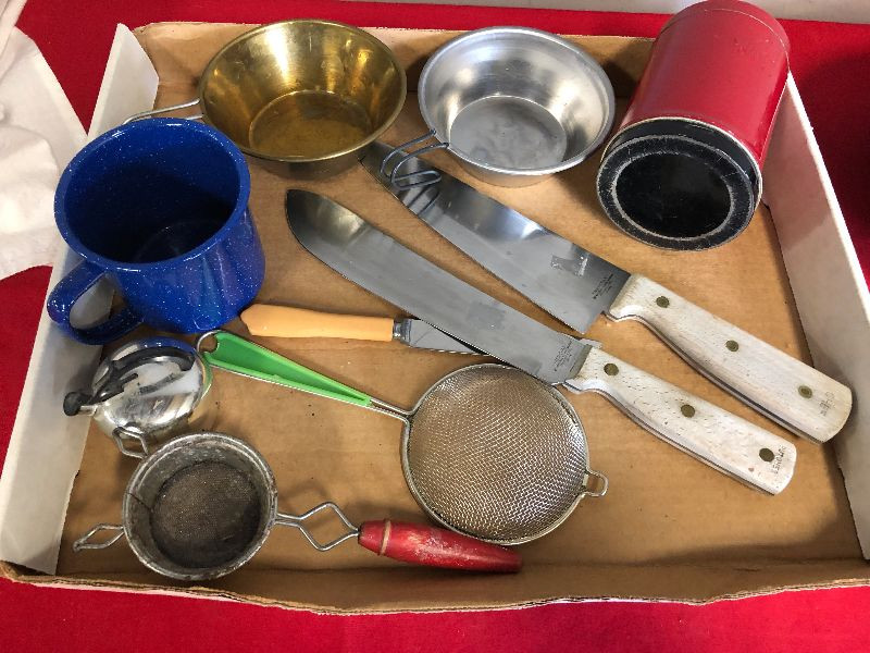 Lot 204 Misc. Vintage Kitchenware knives, cups graniteware