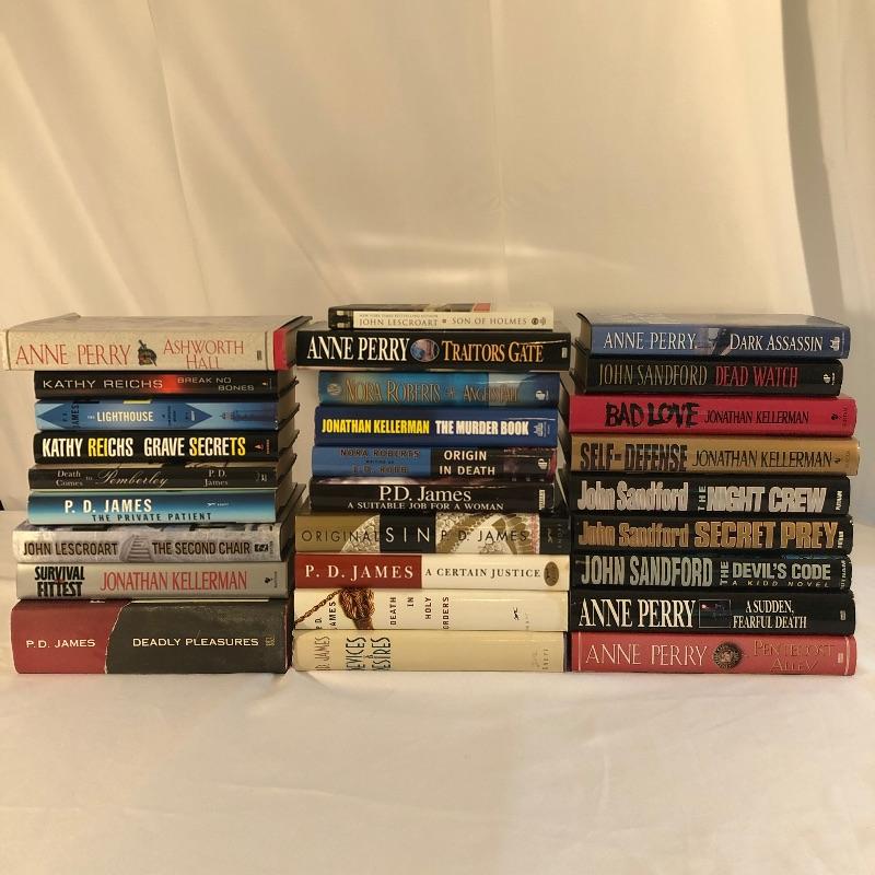 Lot includes books you can’t put down. Includes authors like John Sandford, Johnathon Kellerman, Anne Perry, and PD James. The murder mysteries are page turners! No shipping.