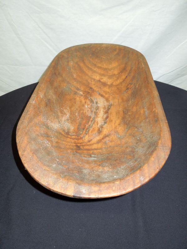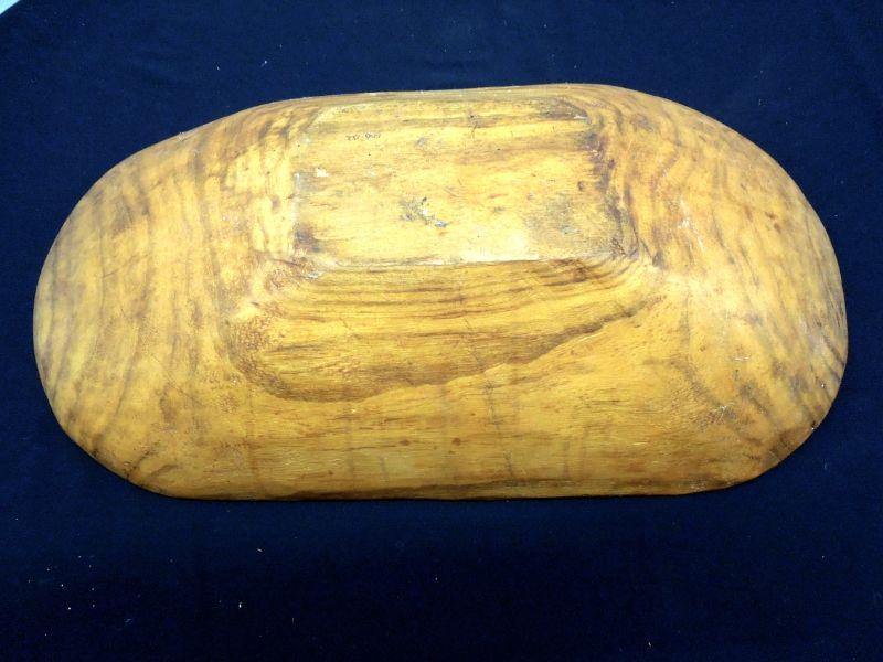 This older bowl is in very good condition and measures 22" L x 12" W x 5.5" H. It has no seams and is hand carved of one piece of wood. No makers mark.
