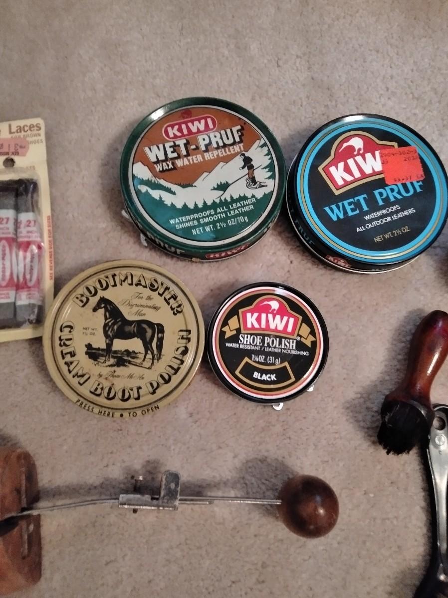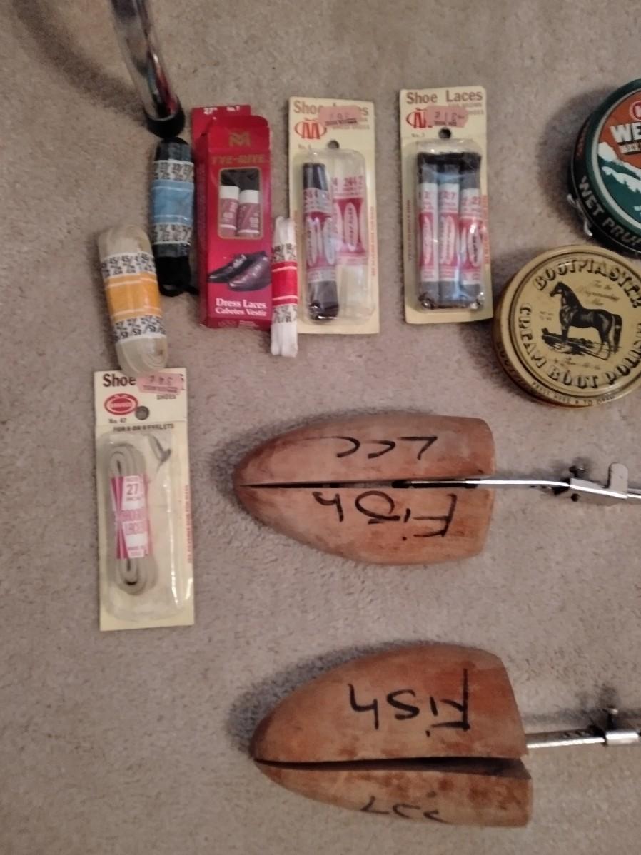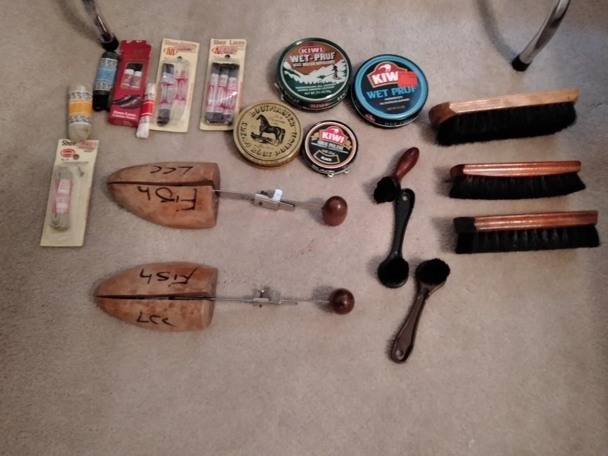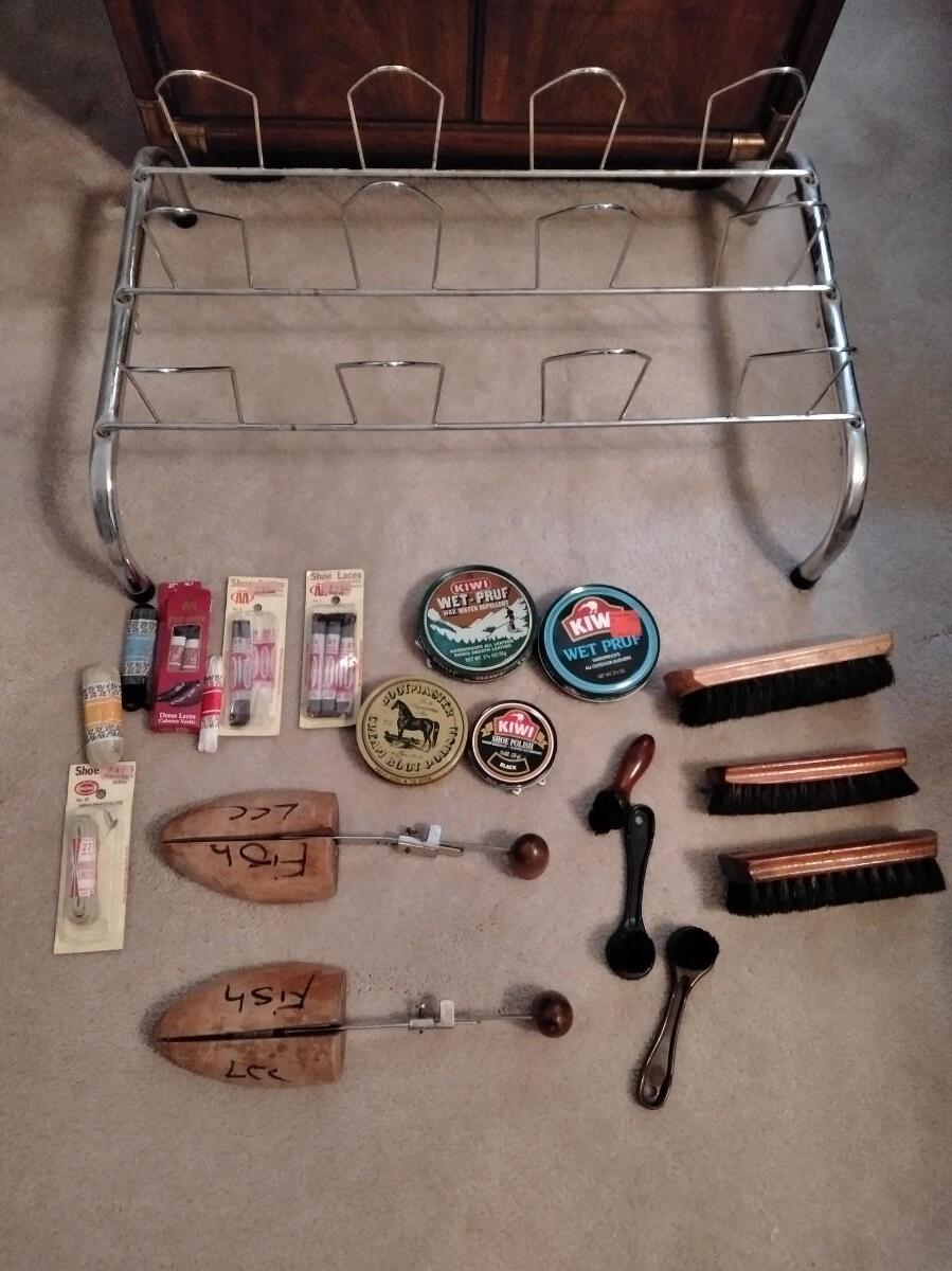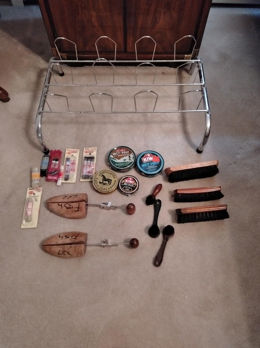 SHOE CARE INCLUDING POLISHES AND BRISHES, STRETCHERS, AND A SHOE ORGANIZING RACK.