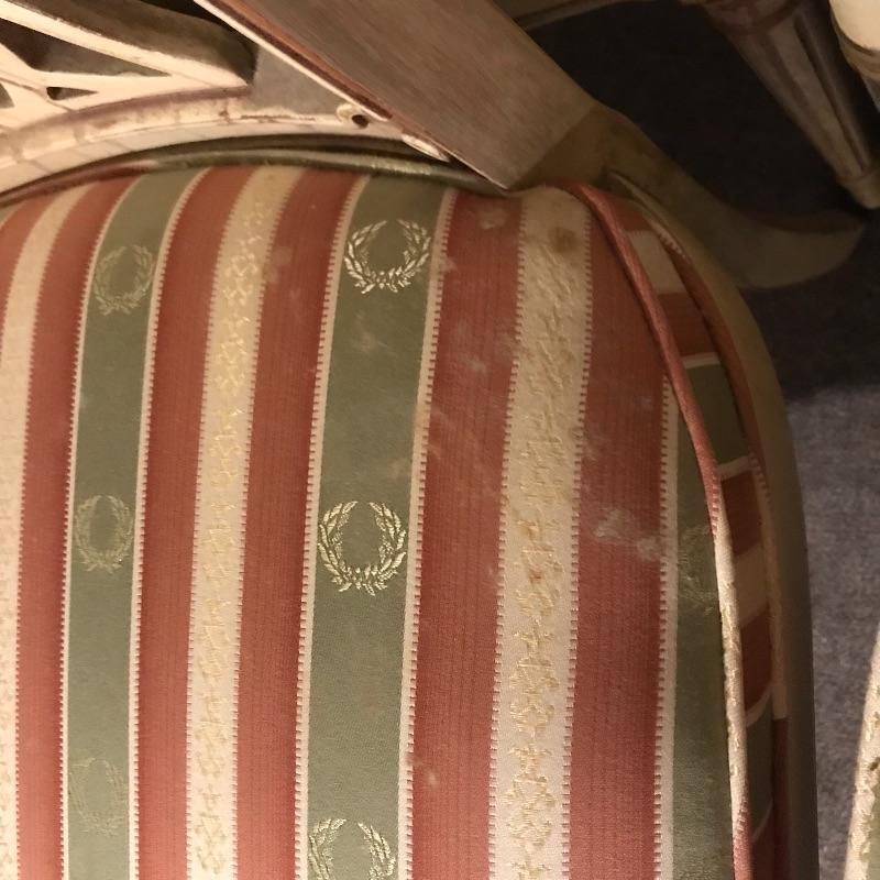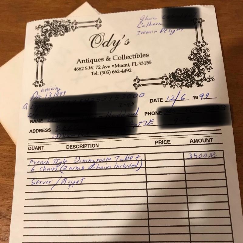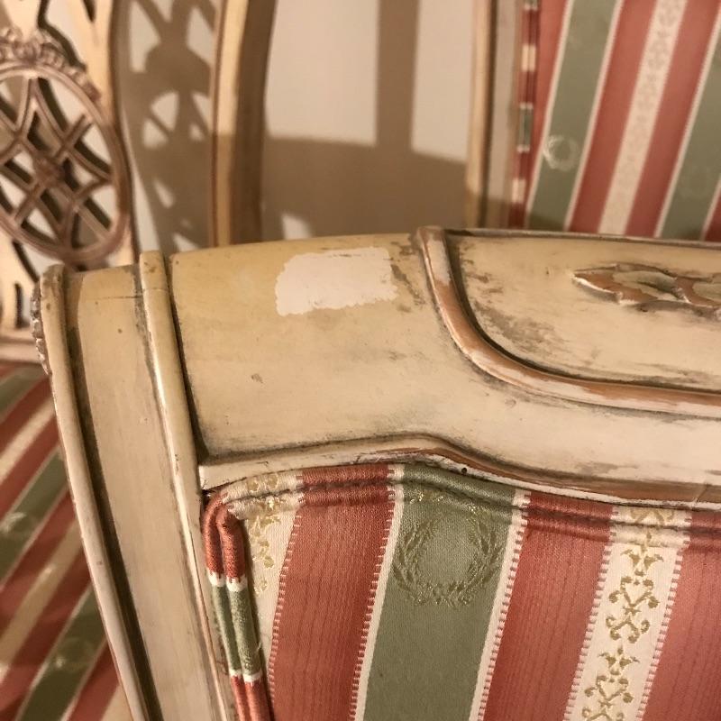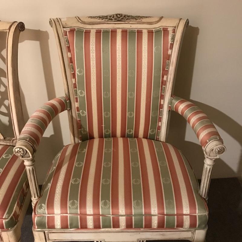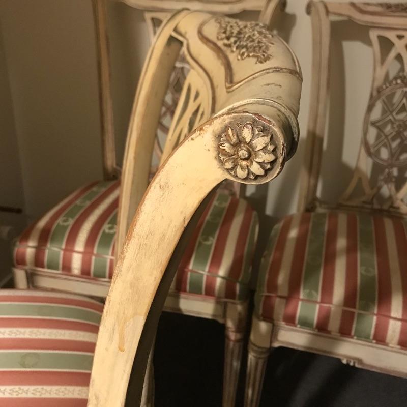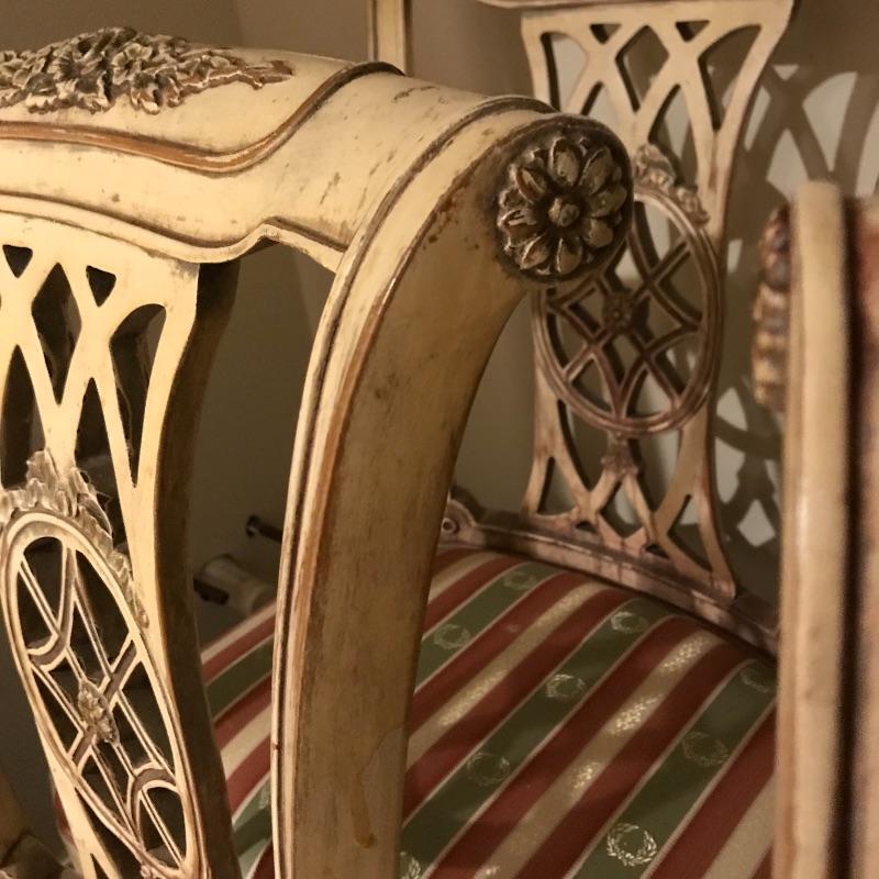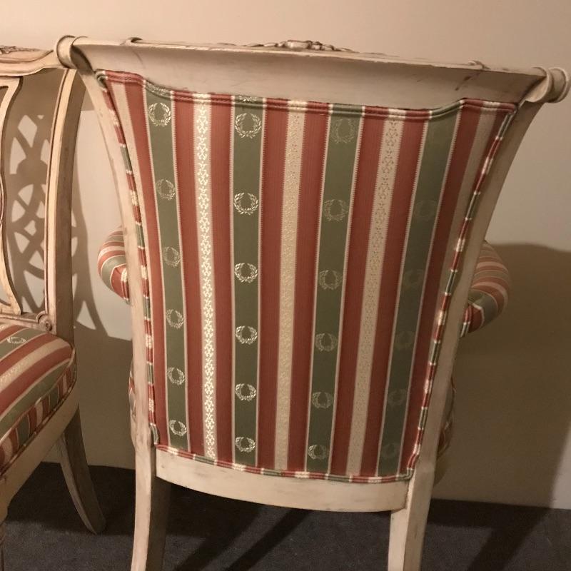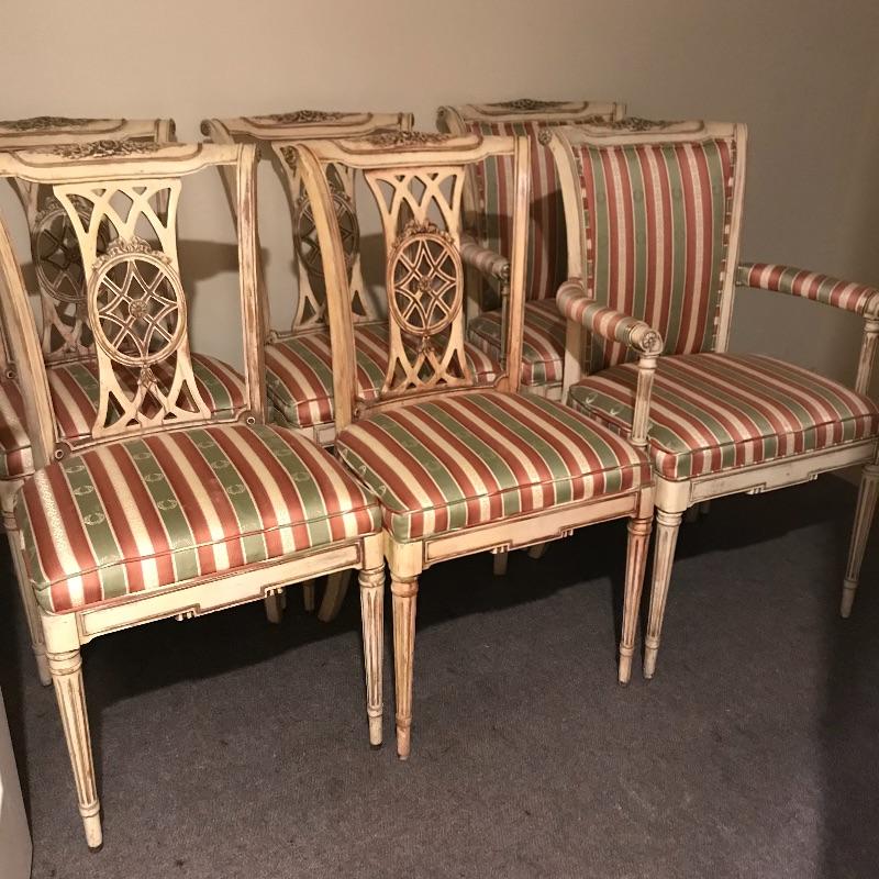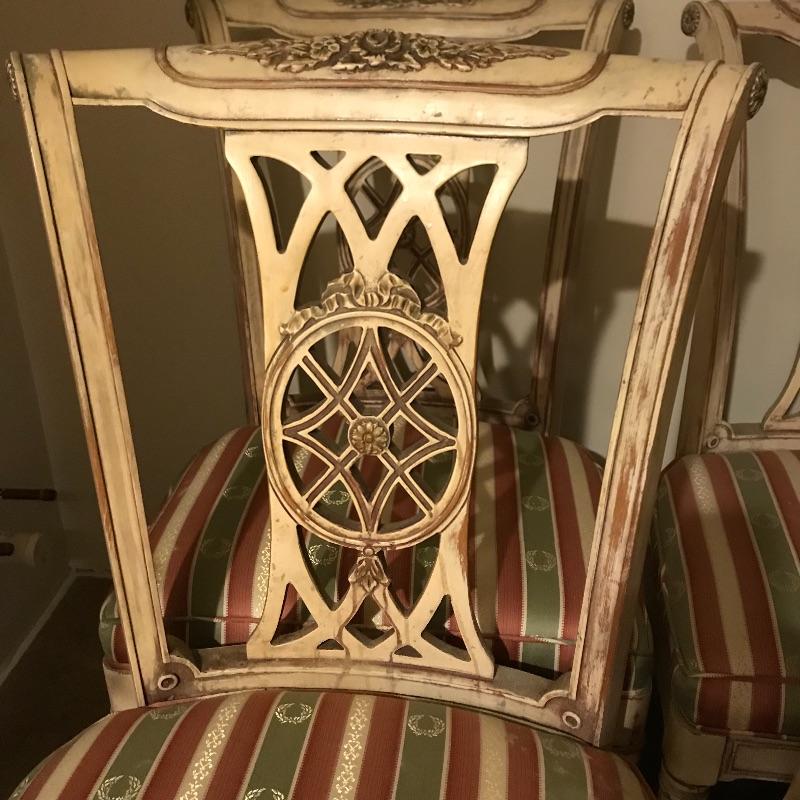 Six lovely dining chairs with salmon, olive and gold accented ivory striped upholstery. Two head chairs with arm rests have upholstered backs while the other four appear to be carved wood. Manufacturer information was not located on chairs, but we have found a receipt for chairs and matching items in lots 202 and 206 from Ody’s Antiques and Collectibles in Miami. Chairs measure 22” x 20” x 39” with a seat height of 20.5”.