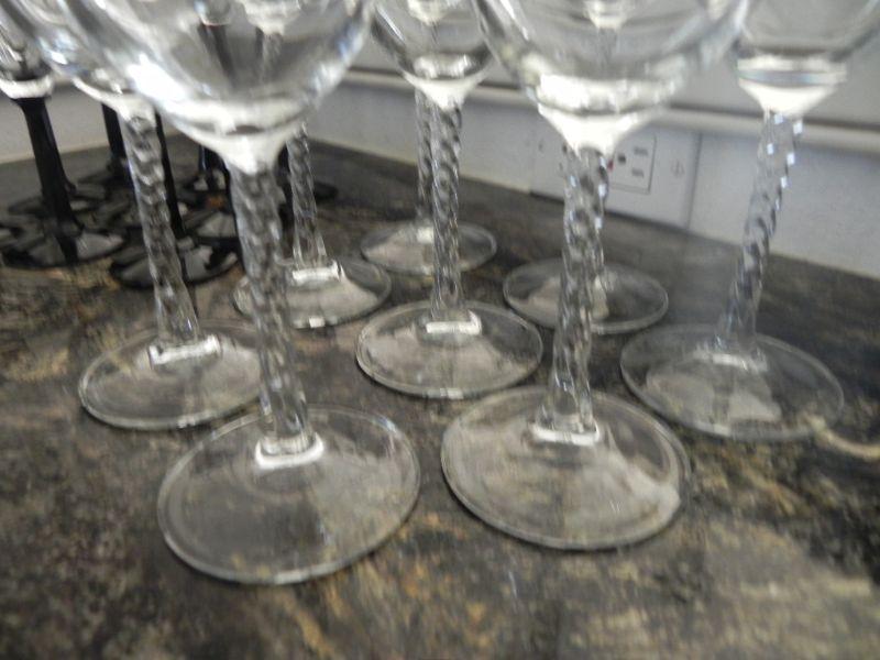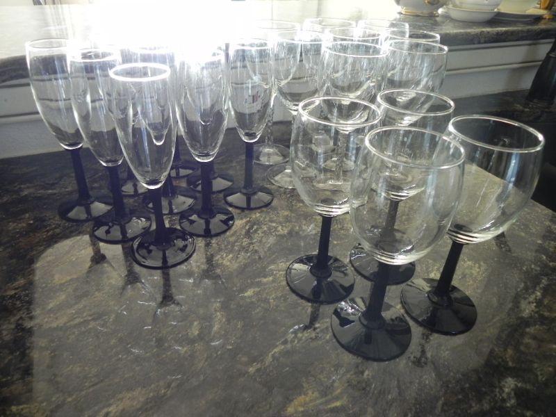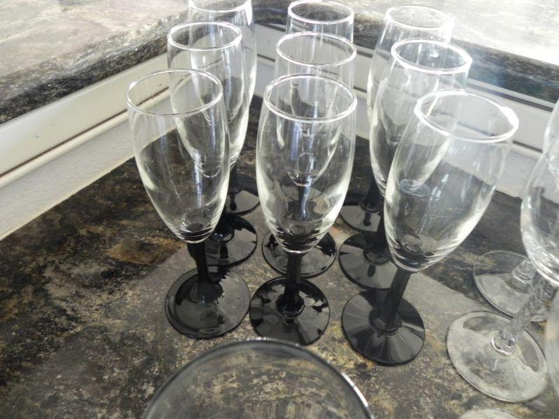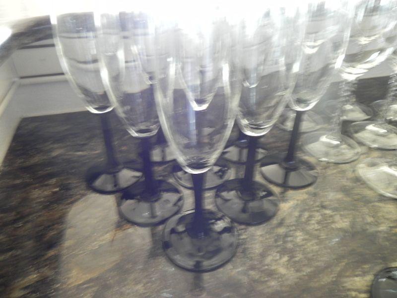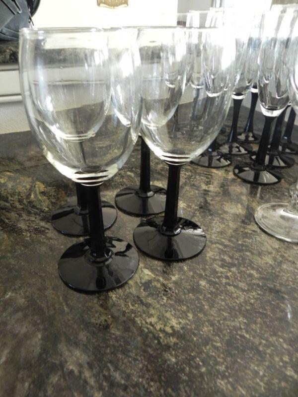 BLACK STEMMED AND TWISTED GLASS STEM ON ONE SET. PUNCH BOWL WITH CUPS AND HAVE FLOWER DESIGN