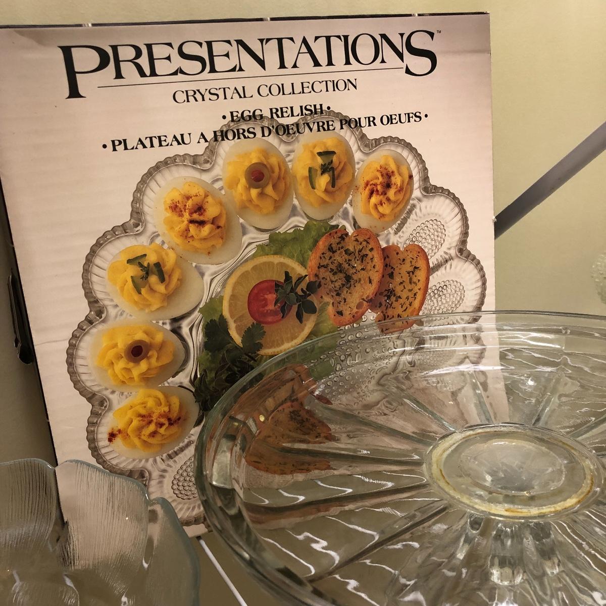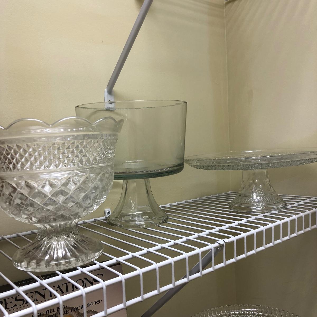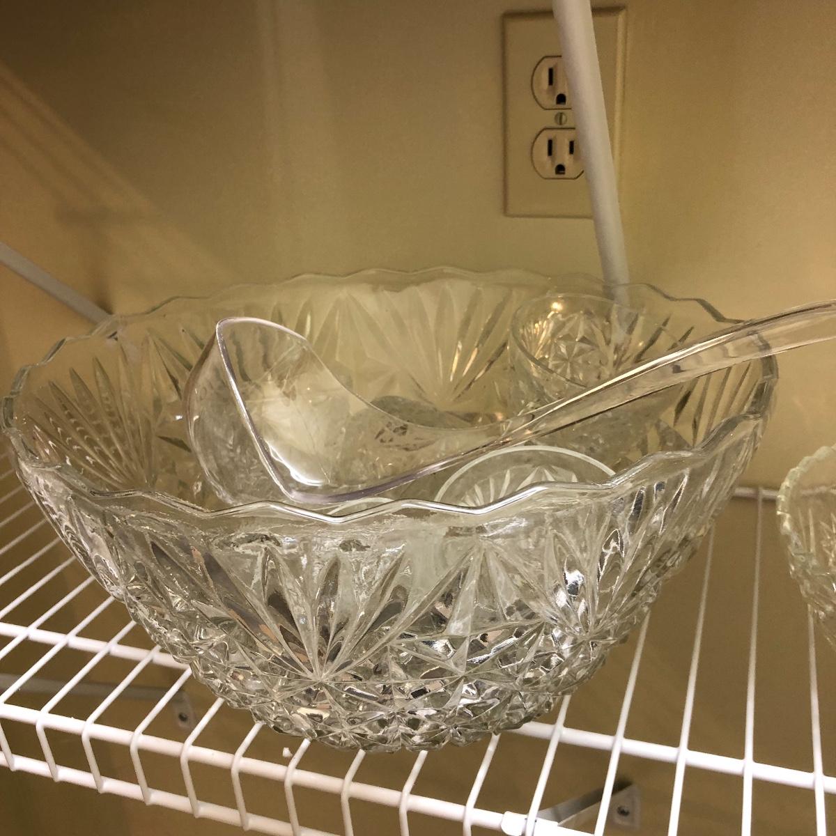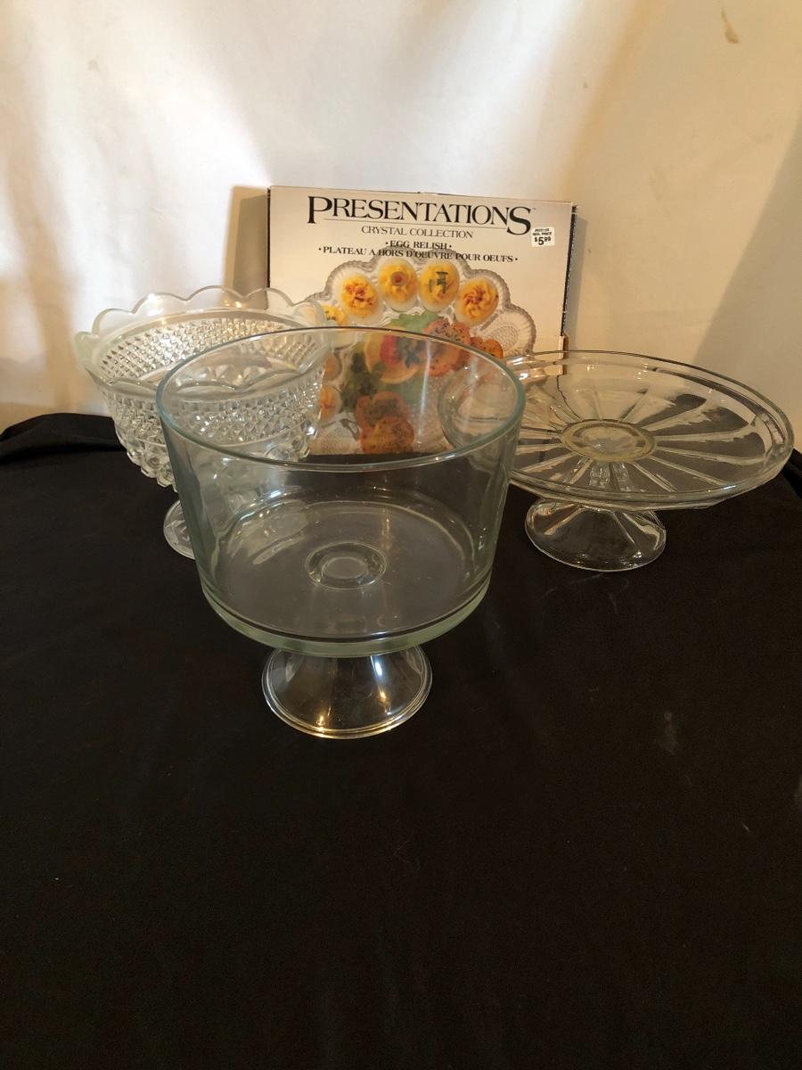 Entertain in style with this lot! It includes three cake plates, two trifle bowls, deviled egg plate, punch bowl with ladle and cups, and two serving bowls. All Items are glass except for the punch bowl ladle. There are eight cups accompanying the punch bowl. Local pick up only.