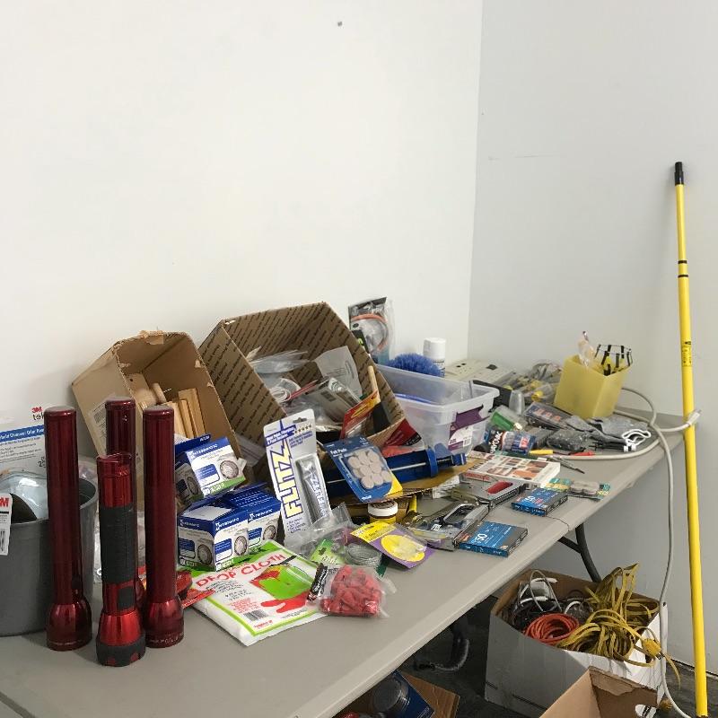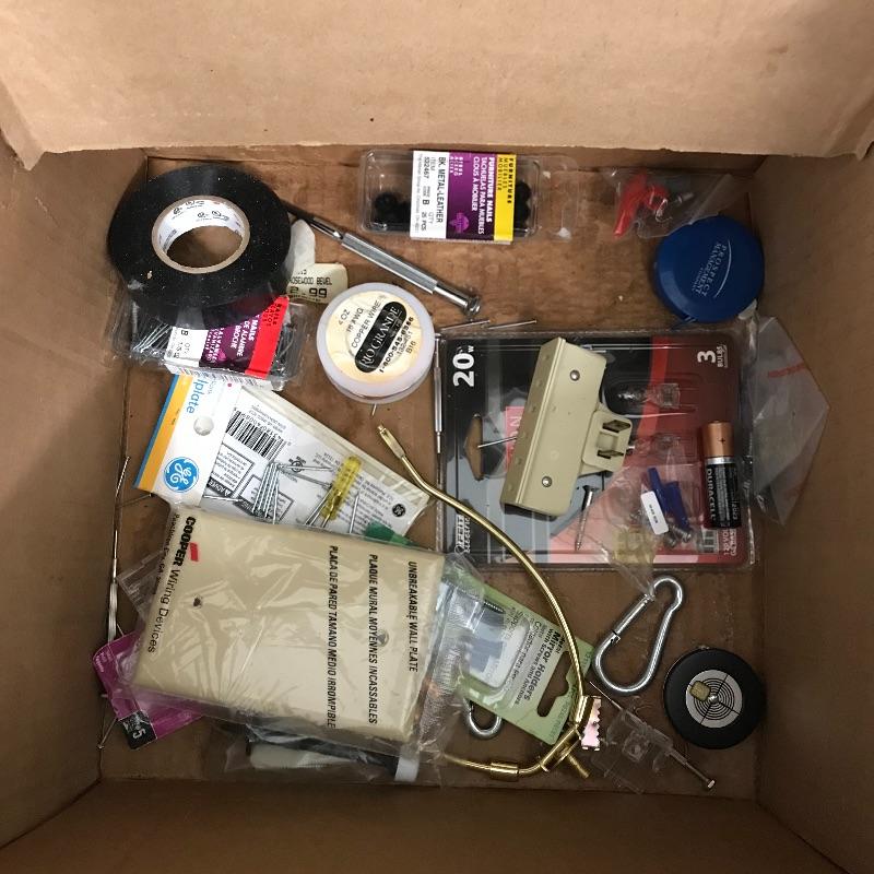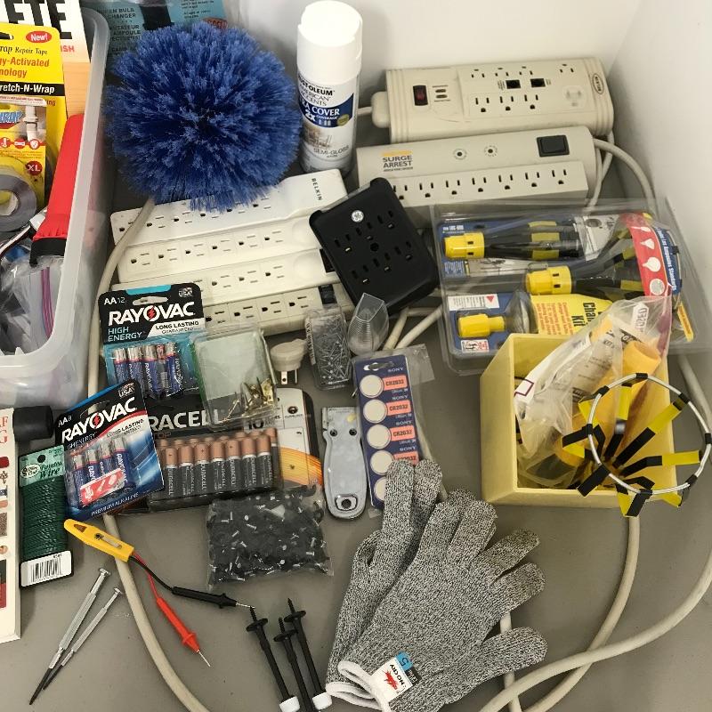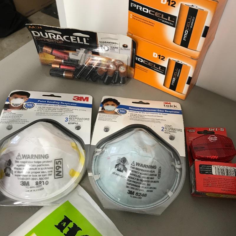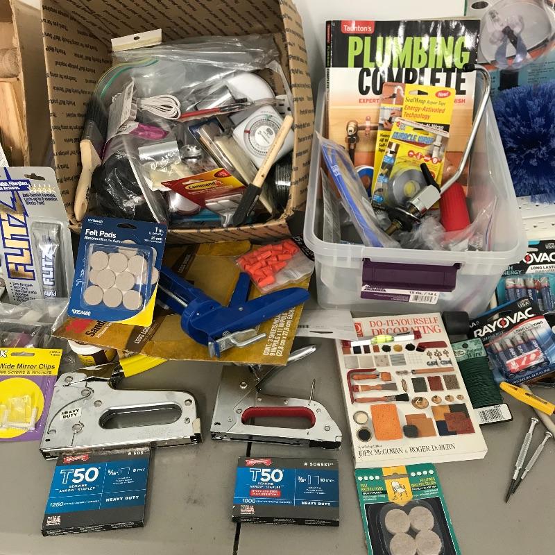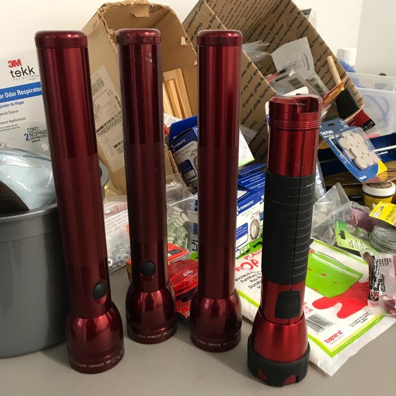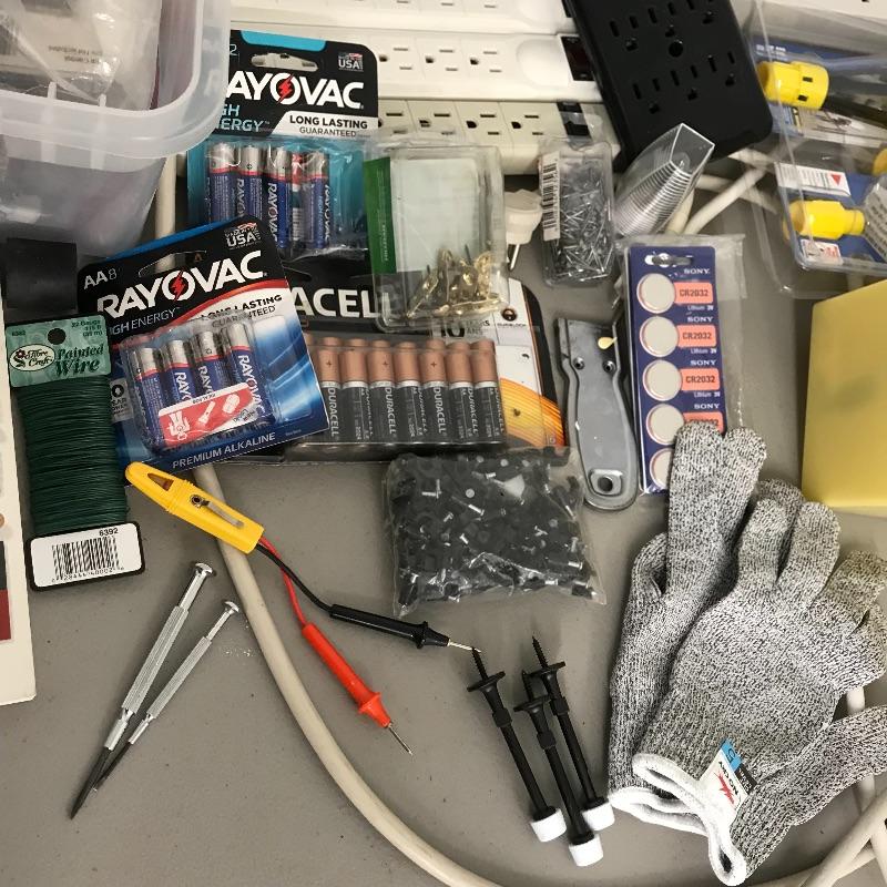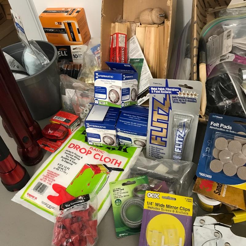 Huge lot of necessary household supplies! Maglites, furniture coasters, plumbing parts, surge protectors to name a few. Lot also includes AA, DD and lithium batteries, lightbulb changers and more! See photos. No shipping.