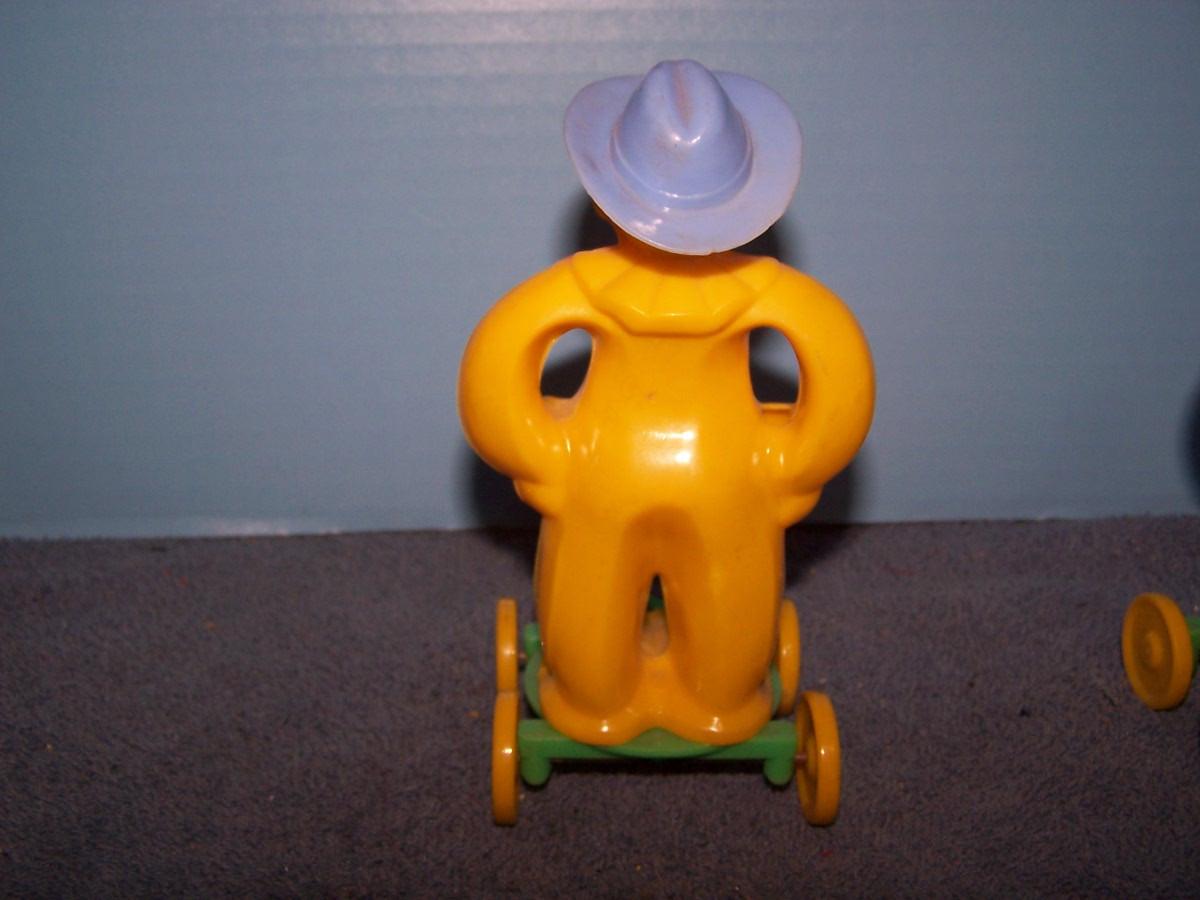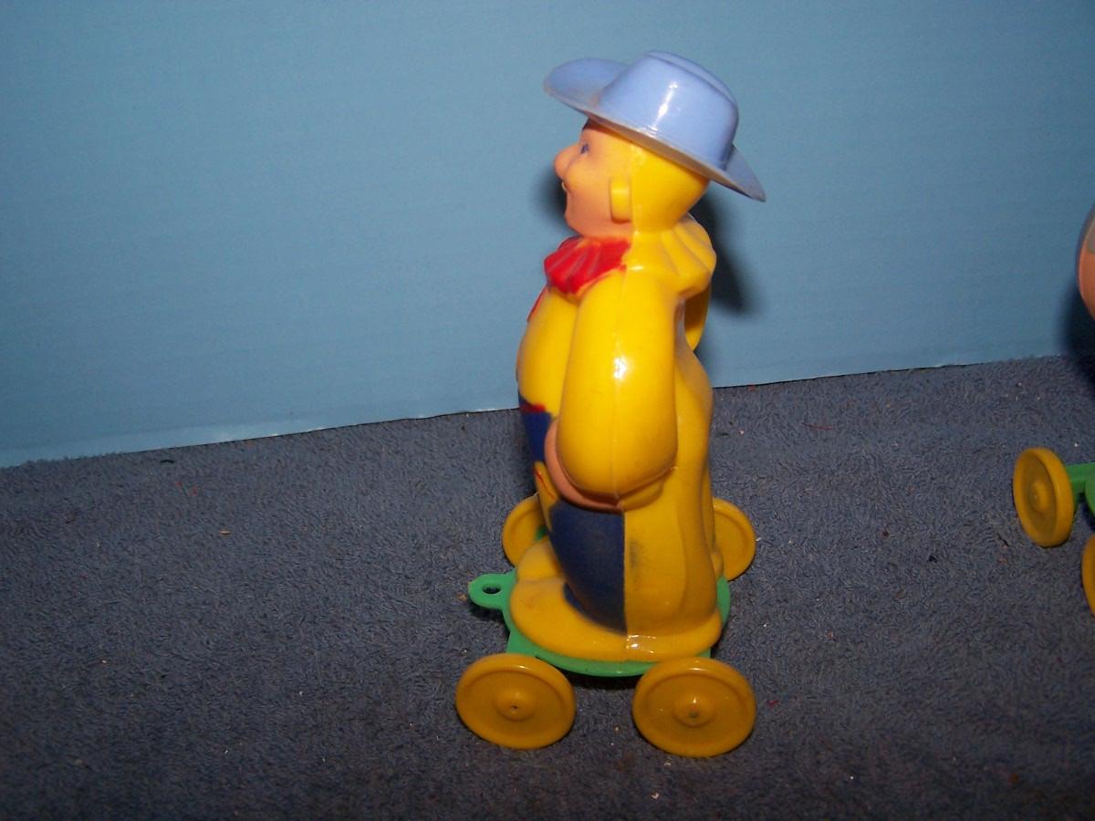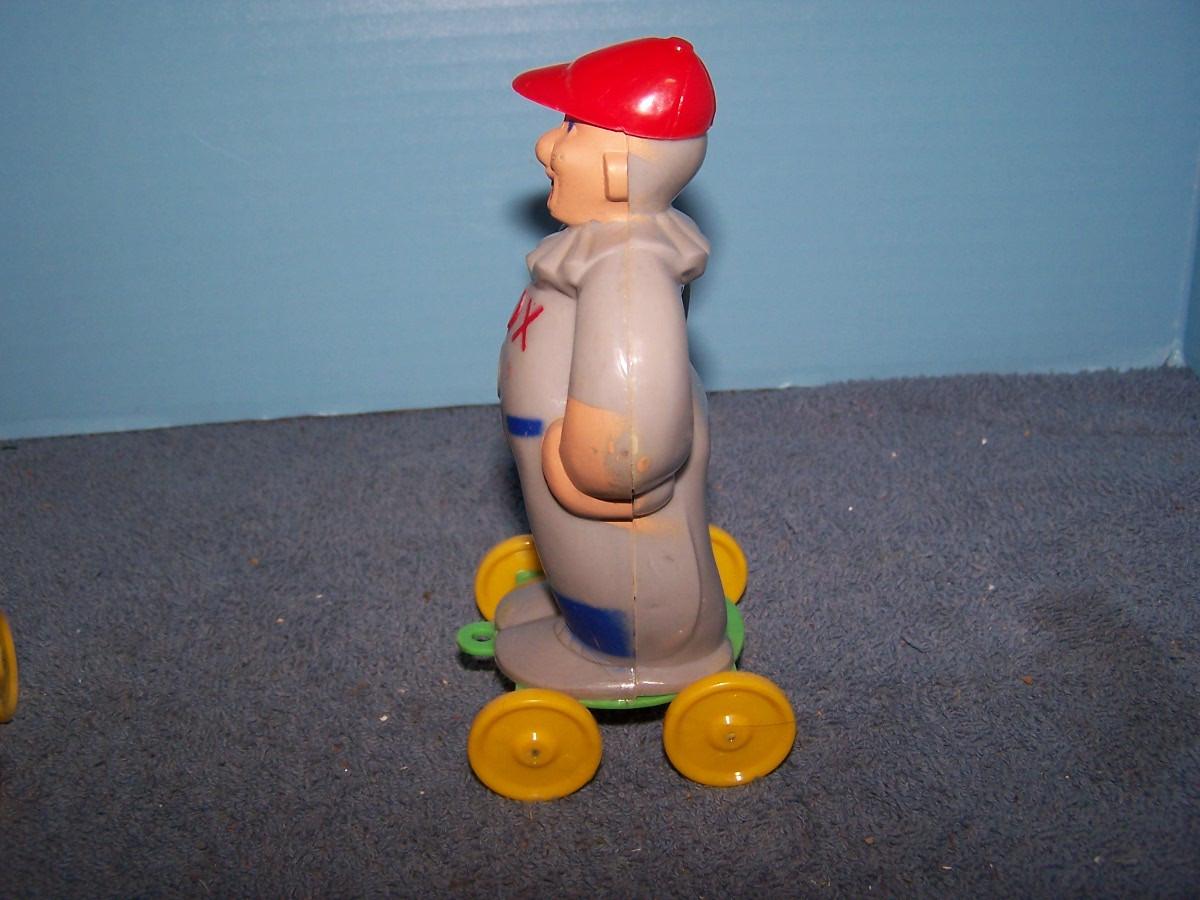 THESE ARE WONDERFUL VINTAGE HARD PLASTIC PULL TOYS!!! MARKED-ROSBRO.. 5 7/8'' TALL.. SLIGHT WEAR.. ALL TOYS HAVE BEEN PLAYED WITH..