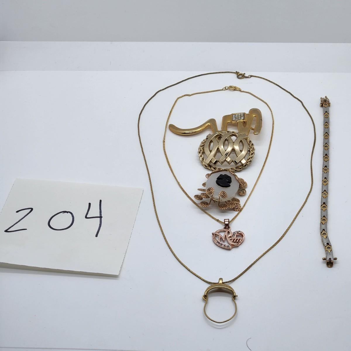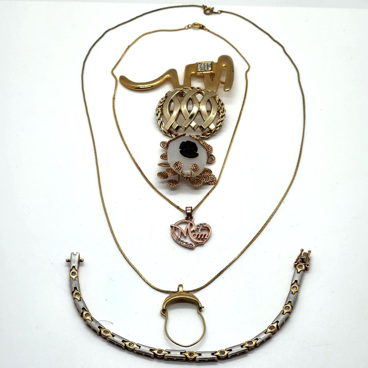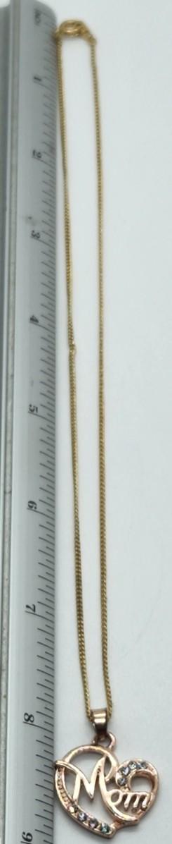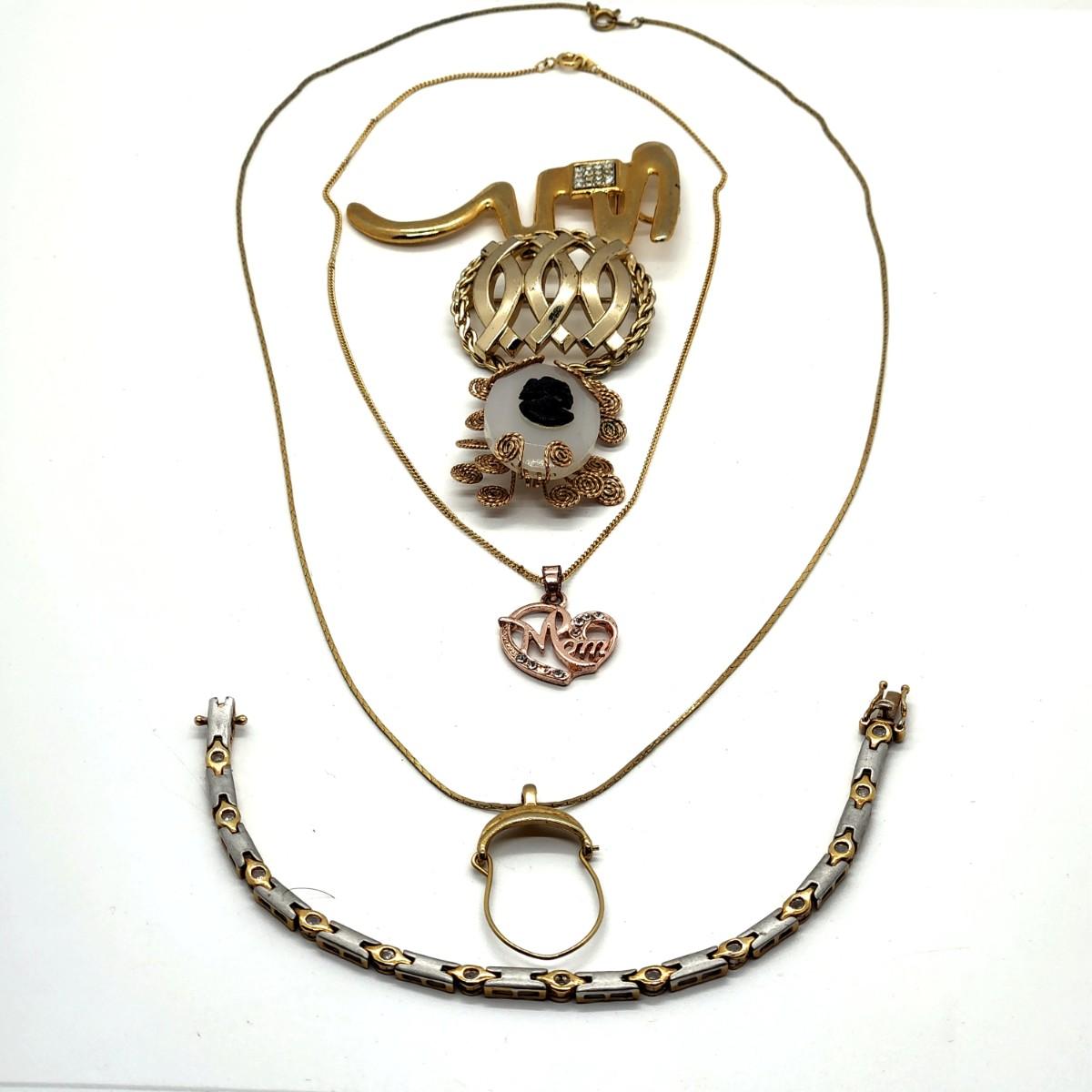 This collection offers two pendant necklaces, one has a rose gold-tone "Mom" pendant w/rhinestones, three gold-tone pins and a two-tone tennis bracelet w/rhinestones. Conditions of items vary. Please see all pictures as they are the best representation of the items. The pictures show condition, measurements if taken, and what is included in the lot. Due to the large amount that we photograph and the time frame, we are not always able to take measurements. All items unless noted, are pre-owned and have been used. If you purchased furniture, you must bring help. We do not allow one person to carry large furniture out on their own. Bring help, tools and a truck for the safety of our client’s homes, and your personal safety. Any damages that result to the property including walls, and floors due to moving of the furniture will be charged to the buyer. Company policy. Thank you.