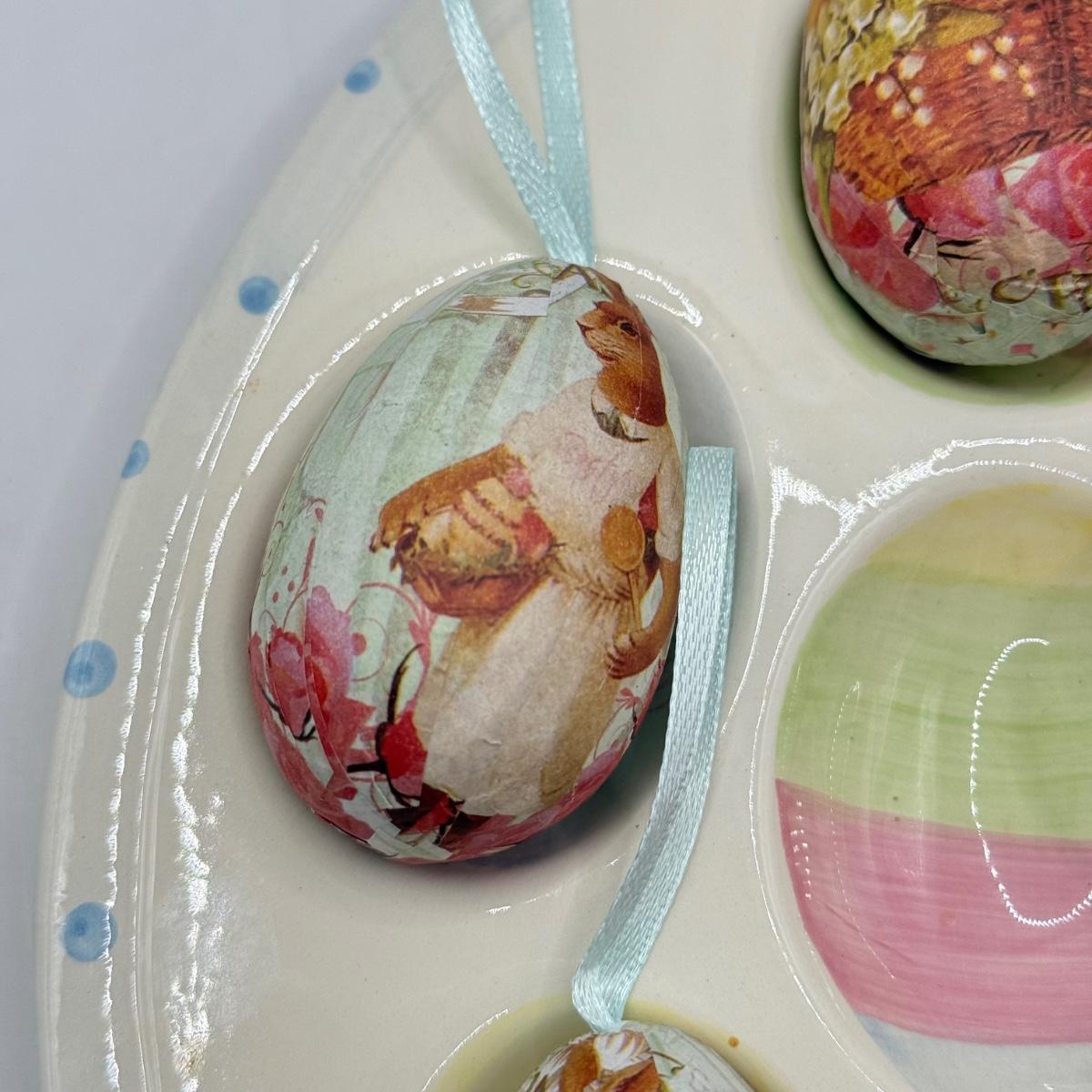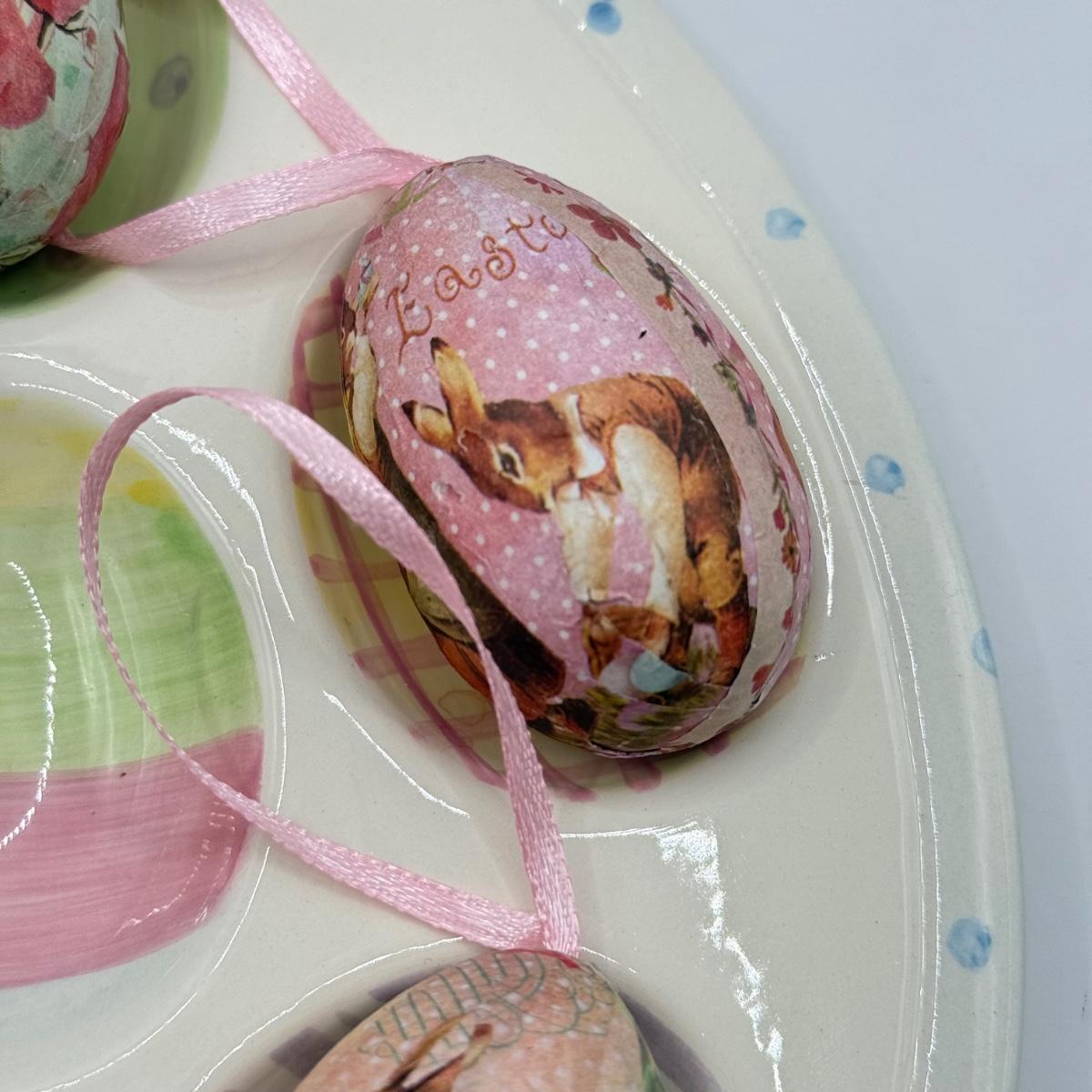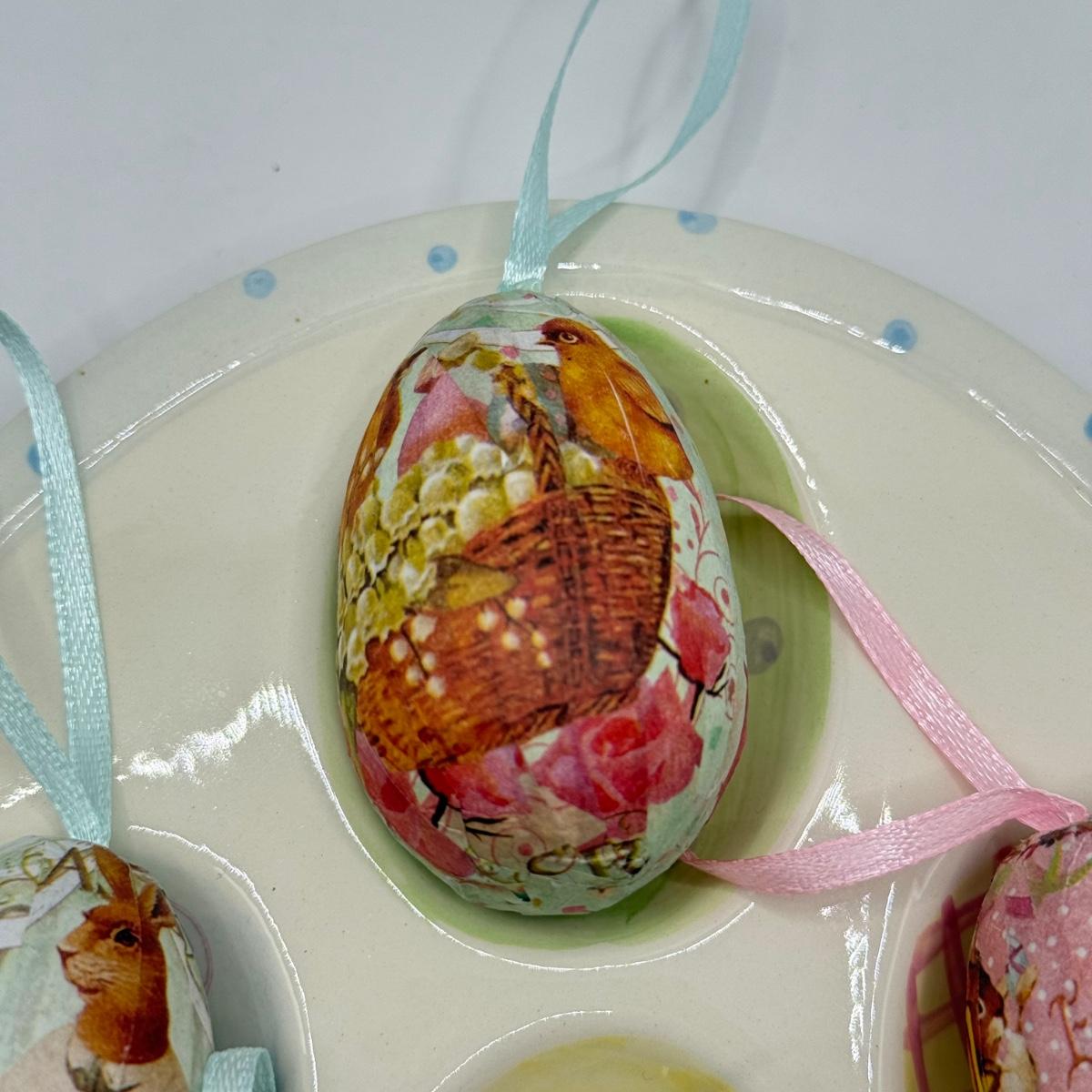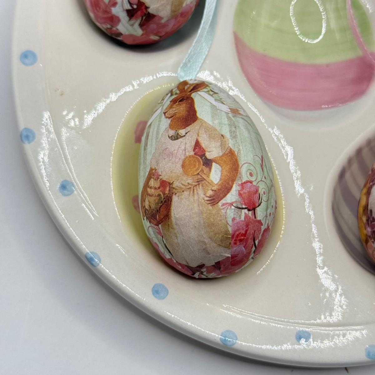 LOT 204K: Colorful Egg Dish w/ Pretty Paper Mache Eggs