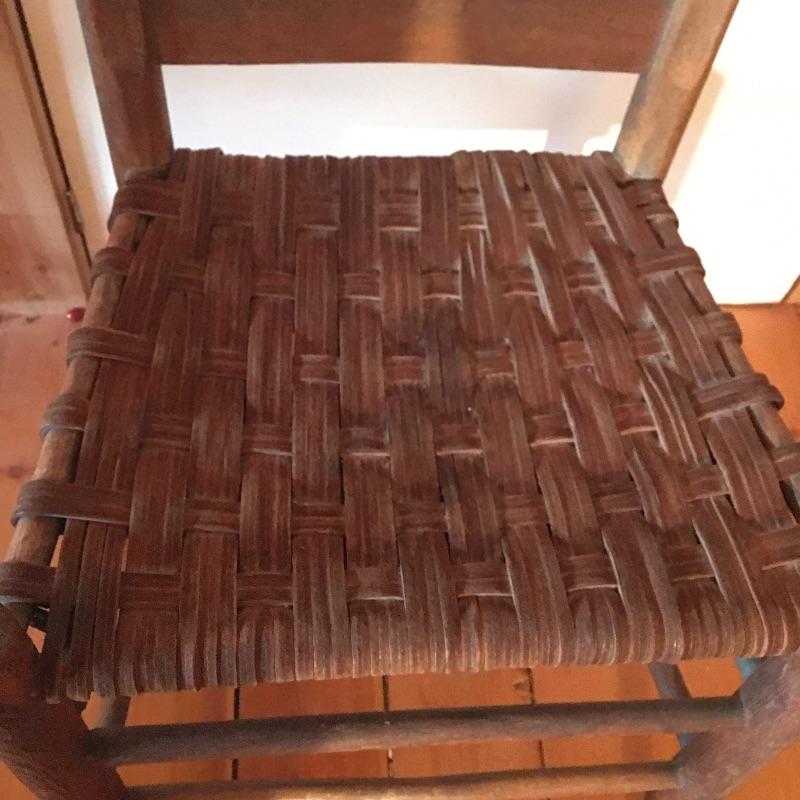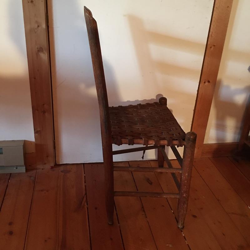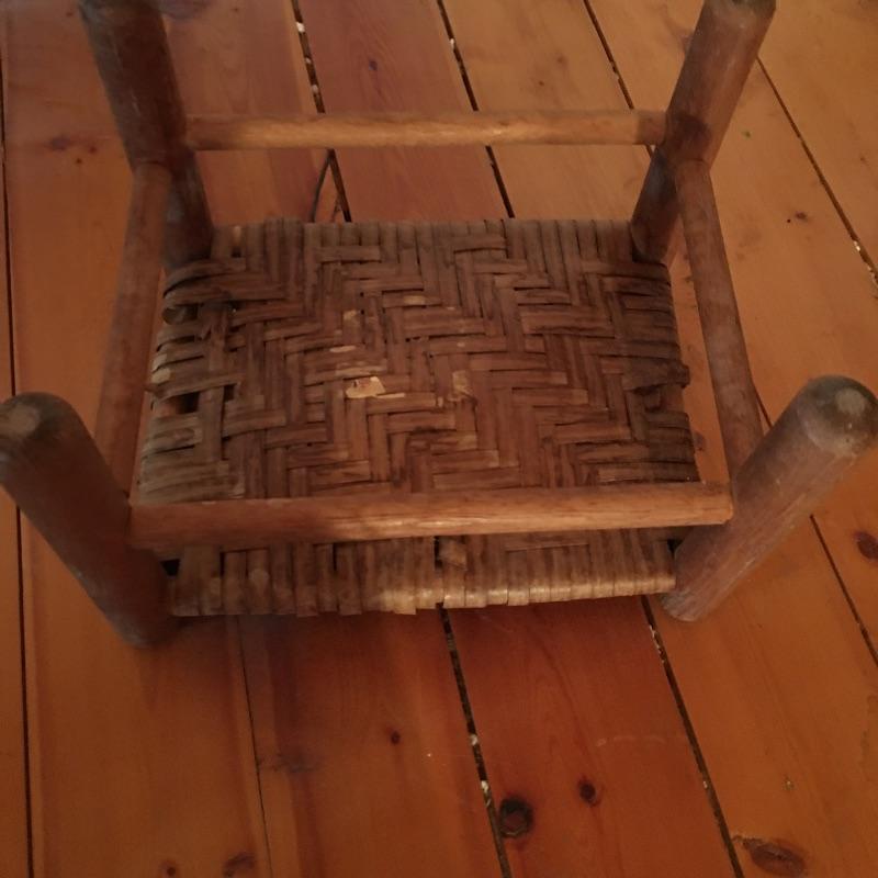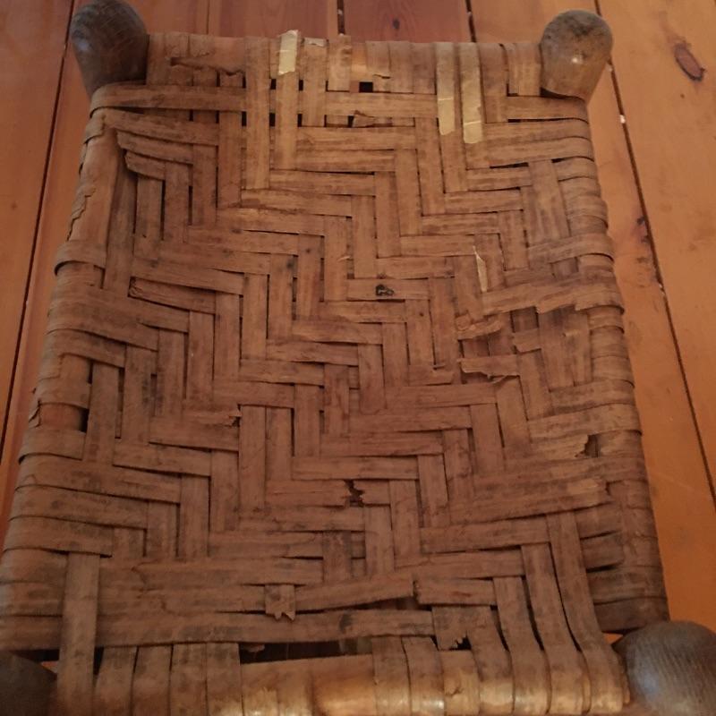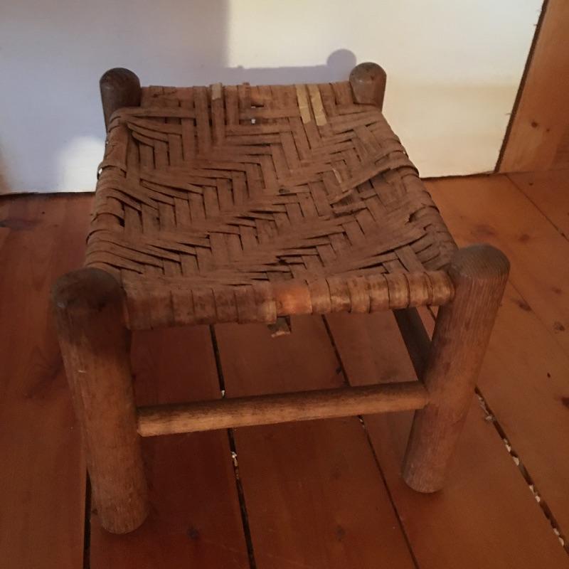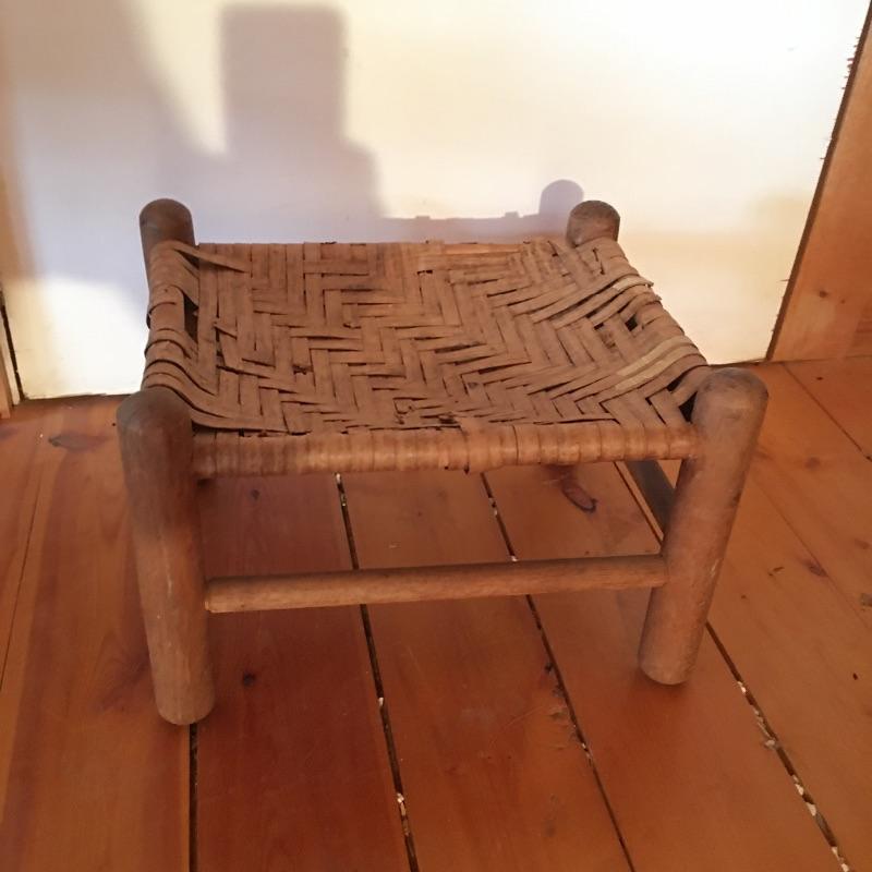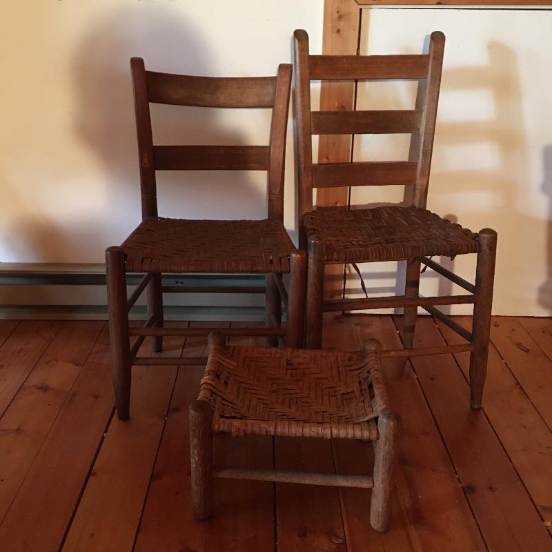 This lot includes two woven wooden chairs with one being woven leather. Second chair appears to be cane or reed as is the stool. Stool has breaks in top, see pictures. Tallest chair measures 13” x 17.5” x 33.5” with a 16” seat height.