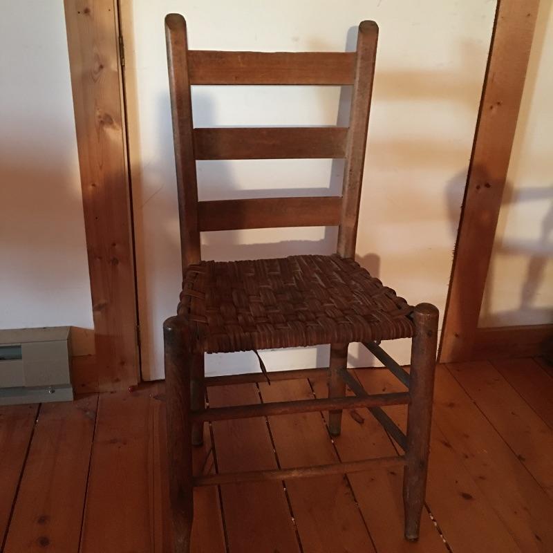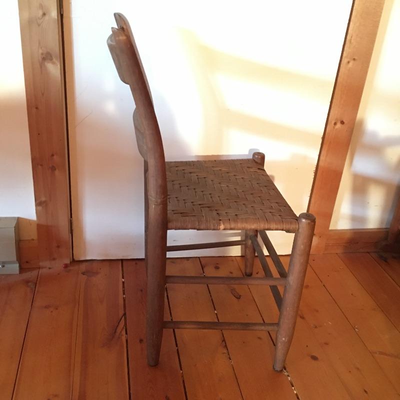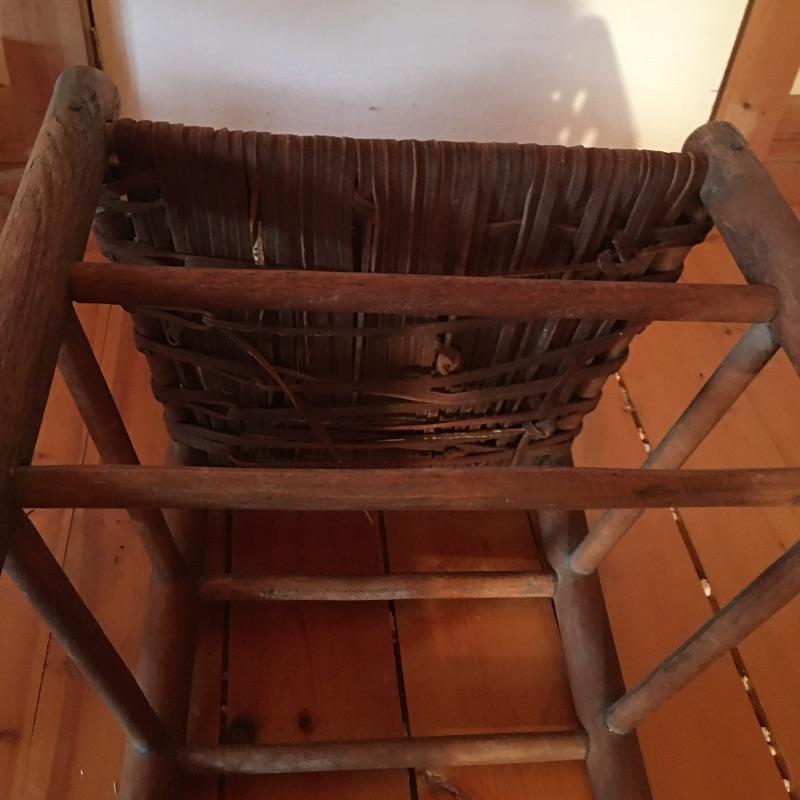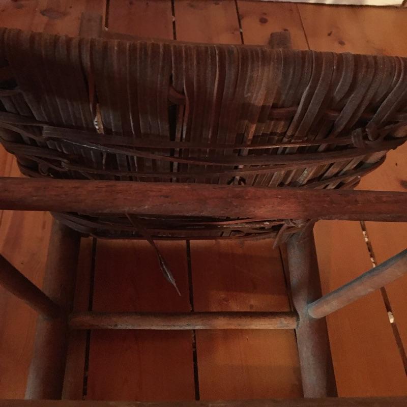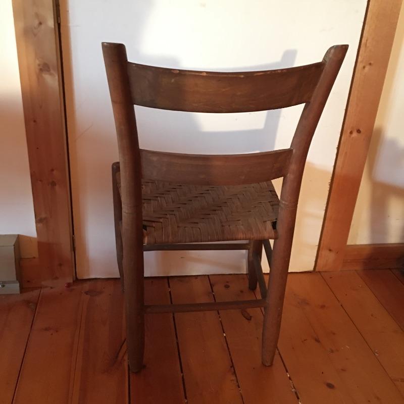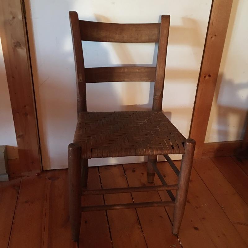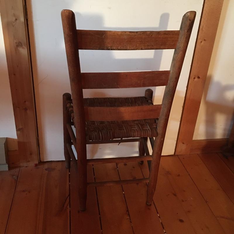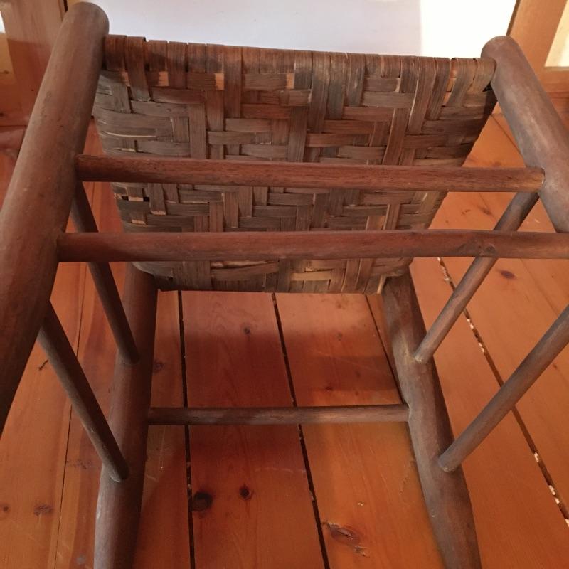 This lot includes two woven wooden chairs with one being woven leather. Second chair appears to be cane or reed as is the stool. Stool has breaks in top, see pictures. Tallest chair measures 13” x 17.5” x 33.5” with a 16” seat height.