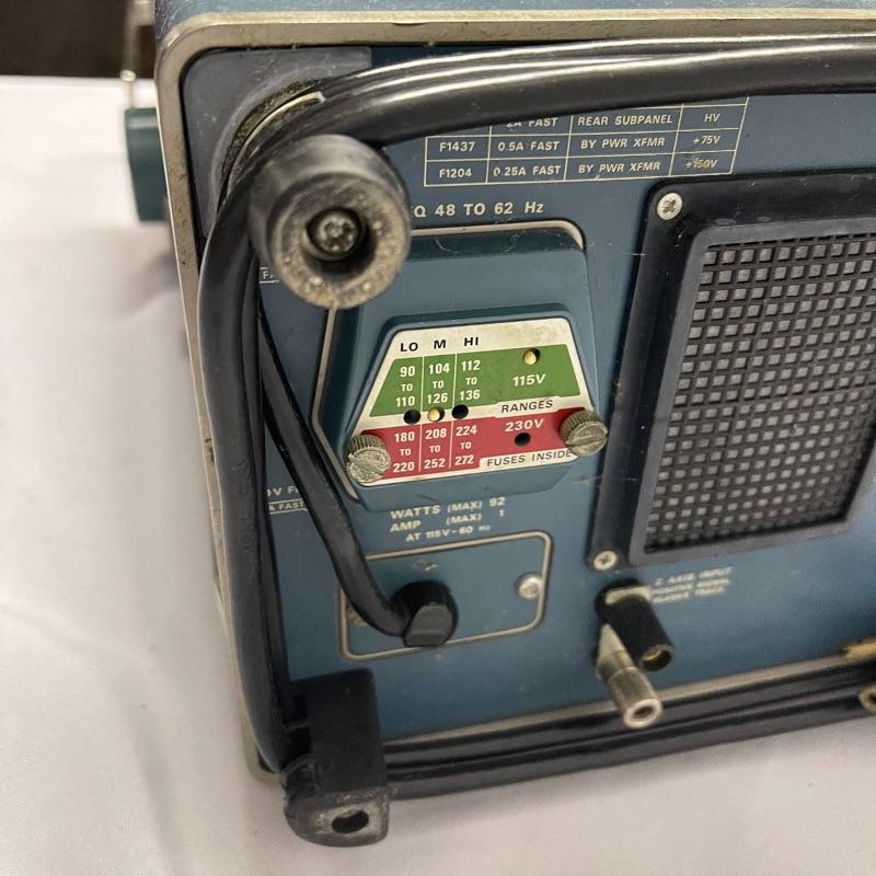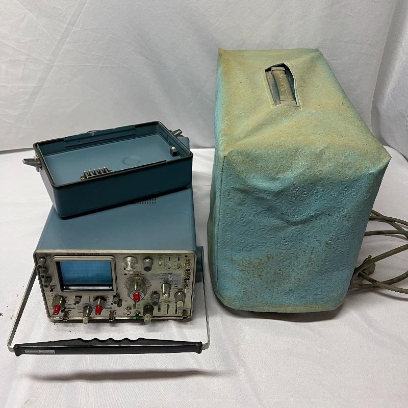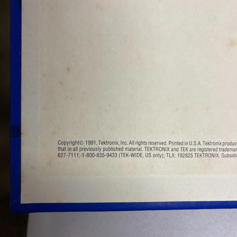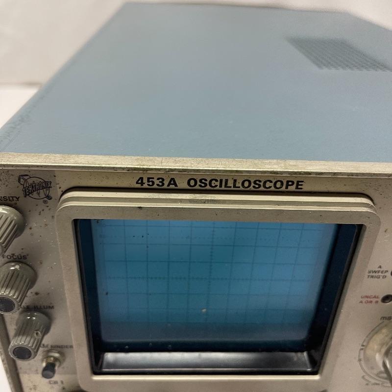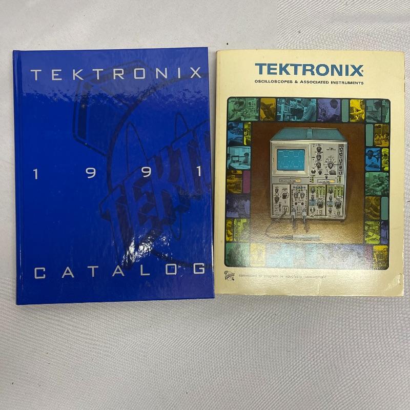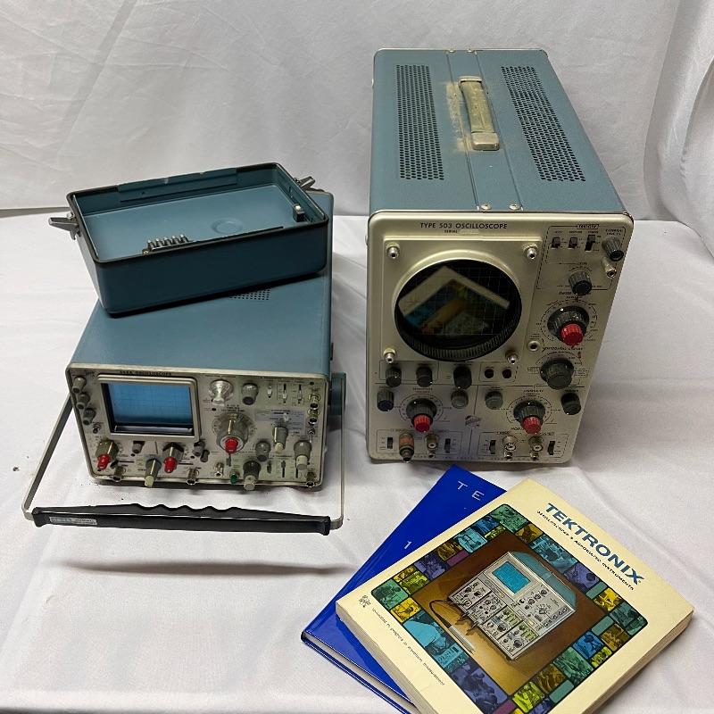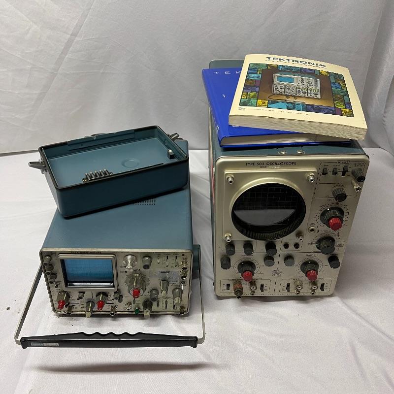 Two Tektronix oscilloscopes and manuals. The smaller unit has a model number of 453A and has a cover over the control panel that clasps in place on either side. The larger unit’s model number is 503 and it has a cover with a slit for the handle, as well as a spare cord. The two books are “Tektronix: Oscilloscopes & Associated Instruments” and “Tektronix 1991 Catalog.” Both unit’s screens light up with grids when plugged in.