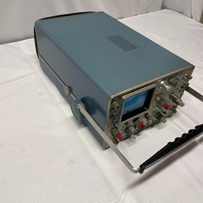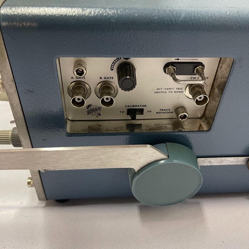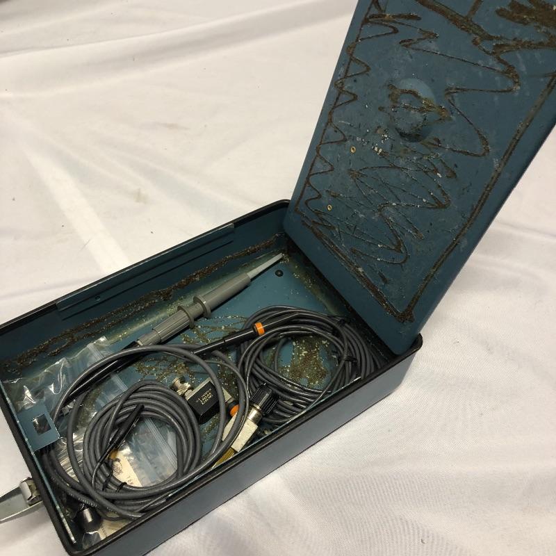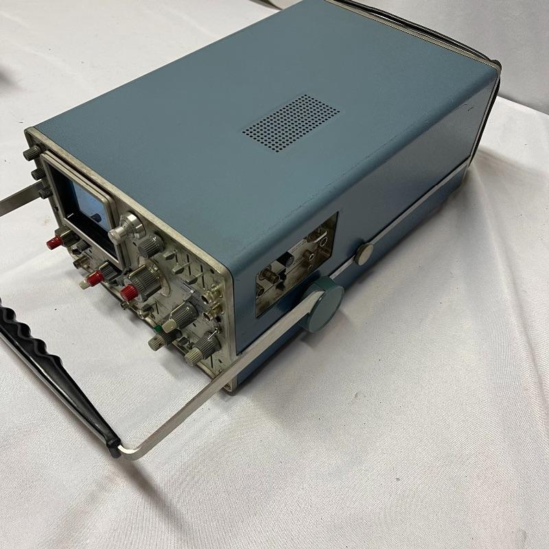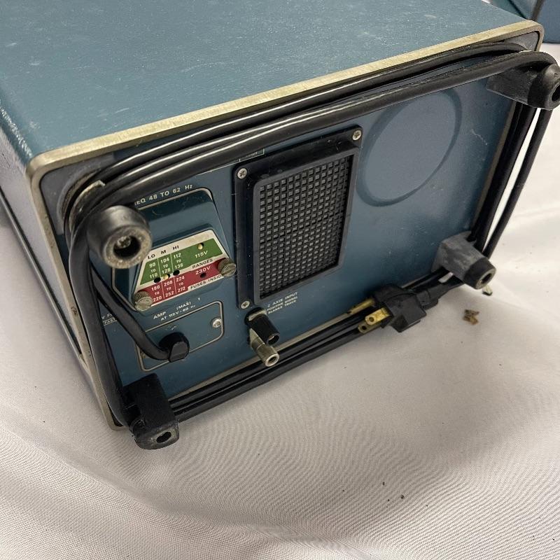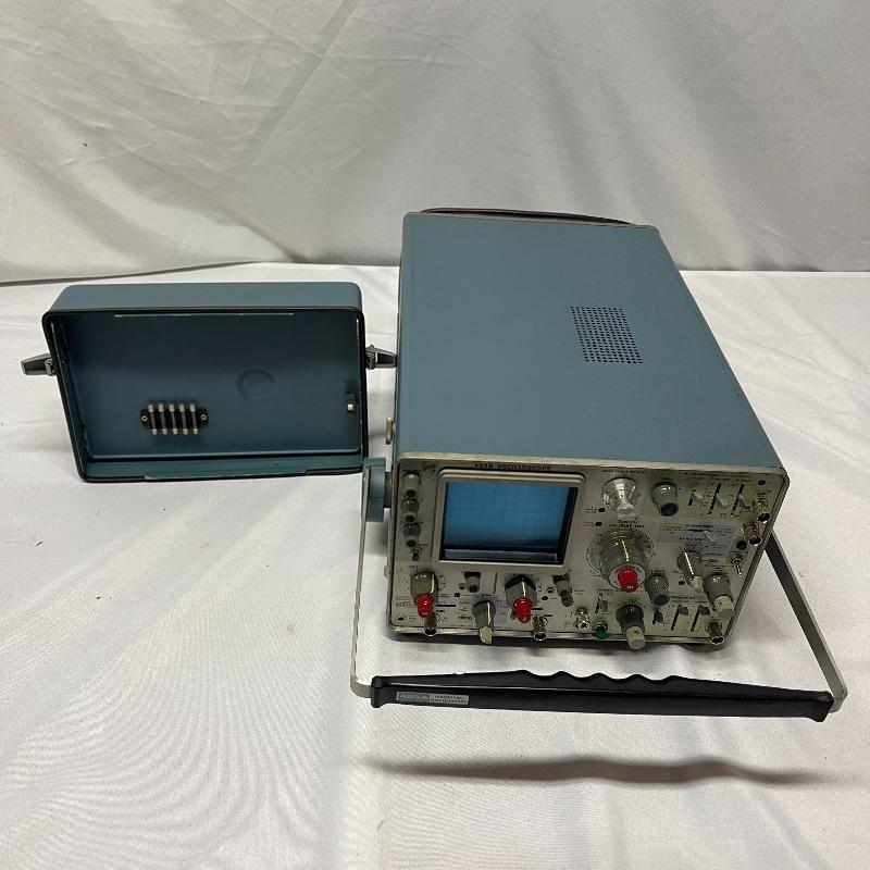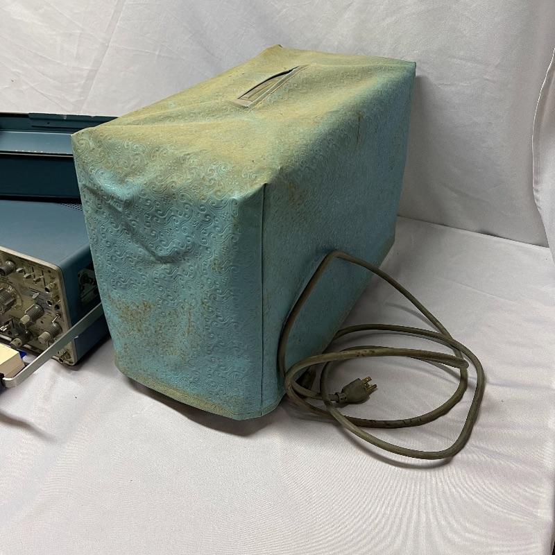 Two Tektronix oscilloscopes and manuals. The smaller unit has a model number of 453A and has a cover over the control panel that clasps in place on either side. The larger unit’s model number is 503 and it has a cover with a slit for the handle, as well as a spare cord. The two books are “Tektronix: Oscilloscopes & Associated Instruments” and “Tektronix 1991 Catalog.” Both unit’s screens light up with grids when plugged in.