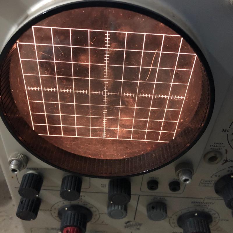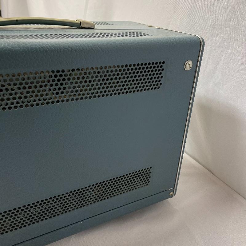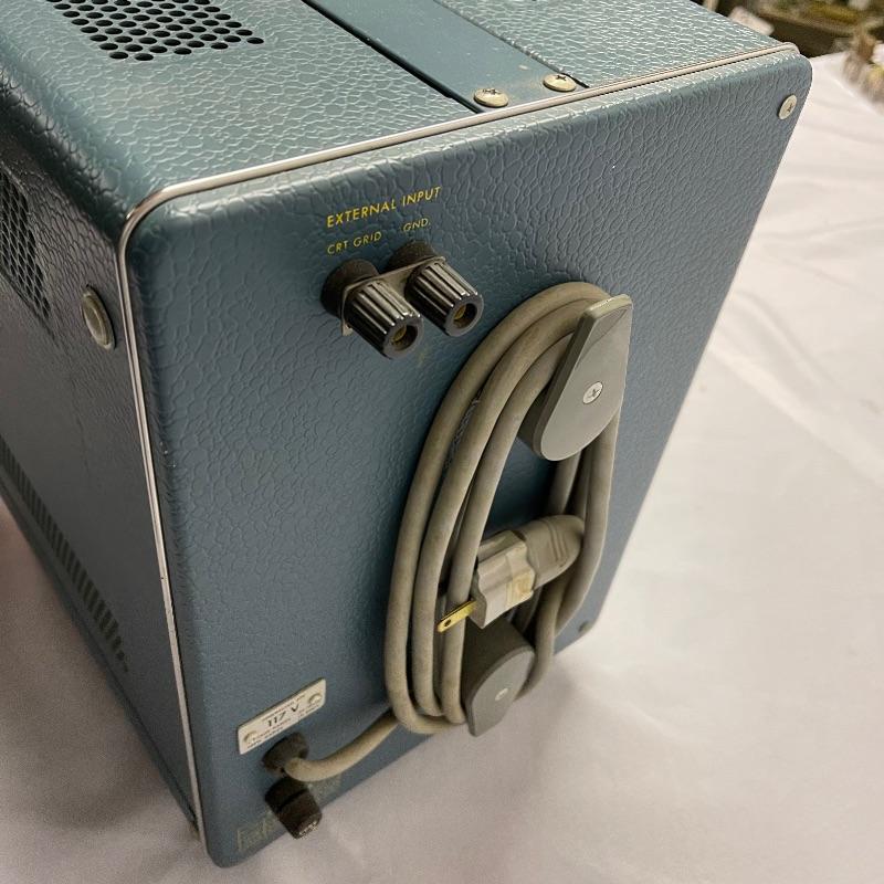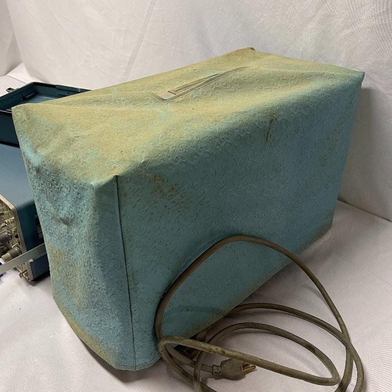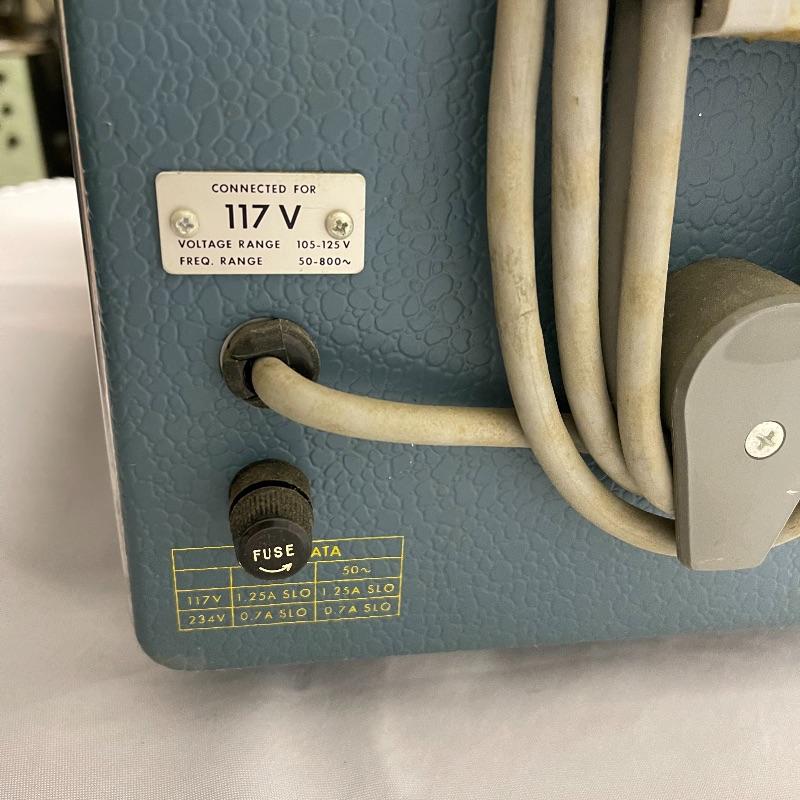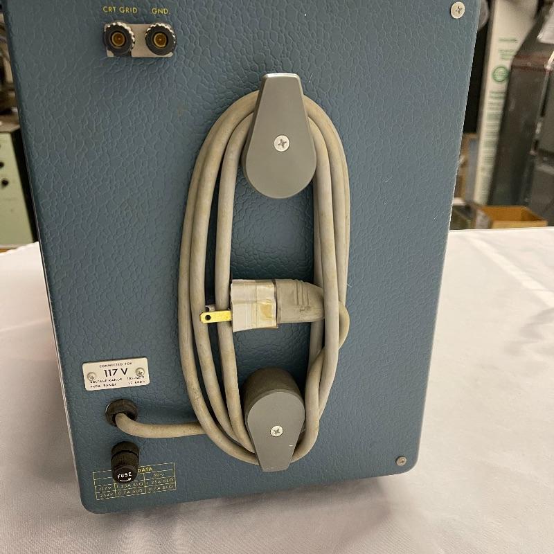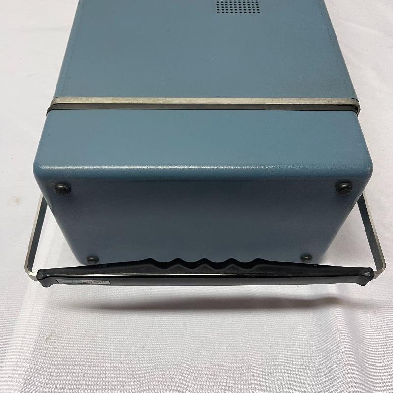 Two Tektronix oscilloscopes and manuals. The smaller unit has a model number of 453A and has a cover over the control panel that clasps in place on either side. The larger unit’s model number is 503 and it has a cover with a slit for the handle, as well as a spare cord. The two books are “Tektronix: Oscilloscopes & Associated Instruments” and “Tektronix 1991 Catalog.” Both unit’s screens light up with grids when plugged in.