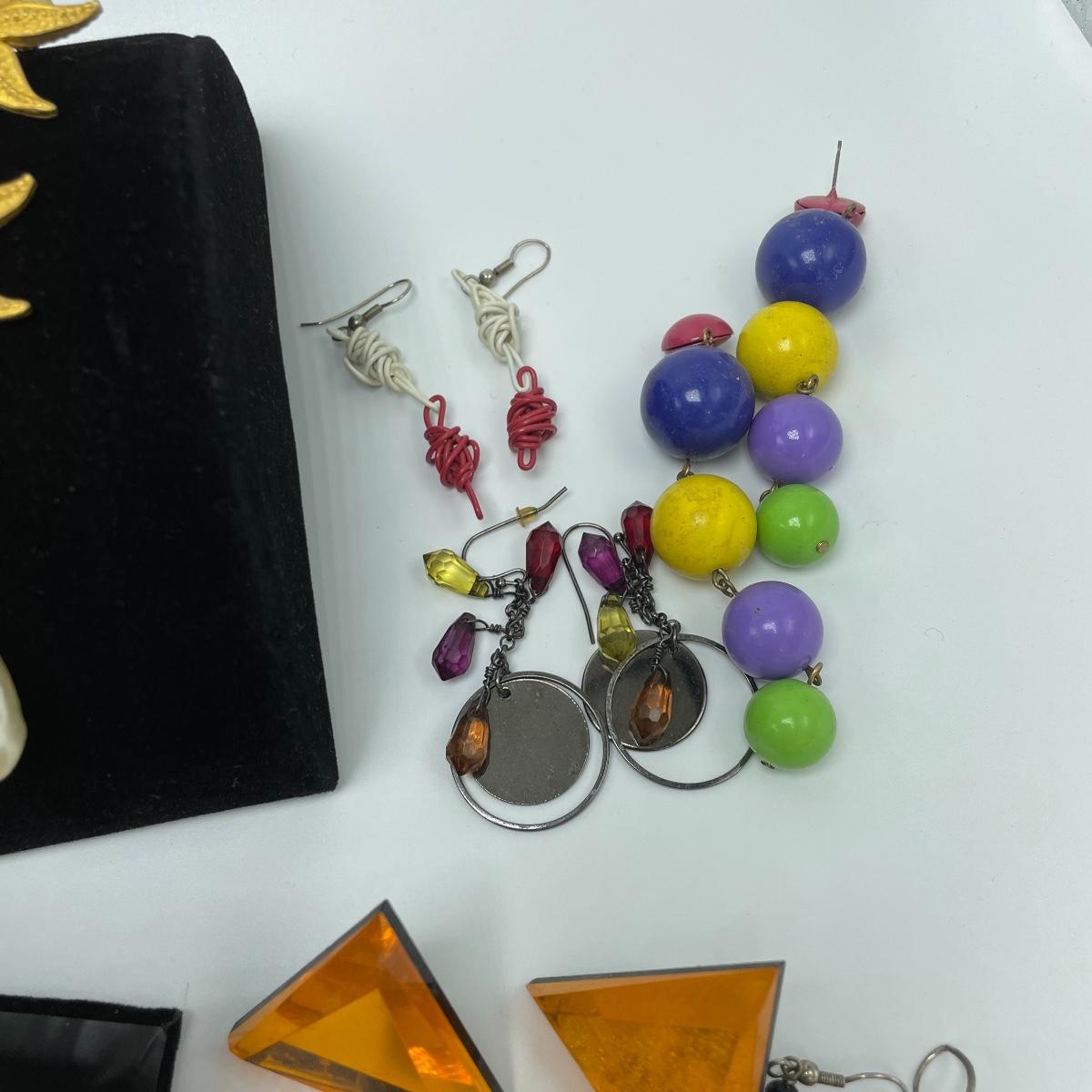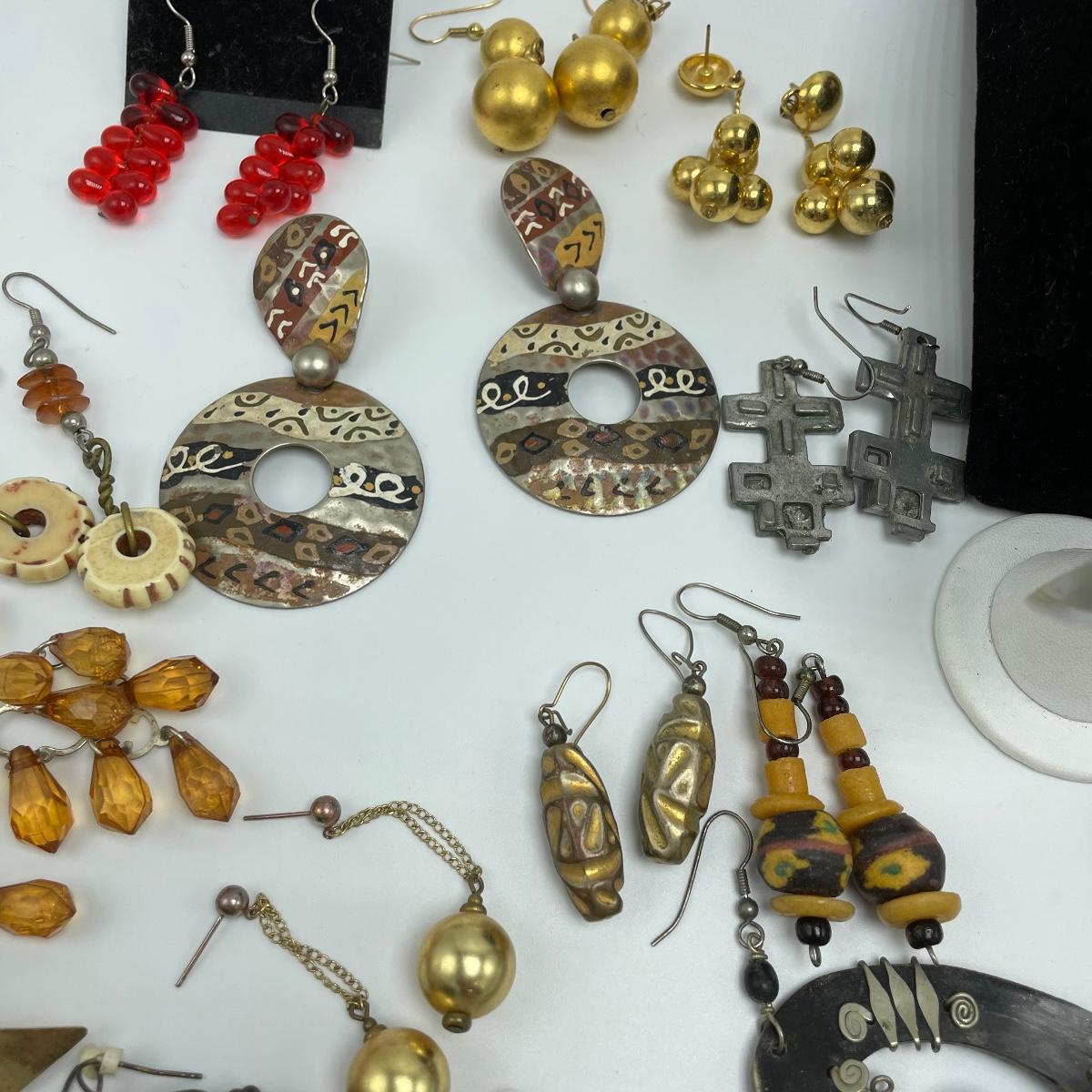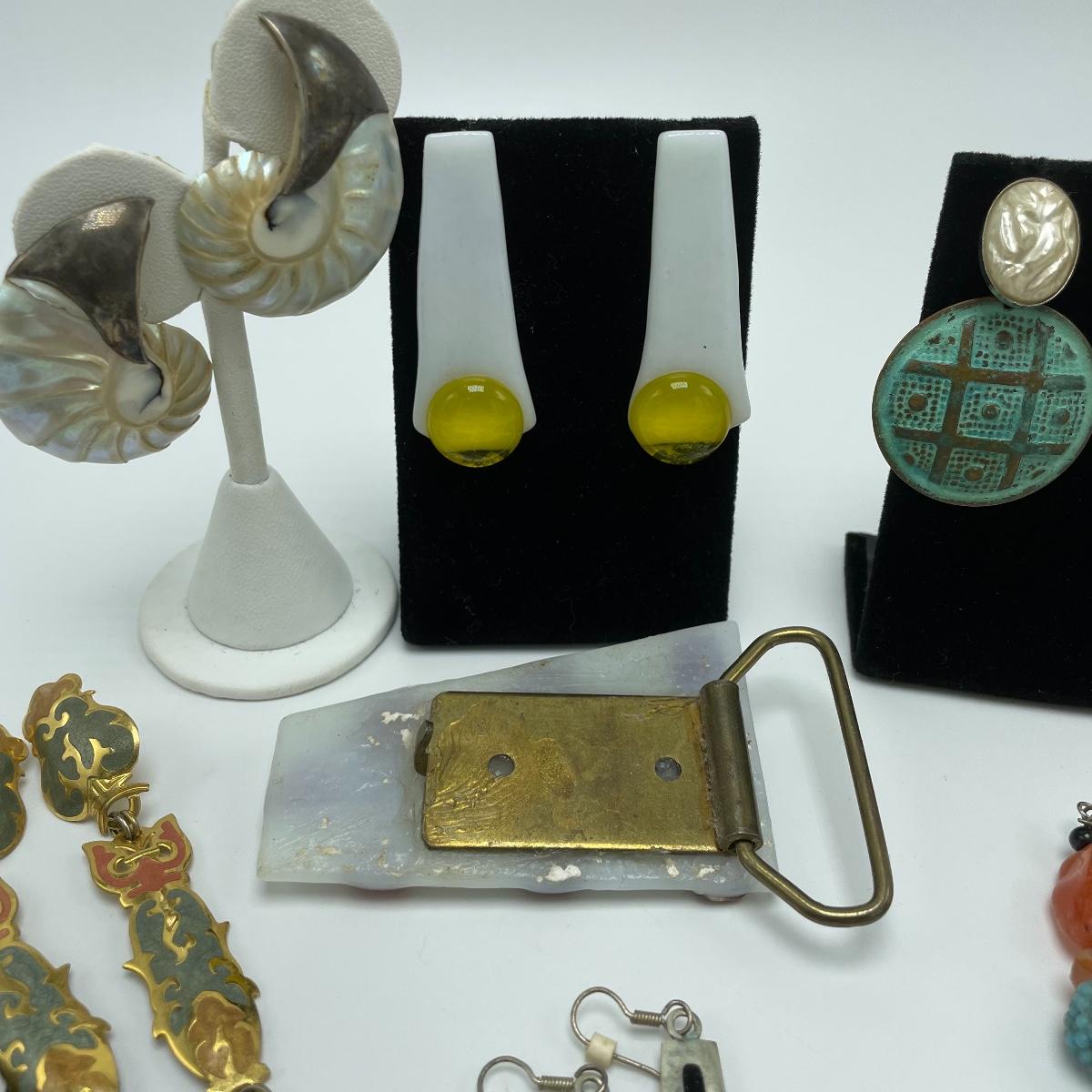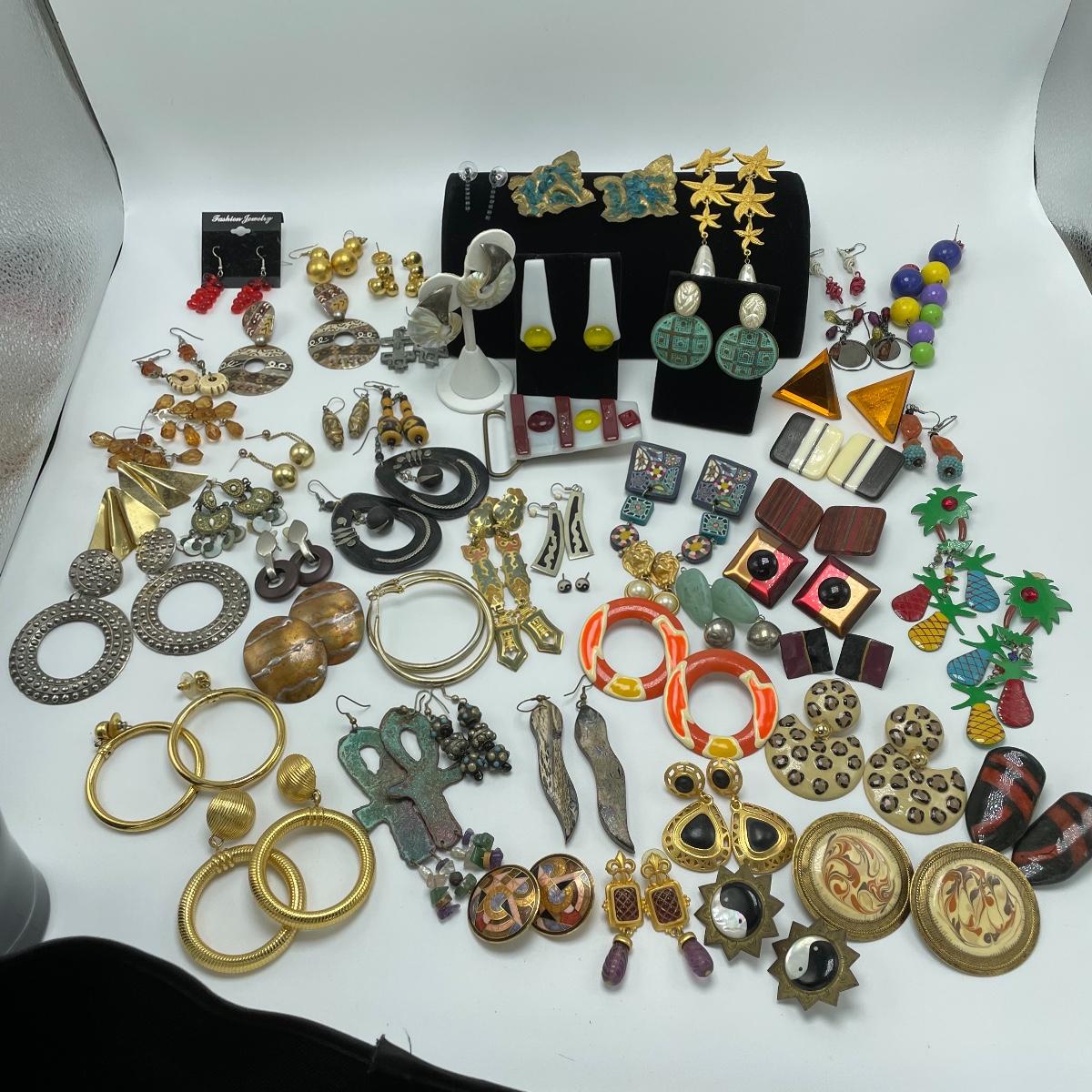 Get your bold on here! Lot features several pairs of bright and chic earrings for pierced ears. An awesome glass set includes a matching belt buckle. Earrings are made from ceramic, metals, shells, cloth and more! See images and happy bidding! Shipping available.