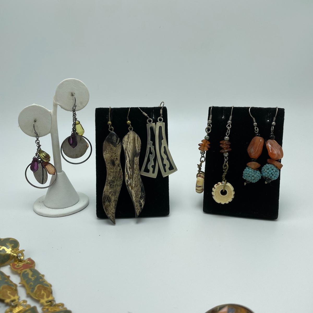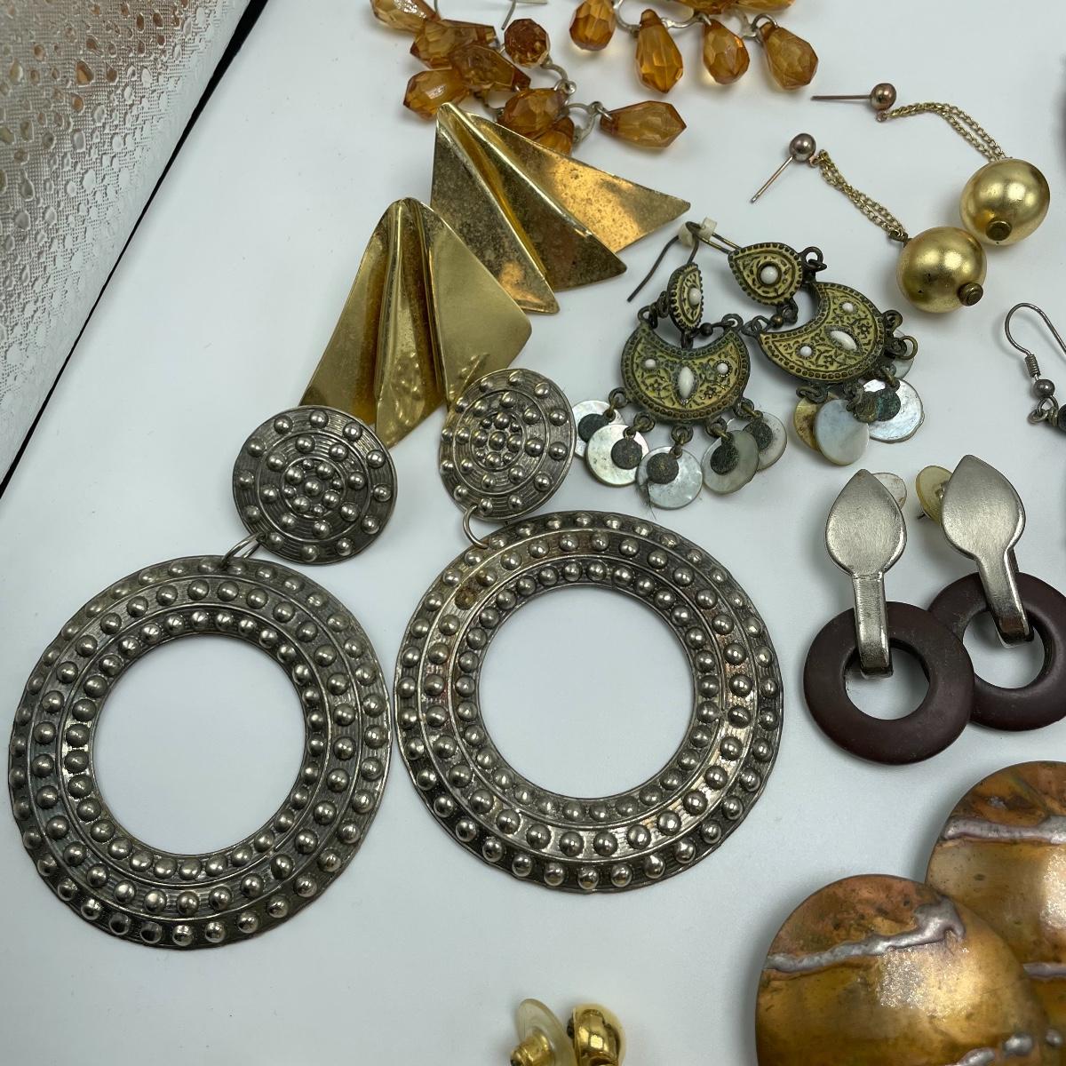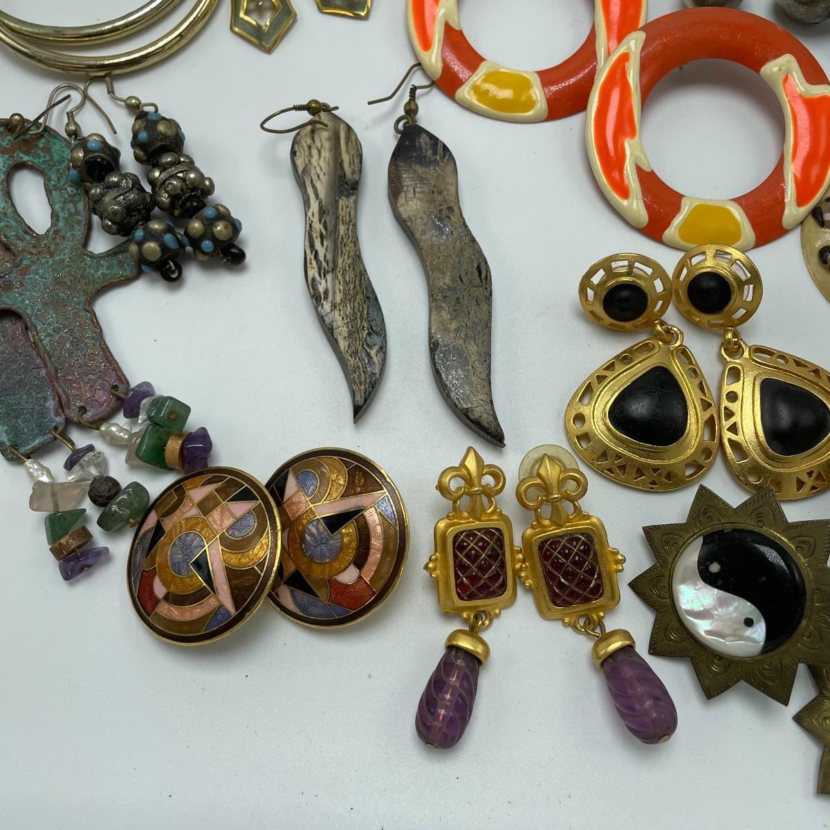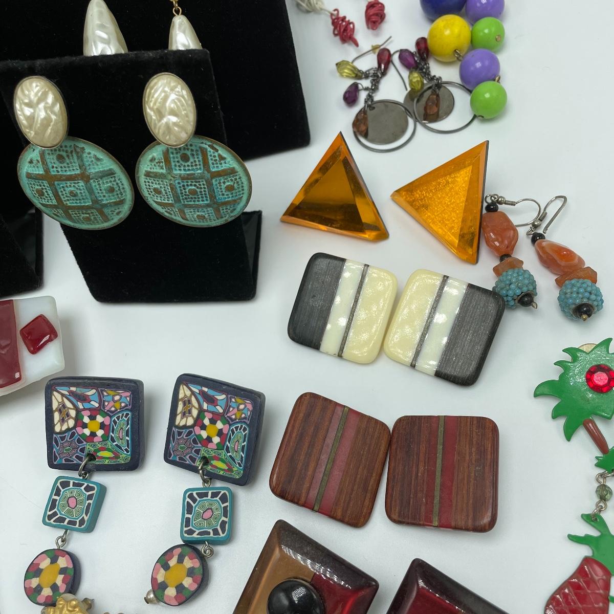 Get your bold on here! Lot features several pairs of bright and chic earrings for pierced ears. An awesome glass set includes a matching belt buckle. Earrings are made from ceramic, metals, shells, cloth and more! See images and happy bidding! Shipping available.