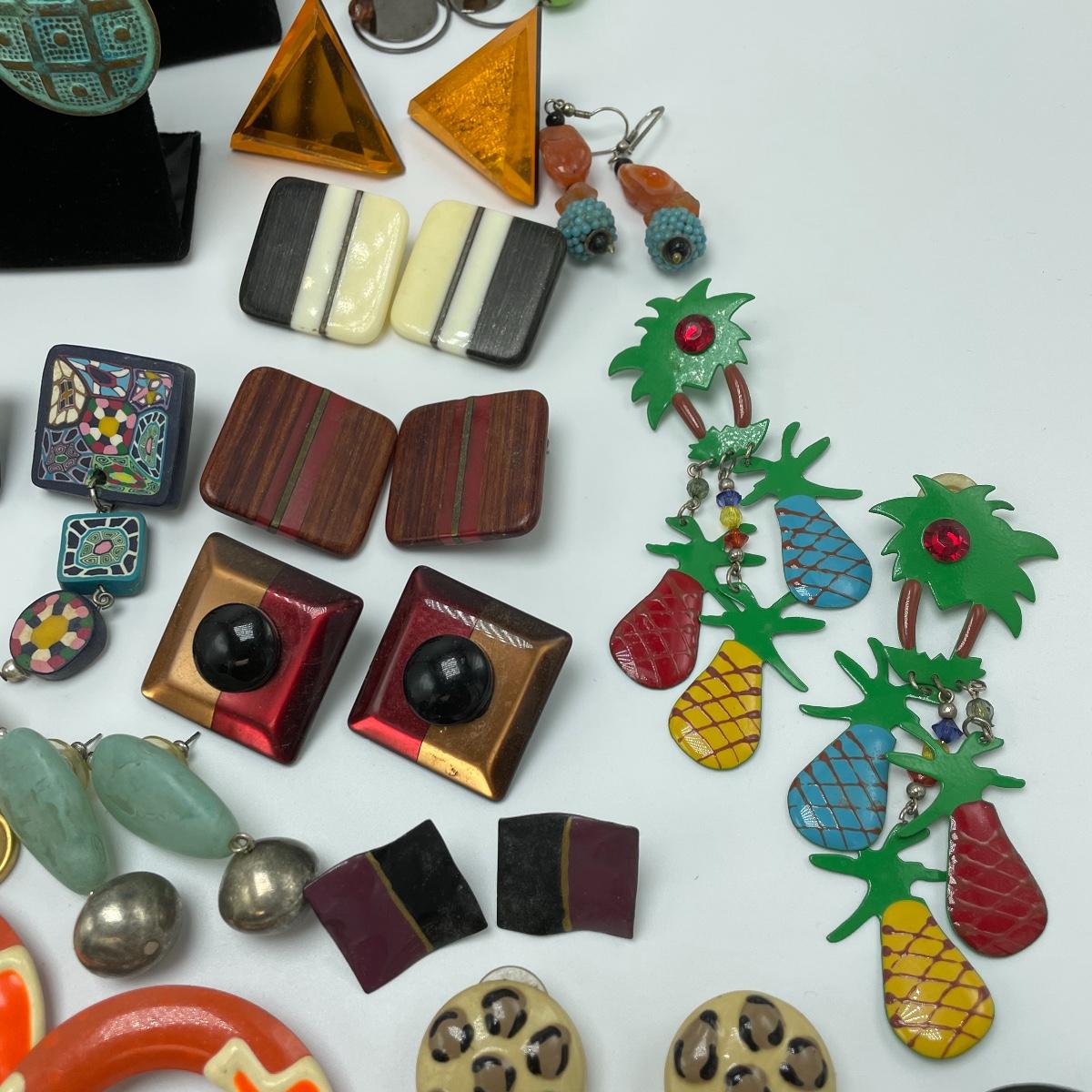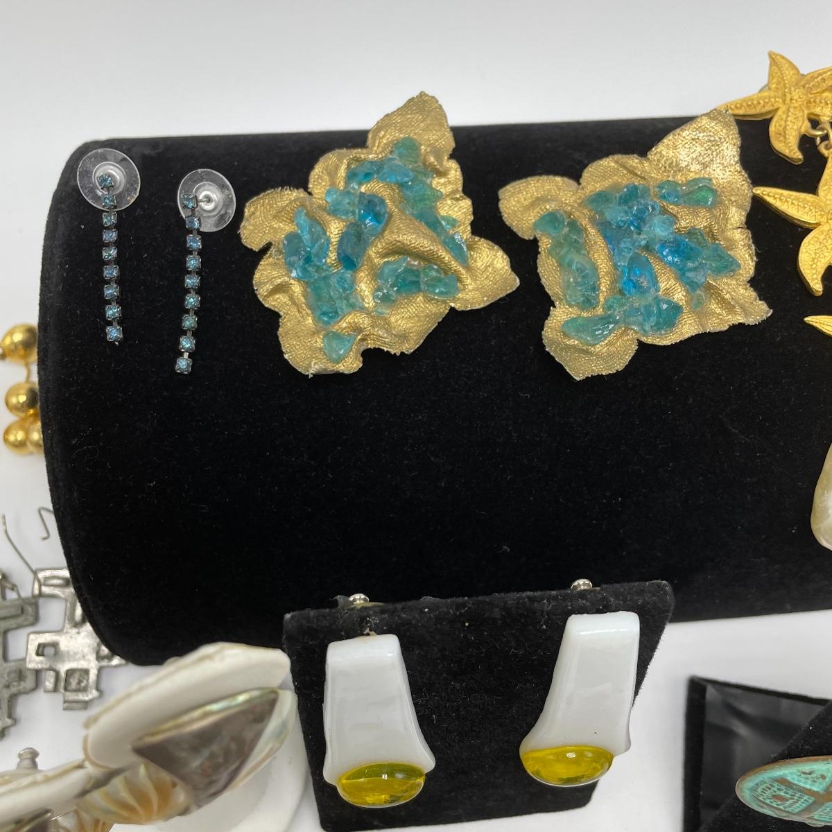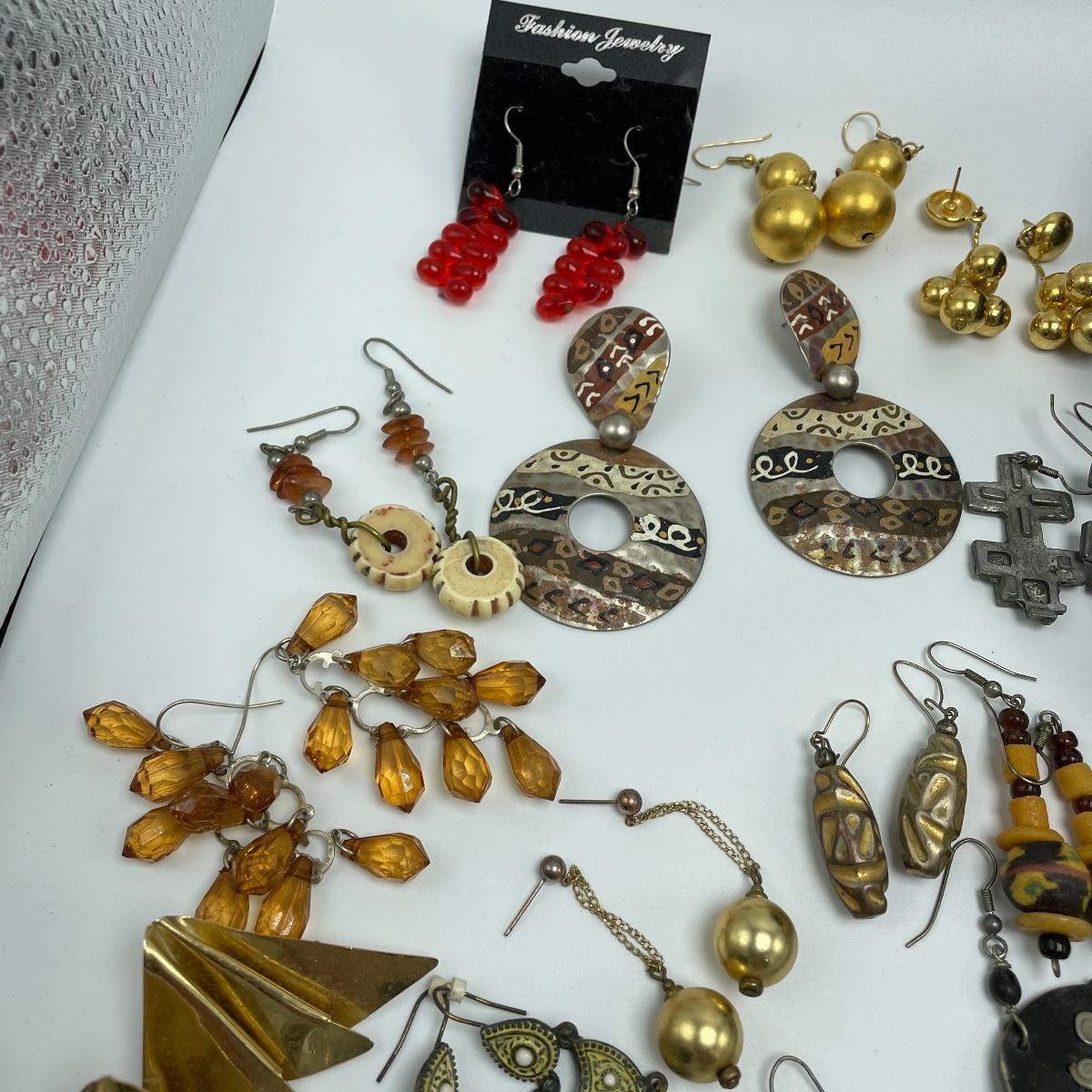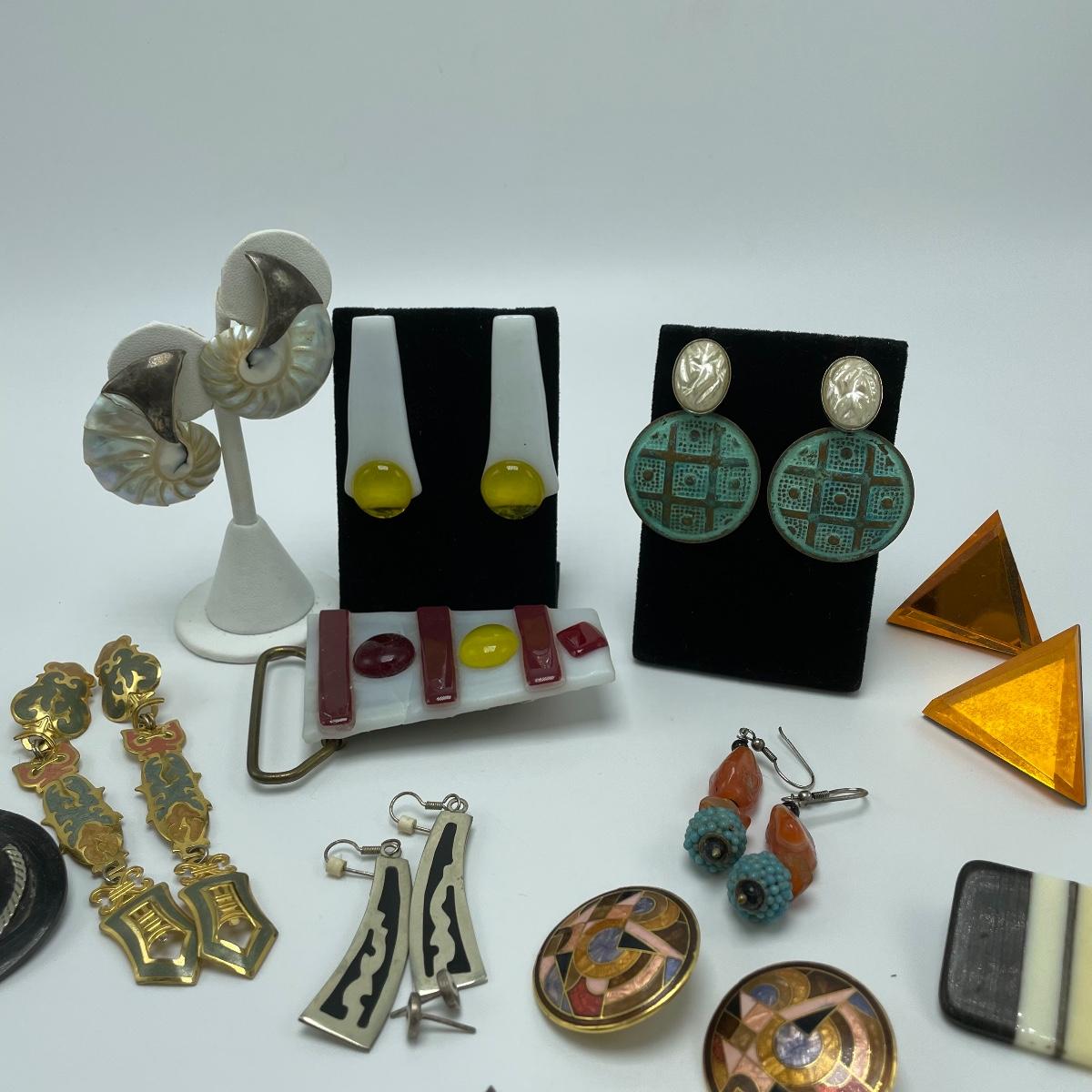 Get your bold on here! Lot features several pairs of bright and chic earrings for pierced ears. An awesome glass set includes a matching belt buckle. Earrings are made from ceramic, metals, shells, cloth and more! See images and happy bidding! Shipping available.