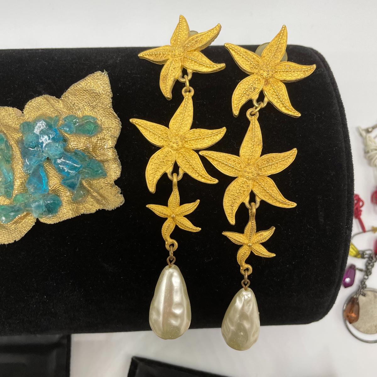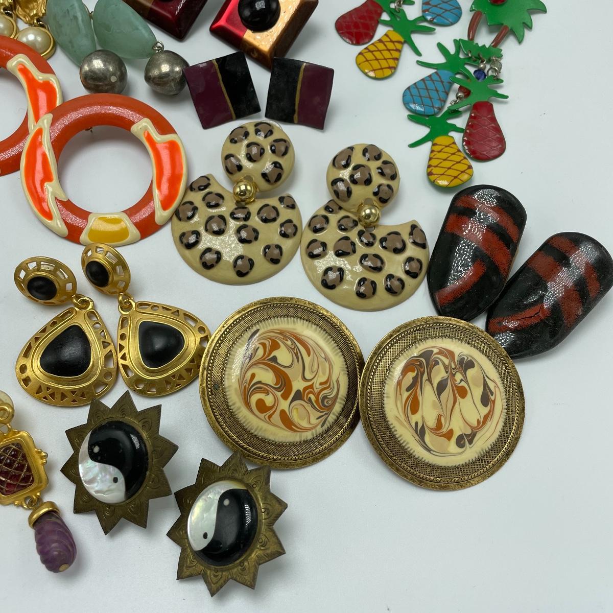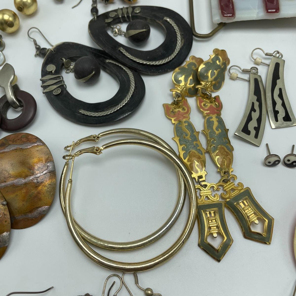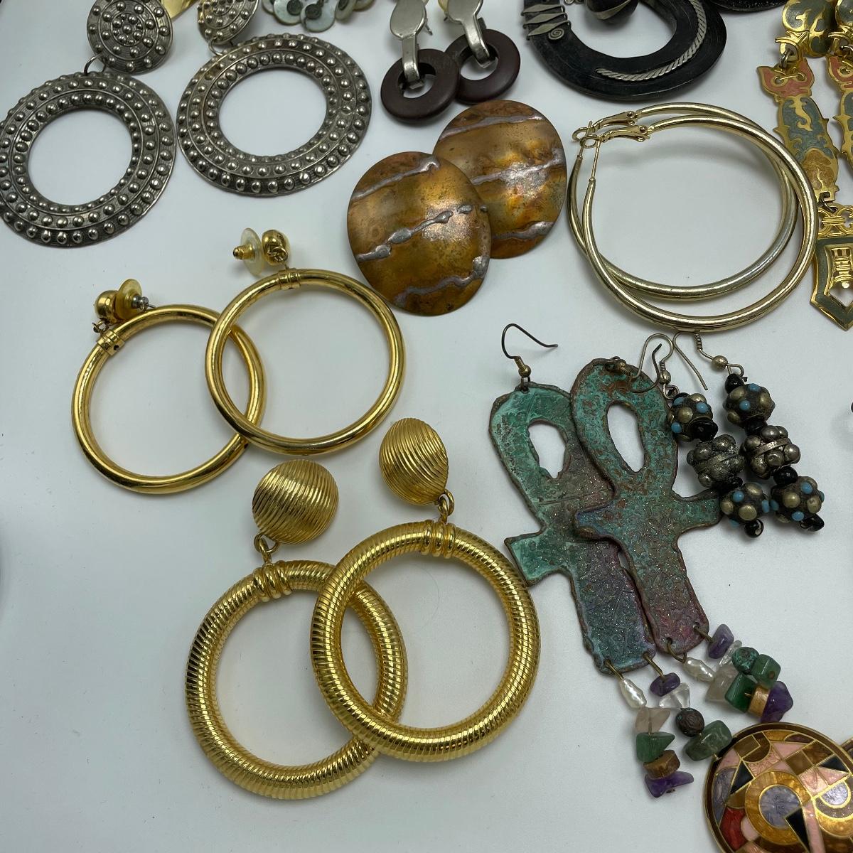 Get your bold on here! Lot features several pairs of bright and chic earrings for pierced ears. An awesome glass set includes a matching belt buckle. Earrings are made from ceramic, metals, shells, cloth and more! See images and happy bidding! Shipping available.