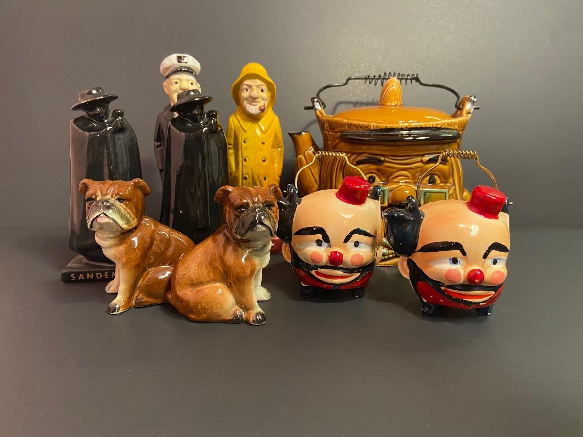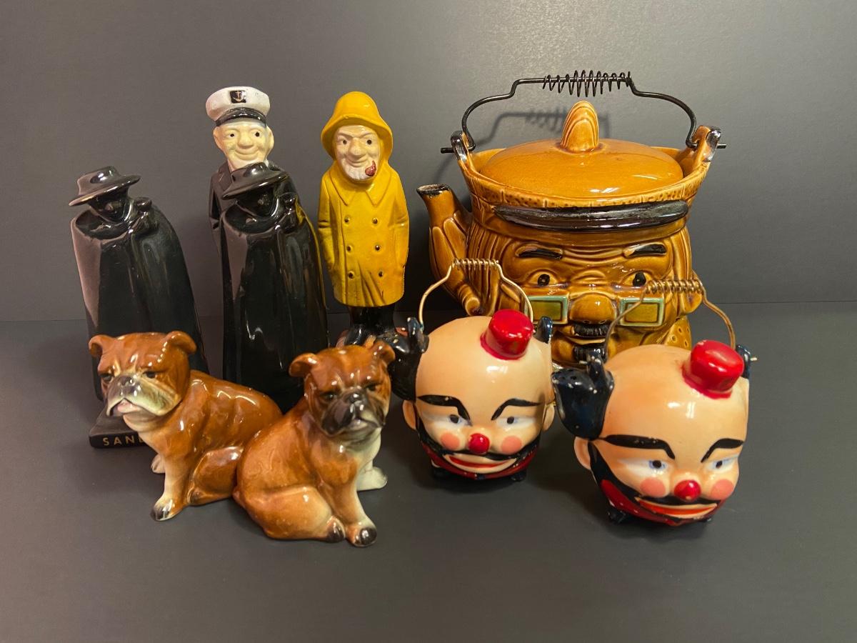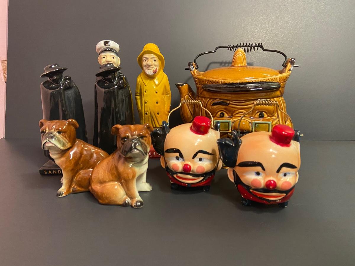 Collection of MCM salt and pepper shakers and a vintage Ben Franklin Toby Teapot.