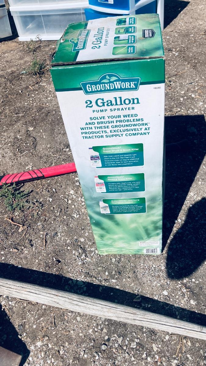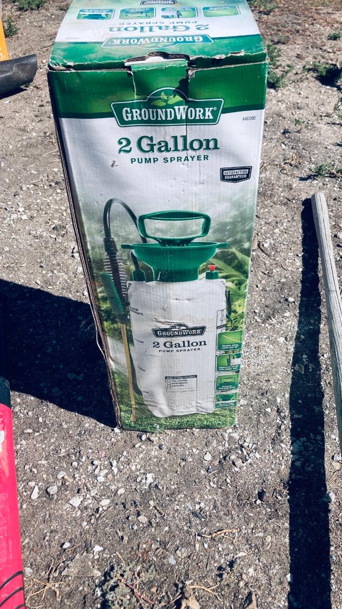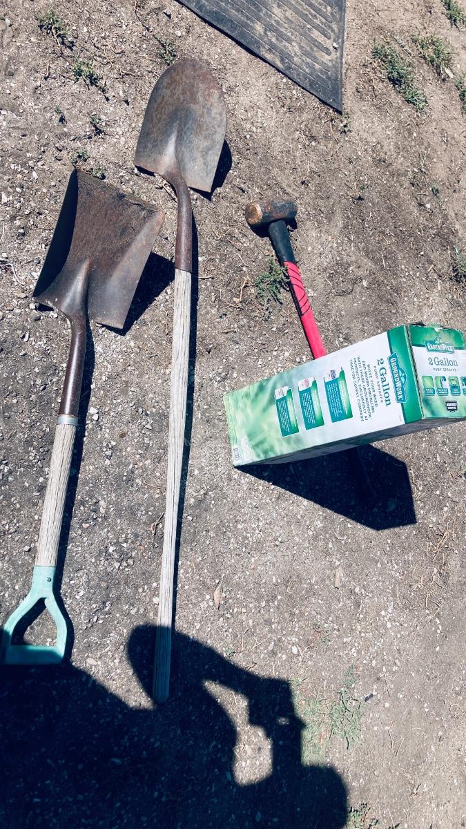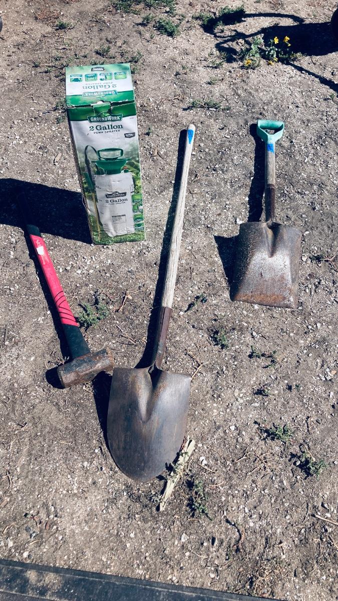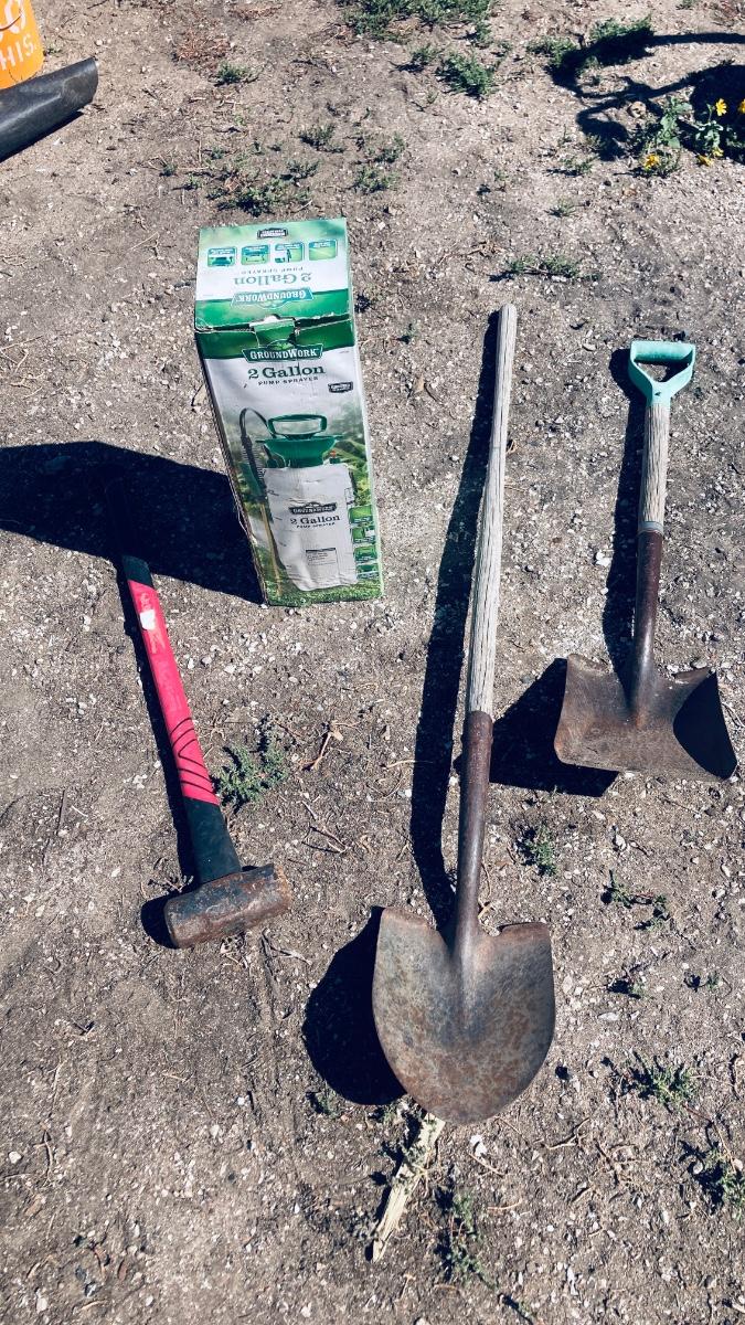 WEED SPRAYER, SLEDGE HAMMER AND 2 SHOVELS