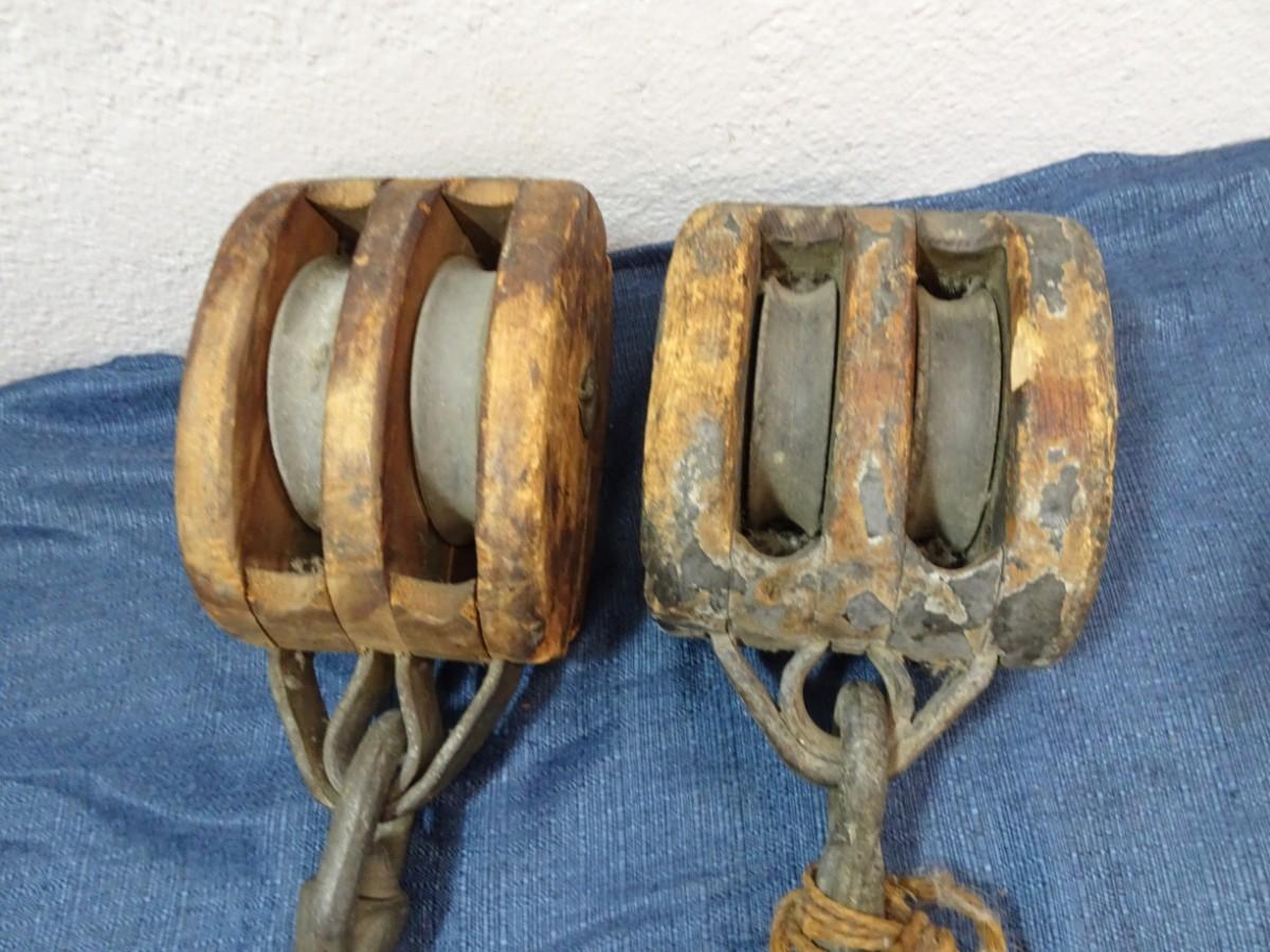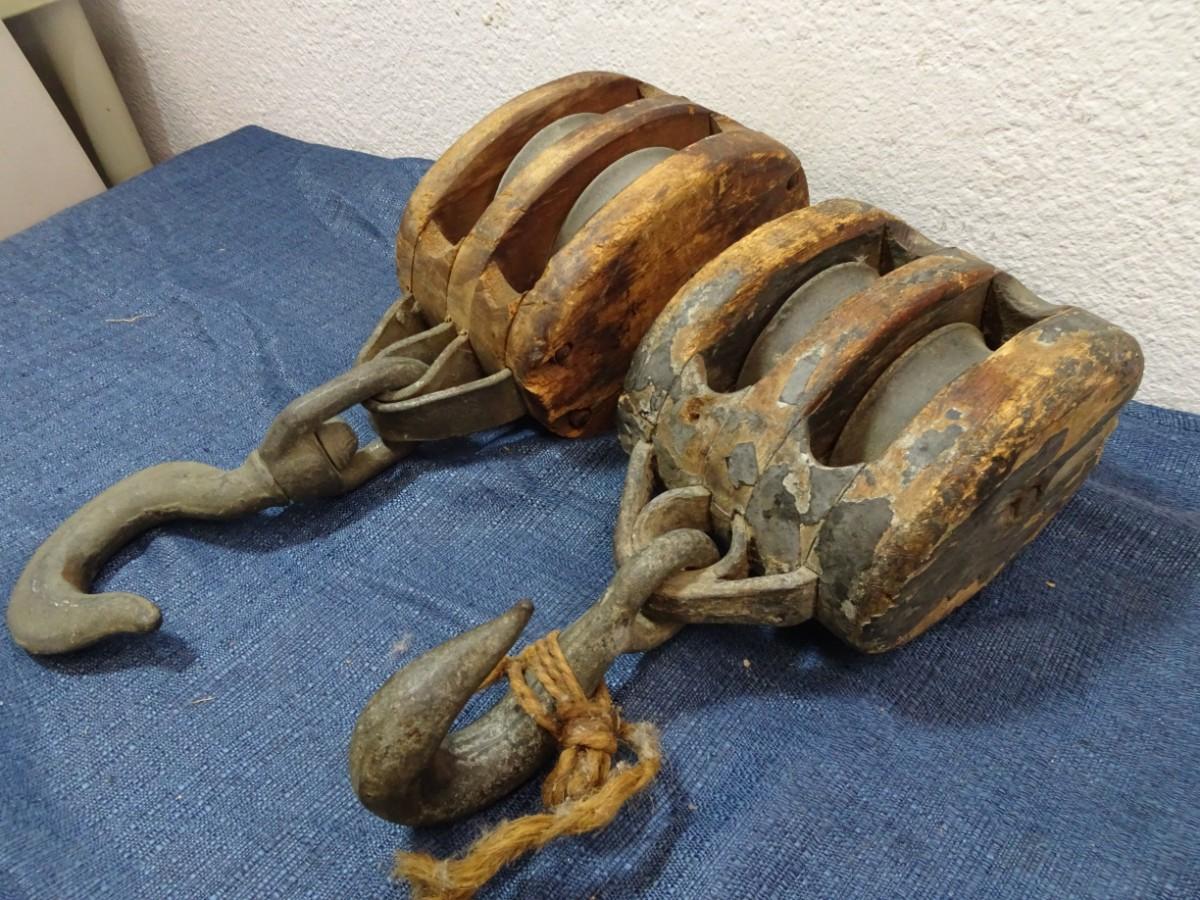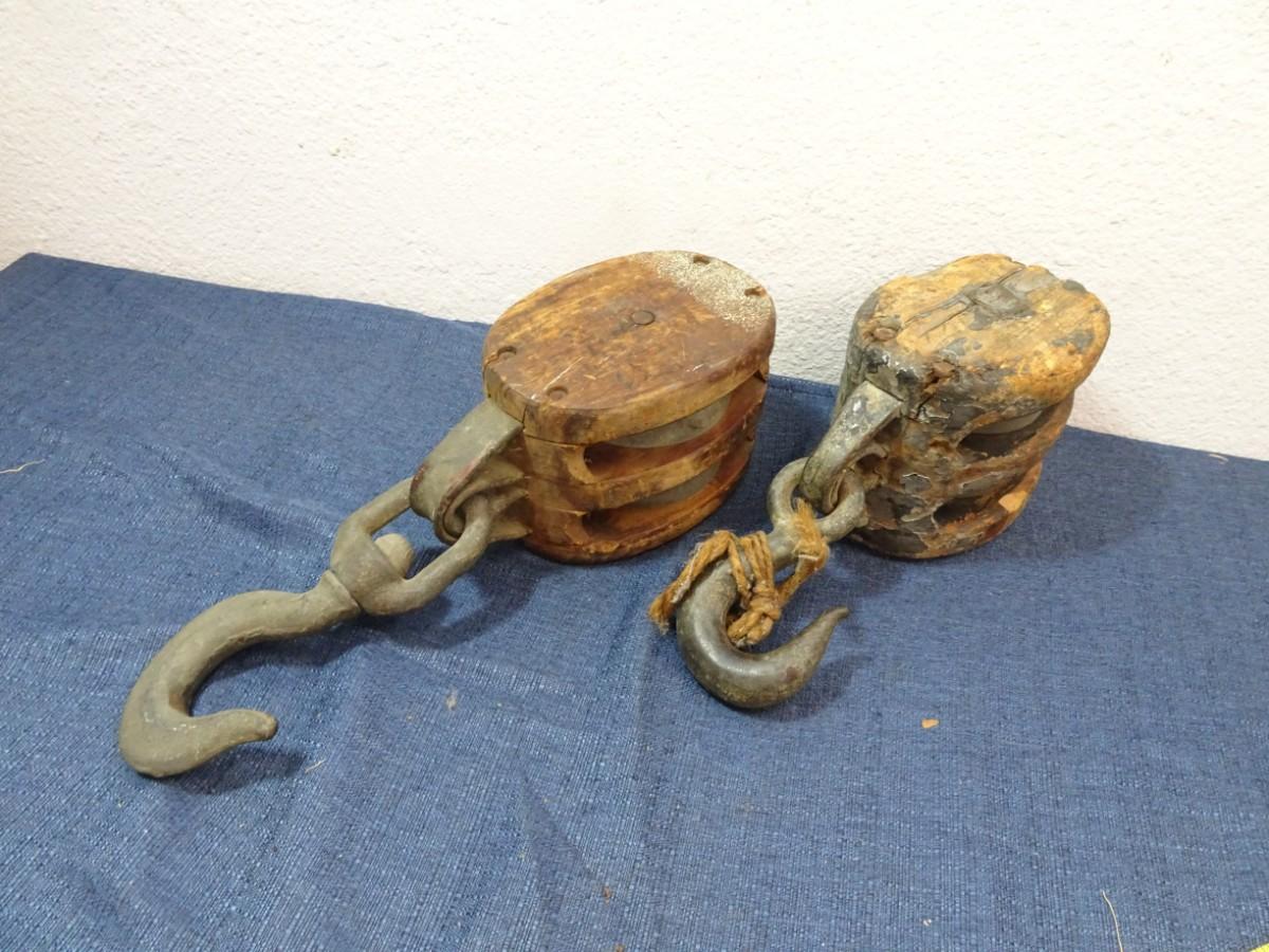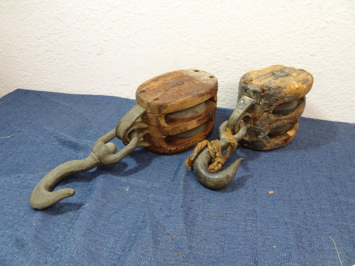 LOT 205. TWO VINTAGE WOOD DOUBLE ROPE PULLEYS WITH HOOKS