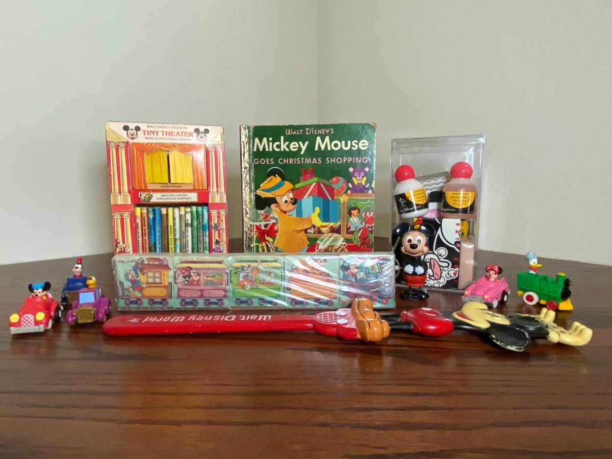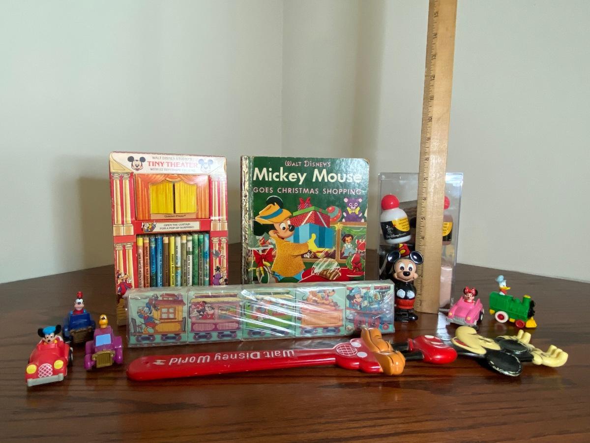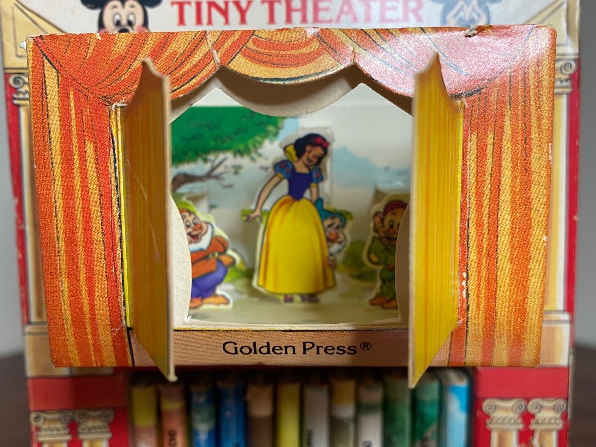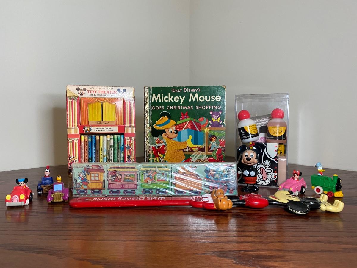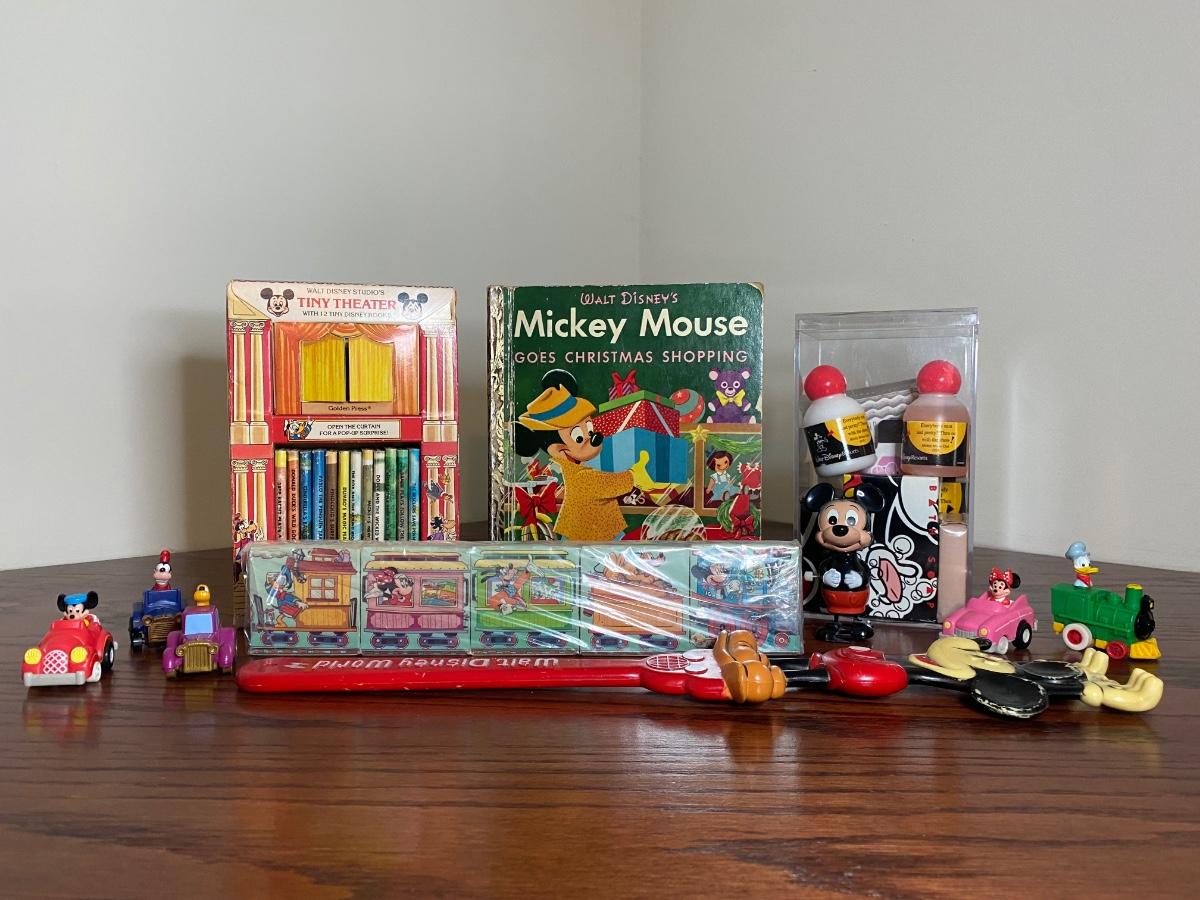 Lot 205: Vintage Disney: Tiny Theater w/Tiny Books, Soaps w/Cartons That Make a Train, Little Golden Book, Back Scratcher & More