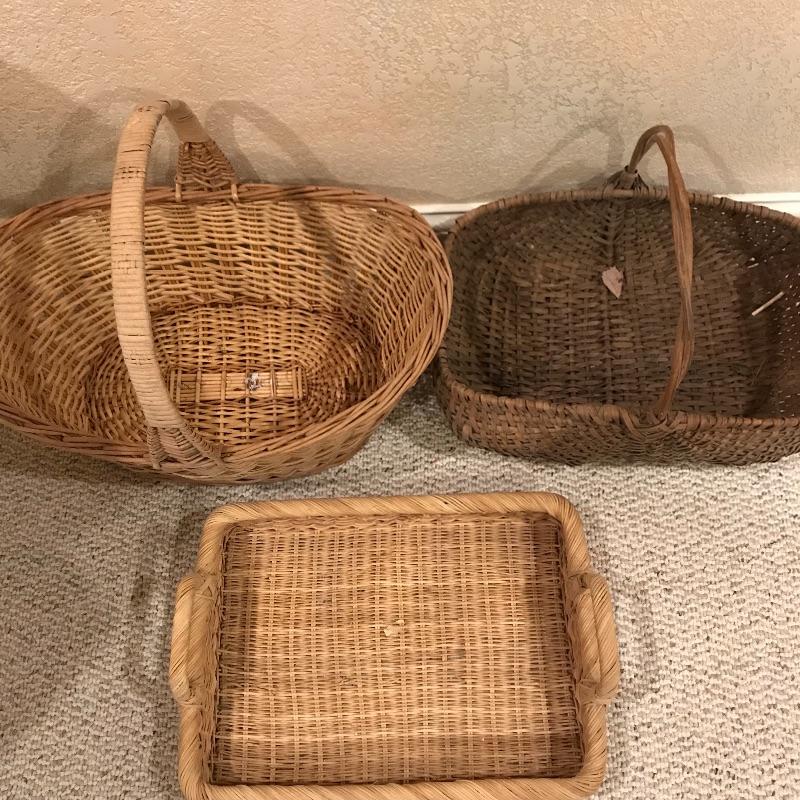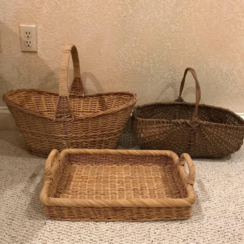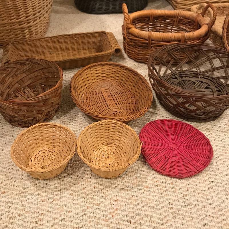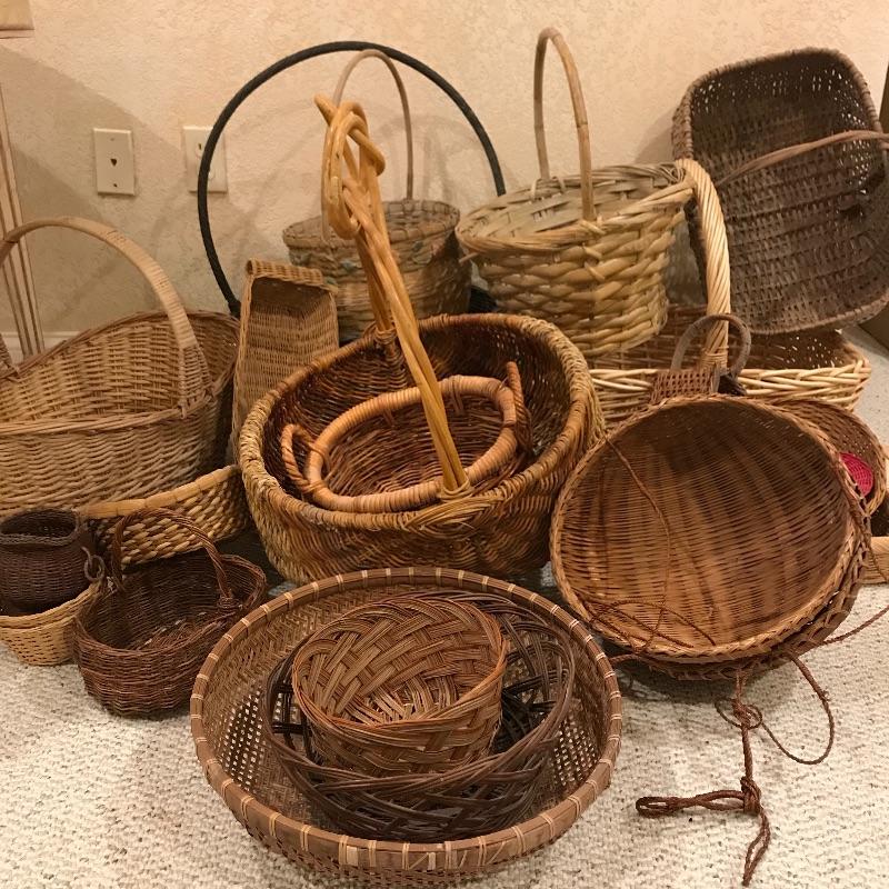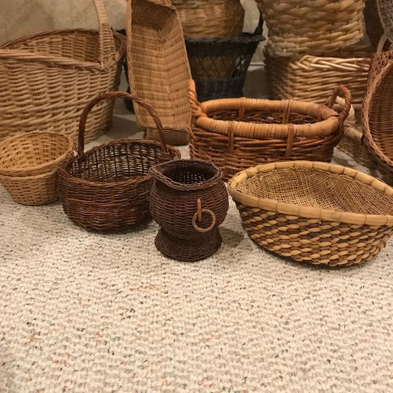 Large basket collection with all different styles, colors and materials. Lot includes a trivet, wine bottle carrier, and hanging baskets. The lovely basket in lot’s cover photo measured approximately 18” x 23”. Mild mildew is present throughout lot. No shipping.
