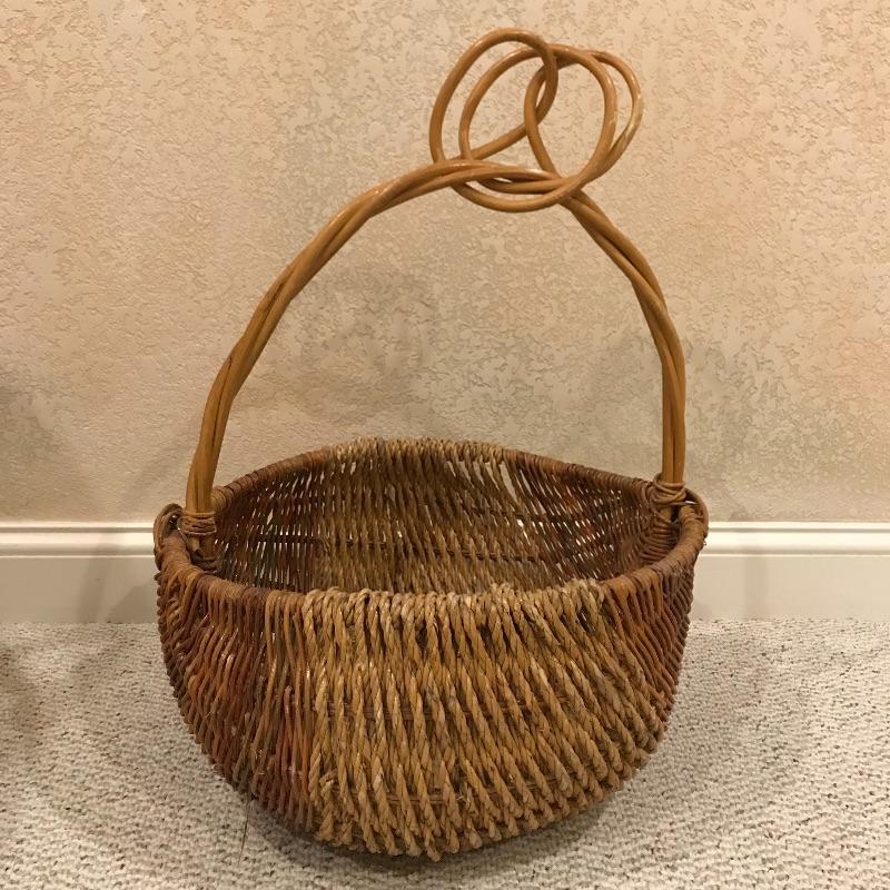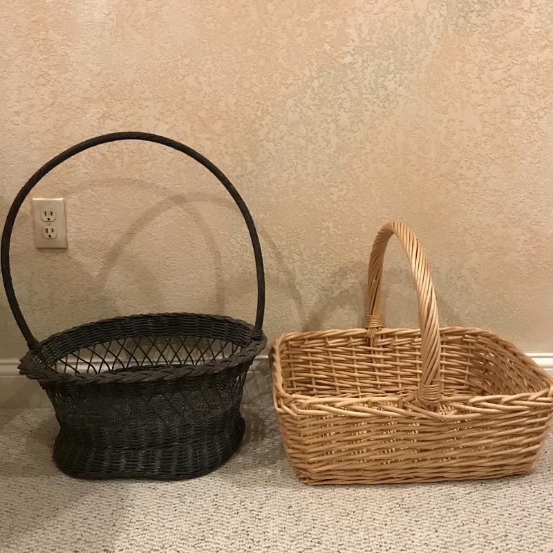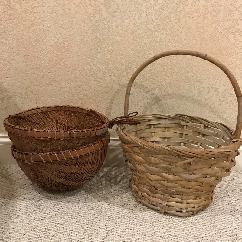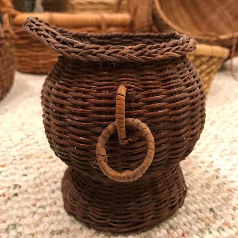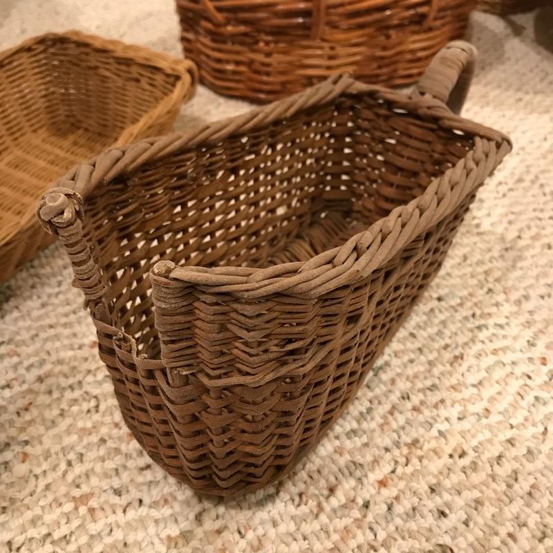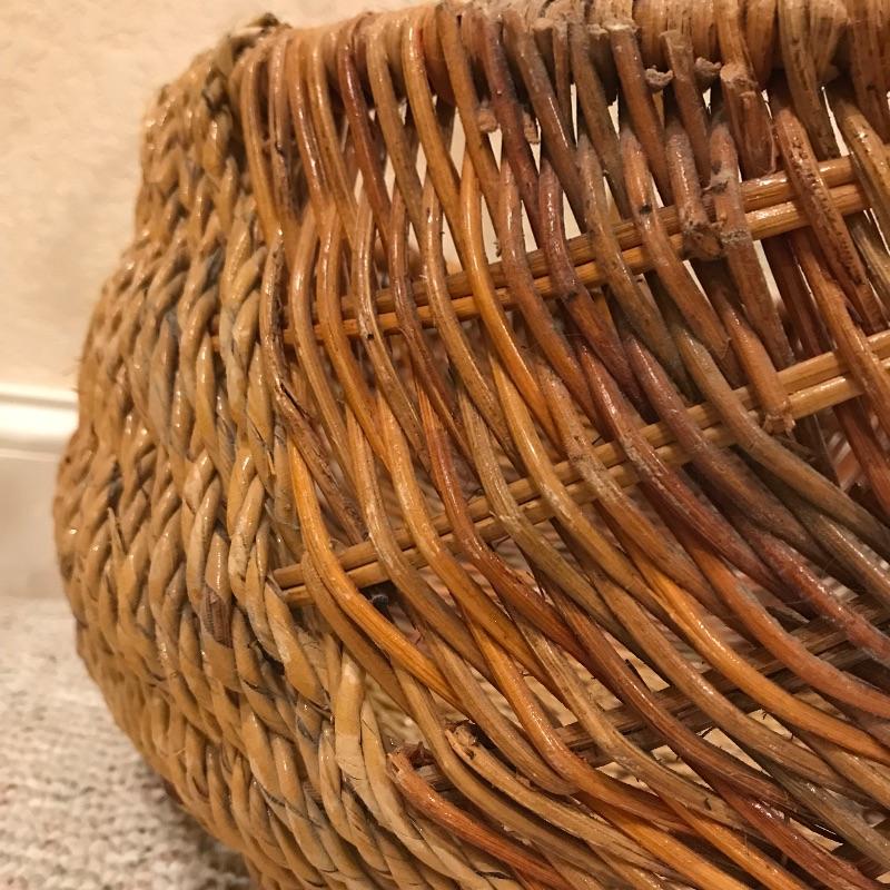Large basket collection with all different styles, colors and materials. Lot includes a trivet, wine bottle carrier, and hanging baskets. The lovely basket in lot’s cover photo measured approximately 18” x 23”. Mild mildew is present throughout lot. No shipping.