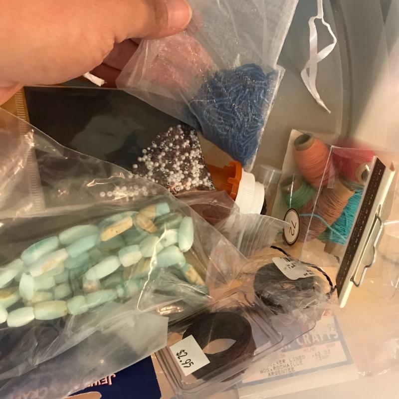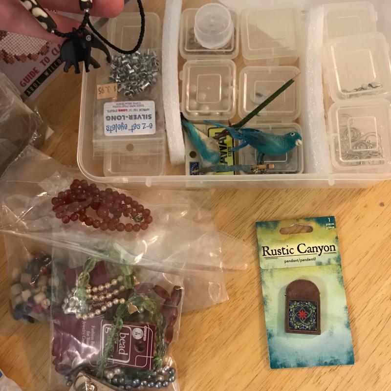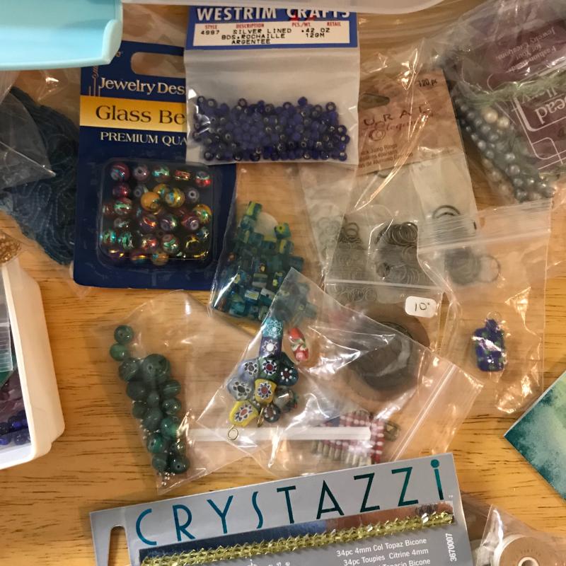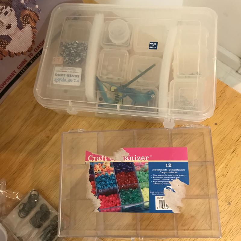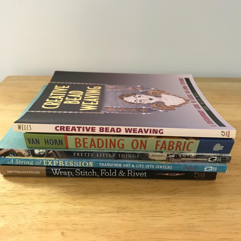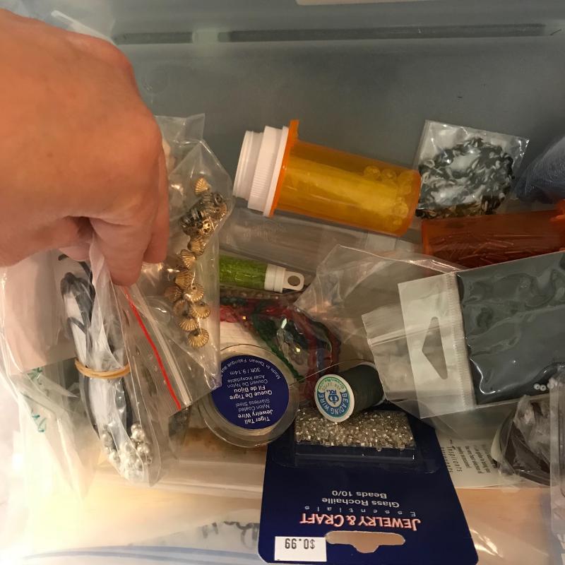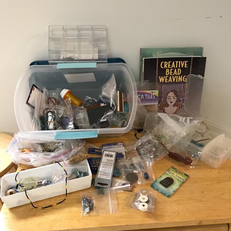 Sterilite tote measuring 15”x9.5”x7” full of beads and beading materials, mostly organized in plastic bags and some still in manufacturers plastic. Lot also includes two small crafting organizers and five beading/jewelry books. Local pick up only.