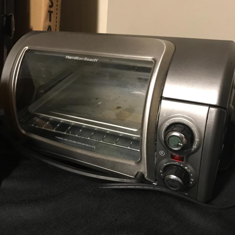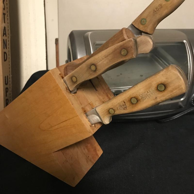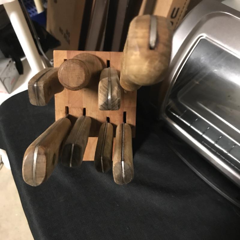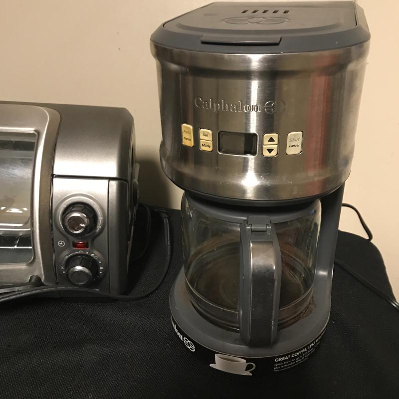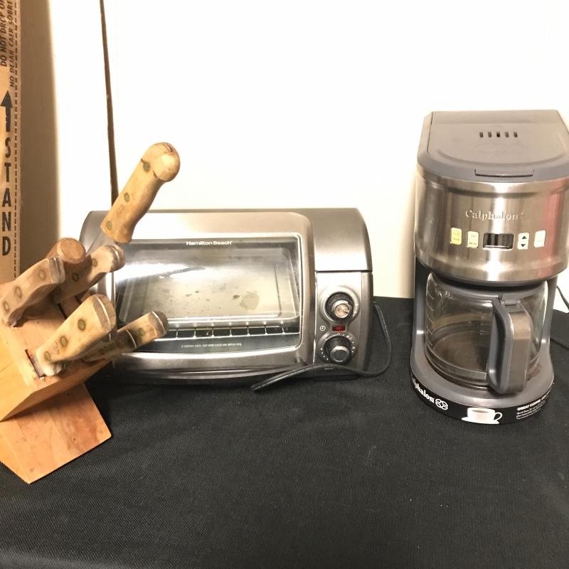 Stainless Steel Caphalon 12 cup coffee maker, Hamilton Beach toaster oven and 8-piece knife and sharpener set in butcher block. One knife is too large for block so it sticks out. No shipping. Only local pick up in Asheville, NC.