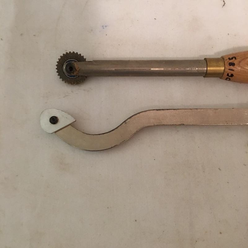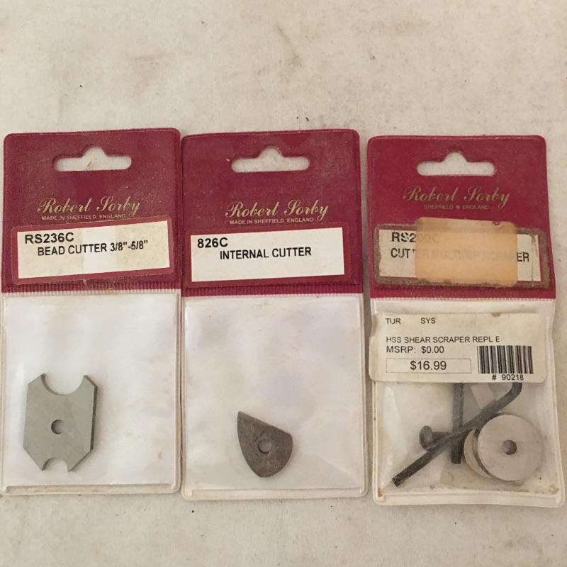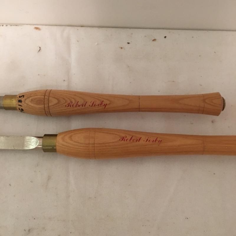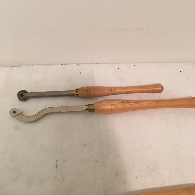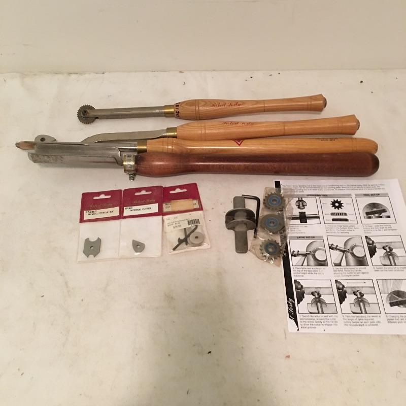 Four large lathe tools including two Robert Porky, one Henry Taylor and one Crown Tools wit extra tips and rollers. Largest tool measures 25.75” long.