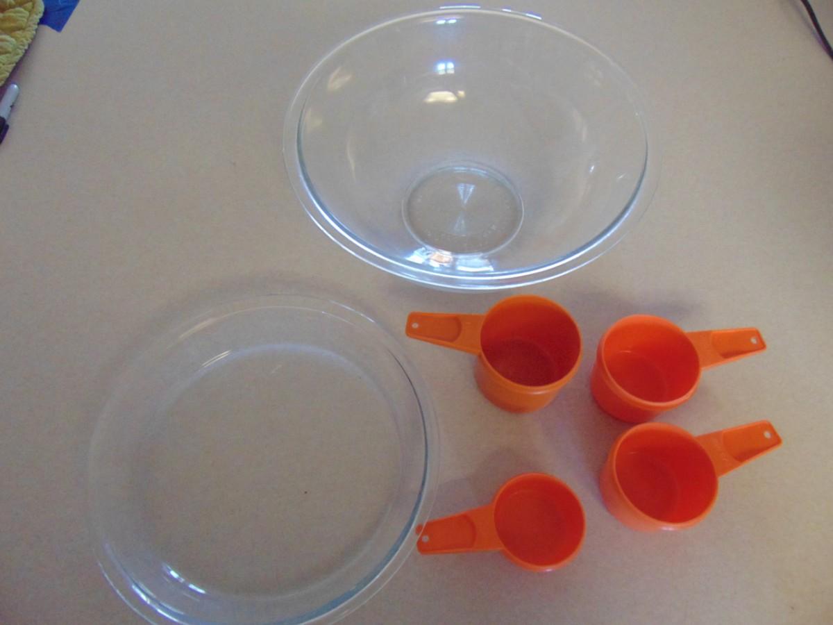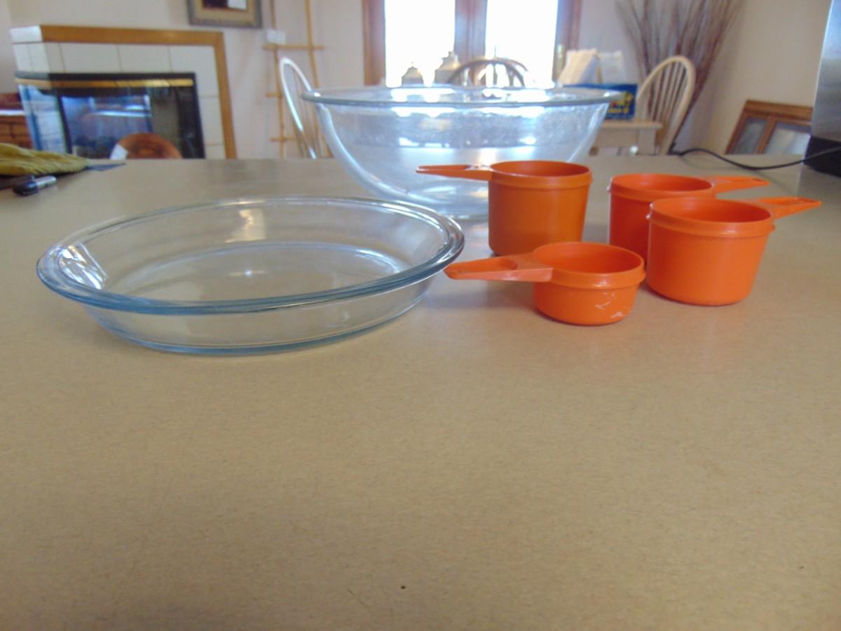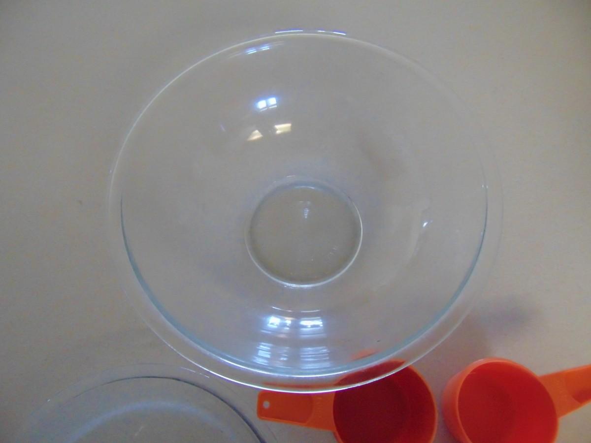 GLASS MIXING BOWL, PIE PLATE AND MEASURING CUPS