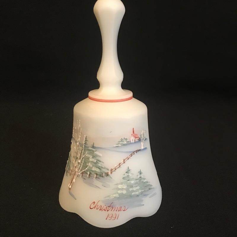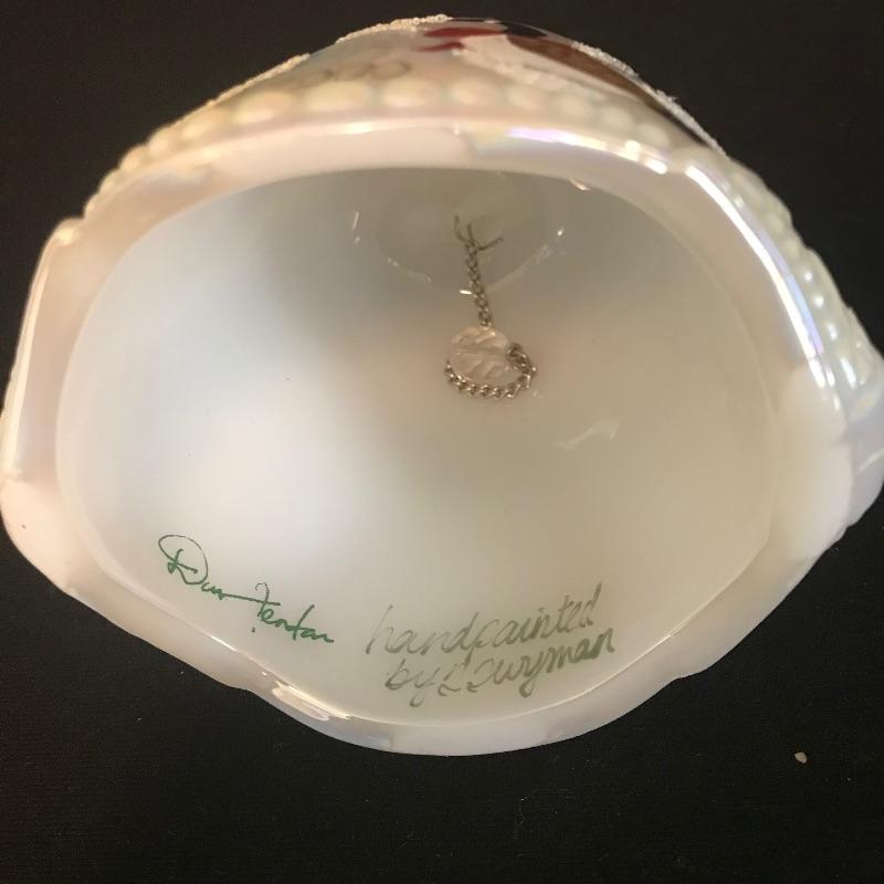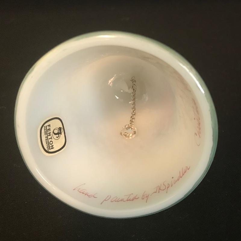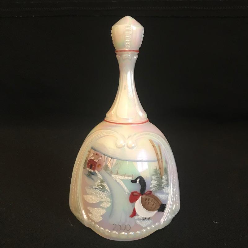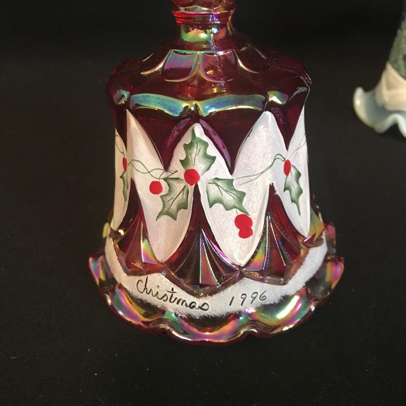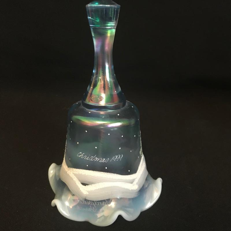 Lovely hand painted and signed Fenton bell collection the first year of this century and a few from the end of the last century. The 1992 bell is milk glass with fire luster. The 1996 bell is an iridized Ruby Whitton bell with a Bill Fenton signature. The 1999 bell is described as Iridized Misty Blue Opalescent Satin bell with Don Fenton Signature. Christmas 2000 is an Iridized opal oval bell. All bells are similar in size, the Christmas 2000 bell stands 7” high. See photos. Shipping available.