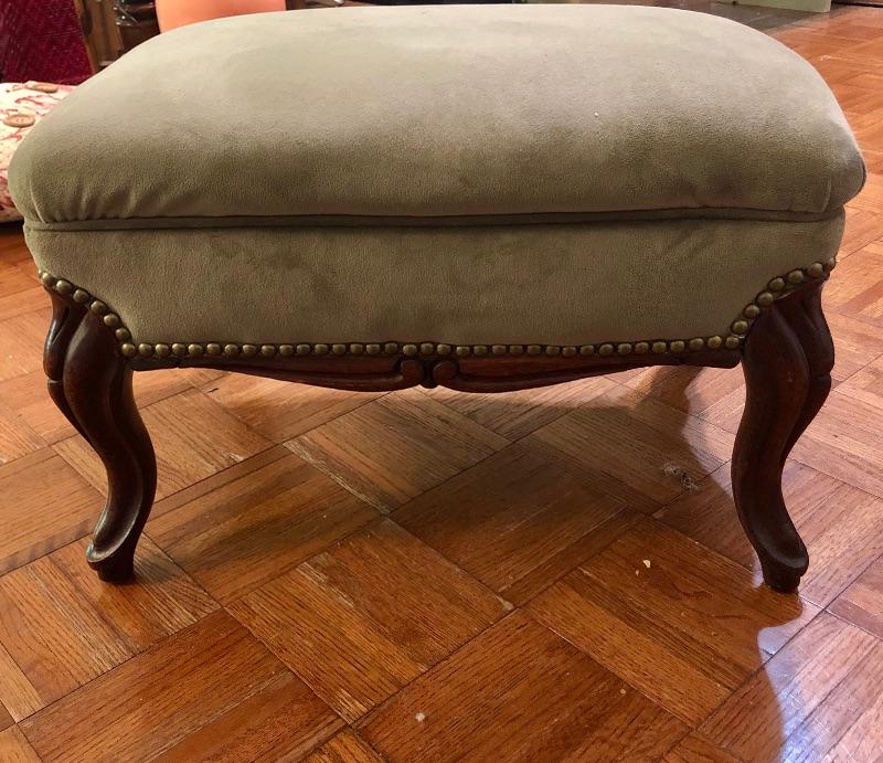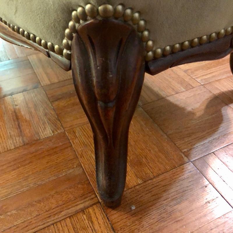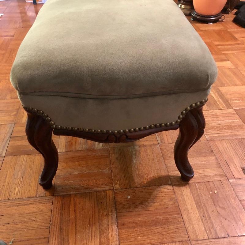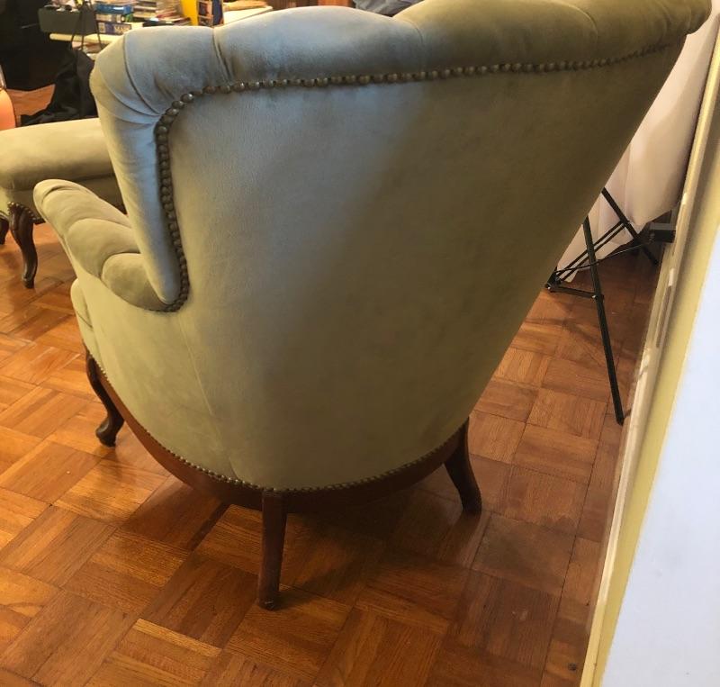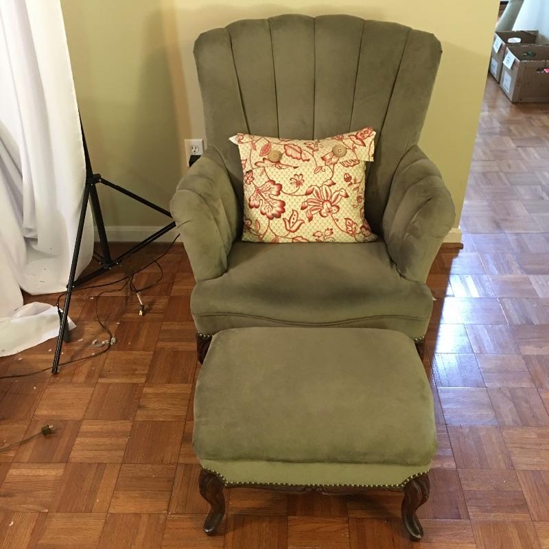 This high backed chair comes with matching ottoman. Super comfortable as well as elegantly stylish it will enhance any space it is put. They are a light green, possibly olive color, see images as they accurately show the color. Lots of nice additions that show a high level of craftsmanship such as the curved and carved legs and brass tacks. Accent pillow is included.