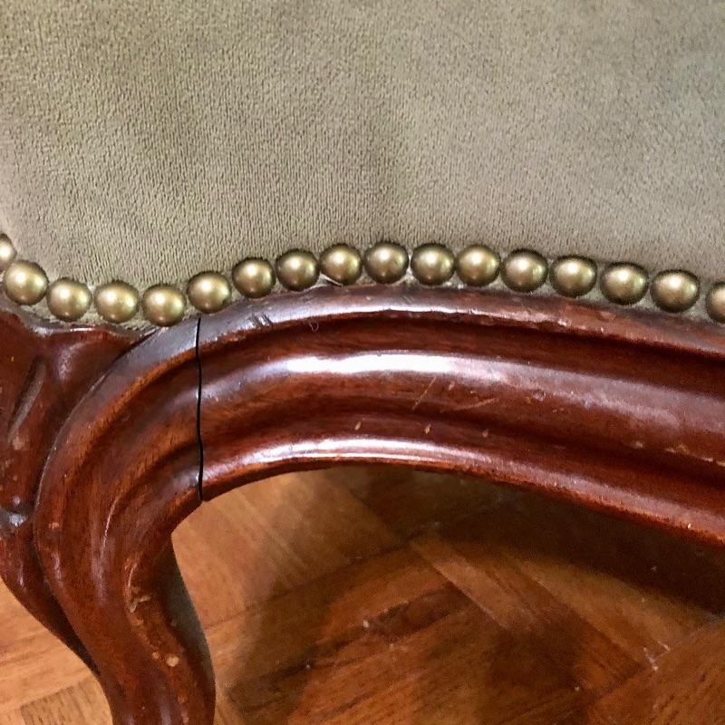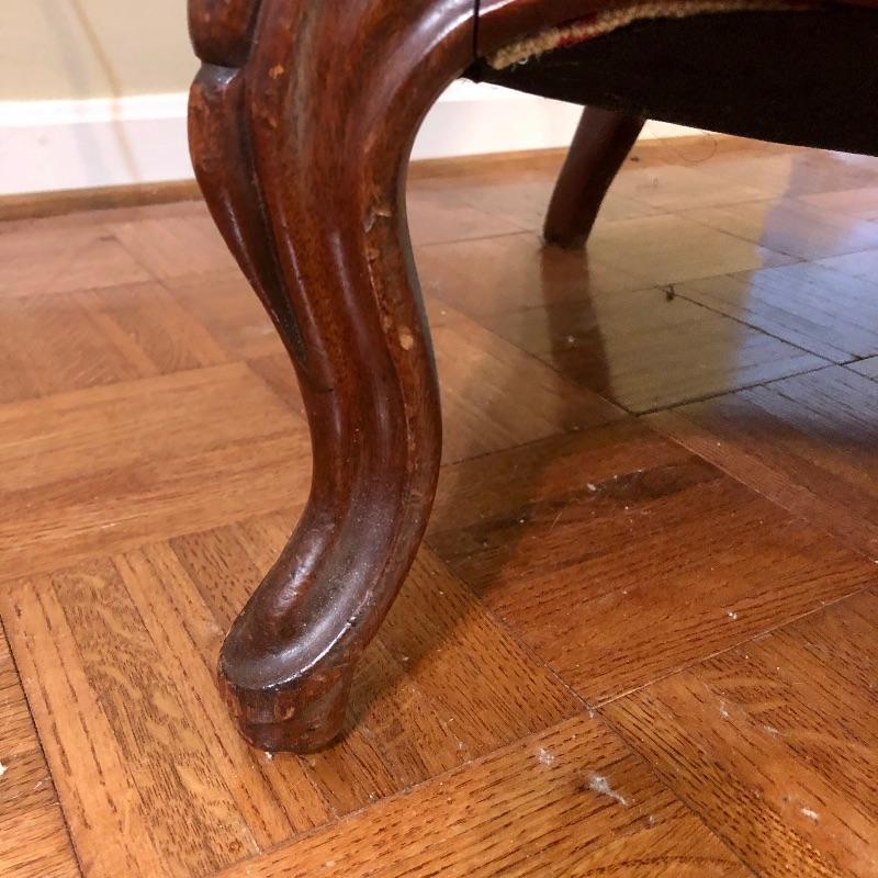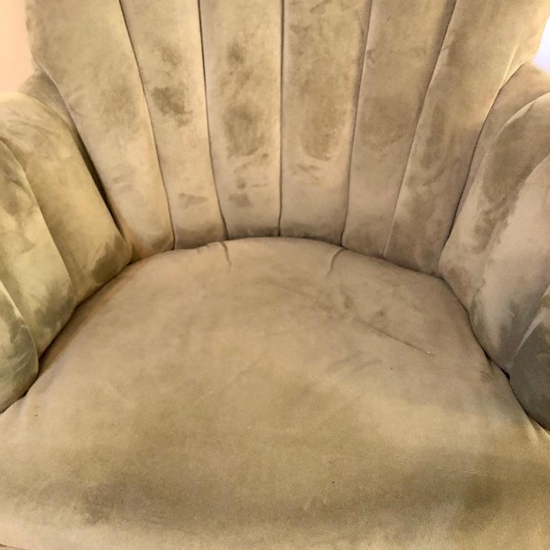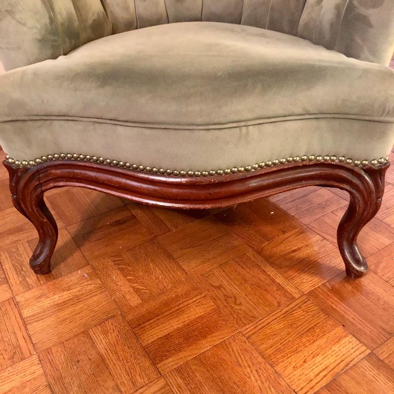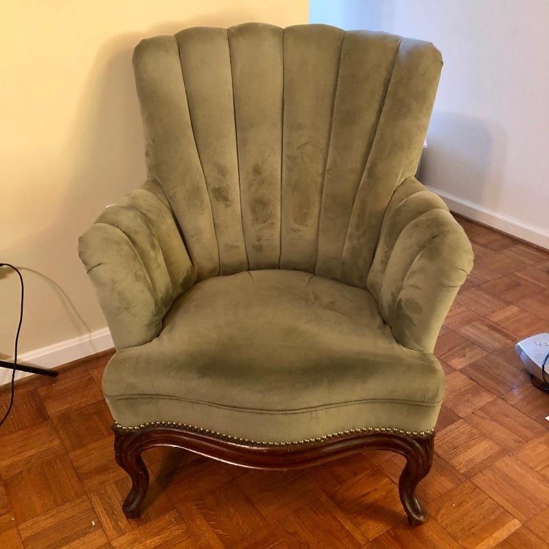 This high backed chair comes with matching ottoman. Super comfortable as well as elegantly stylish it will enhance any space it is put. They are a light green, possibly olive color, see images as they accurately show the color. Lots of nice additions that show a high level of craftsmanship such as the curved and carved legs and brass tacks. Accent pillow is included.
