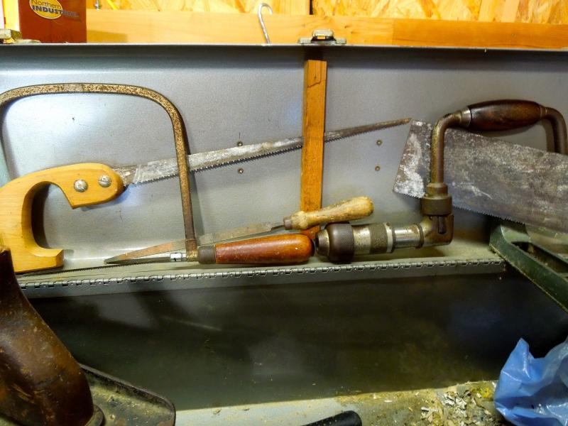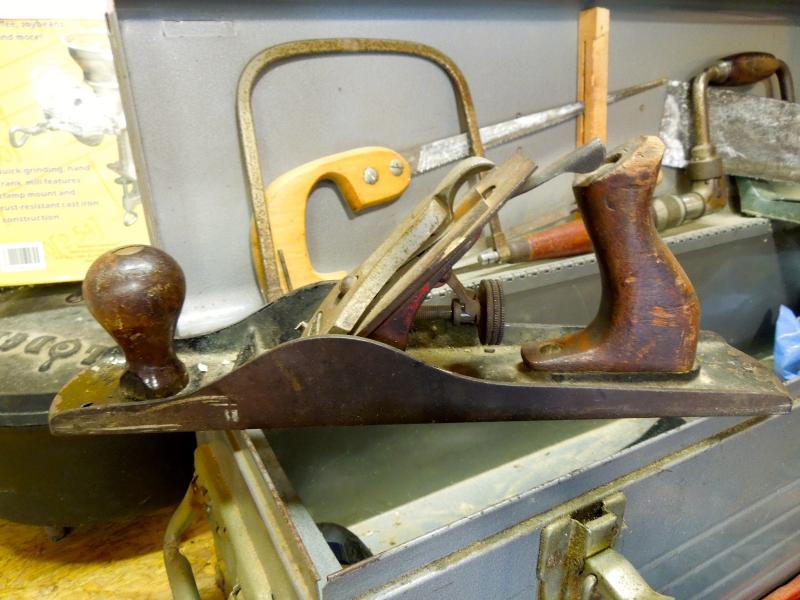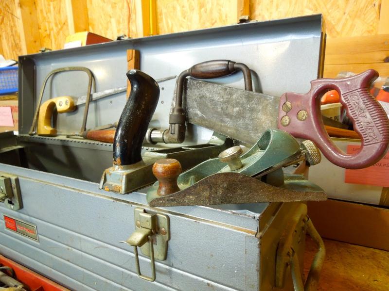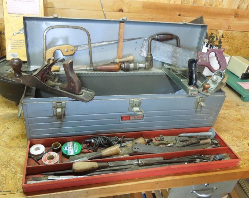 Look here! Wood handle planer, wood handle manual drill, wood handled saws, wood handled file, wood handled wood working tools, and more! Box is 30" L x 9.5" H x 8" W. Latches work. Everything in used vintage condition.