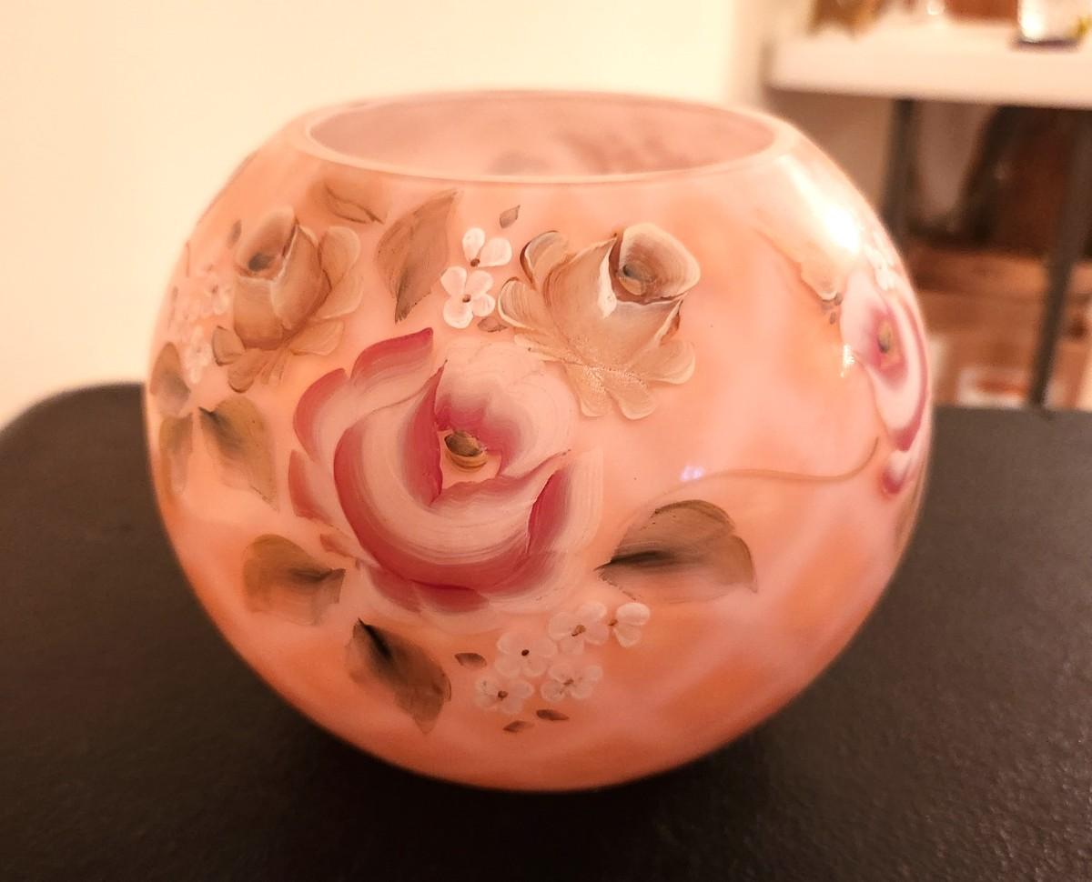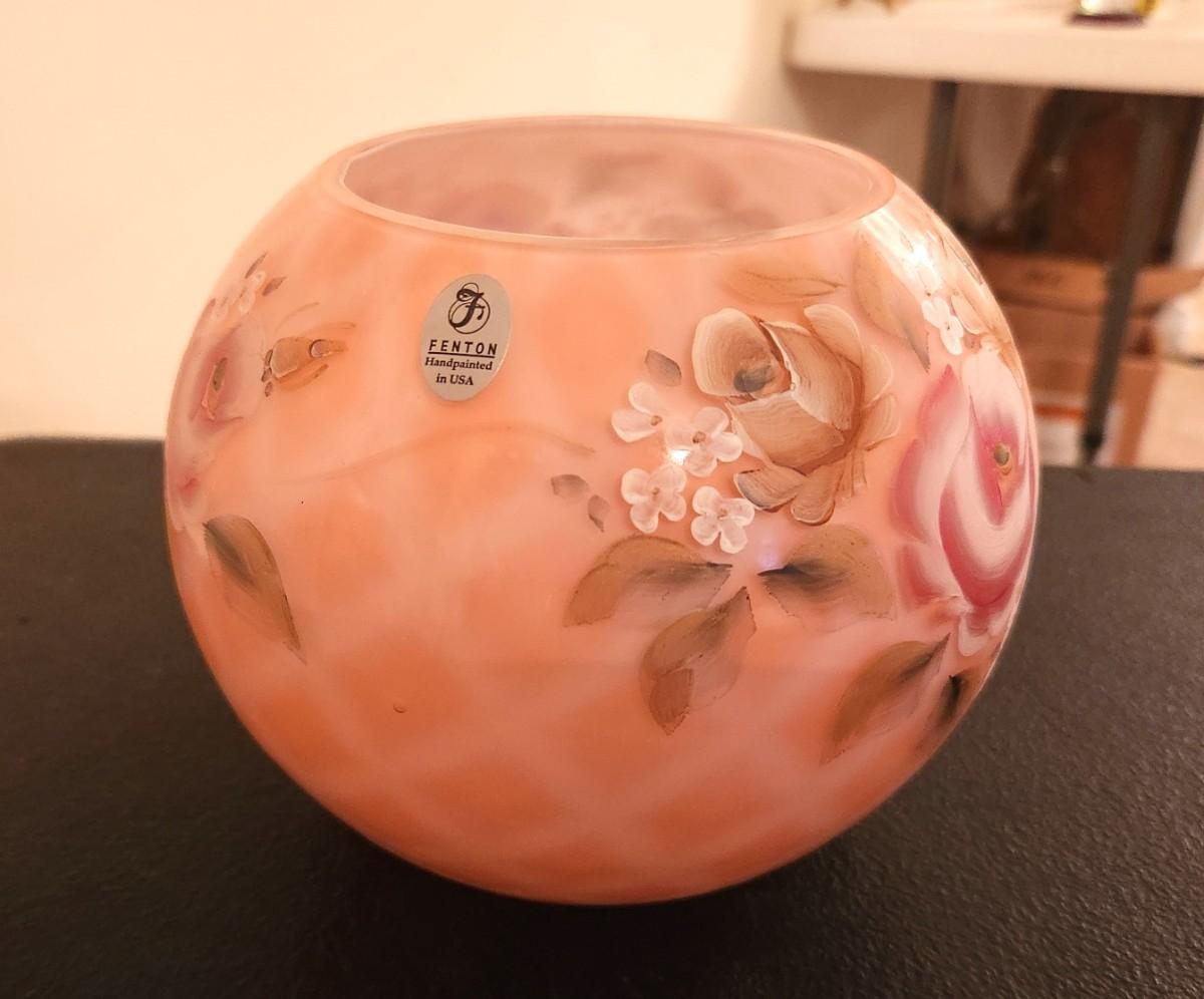 Very nice Fenton Art Glass Rose bowl - has label, signed, 5.5" tall. Coral overlay in the glass gives a very nice effect.