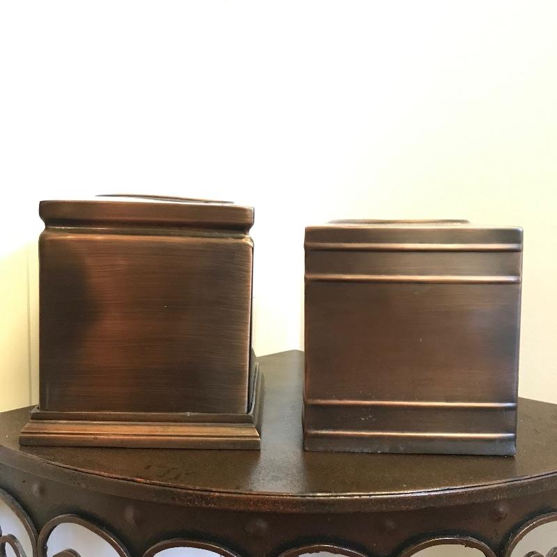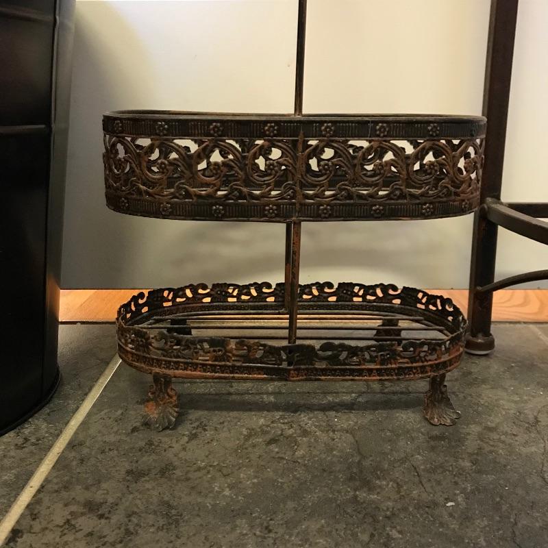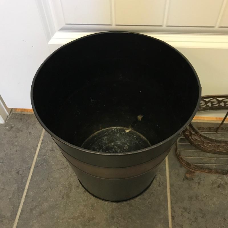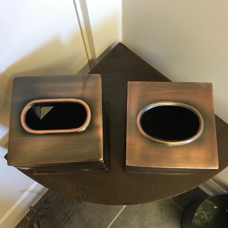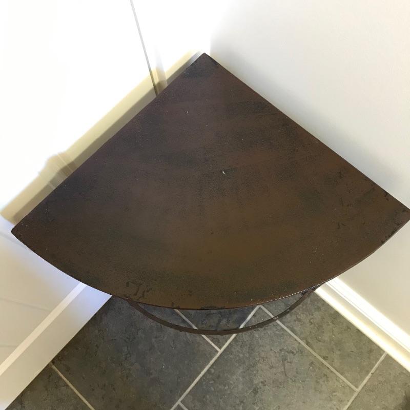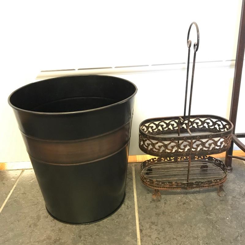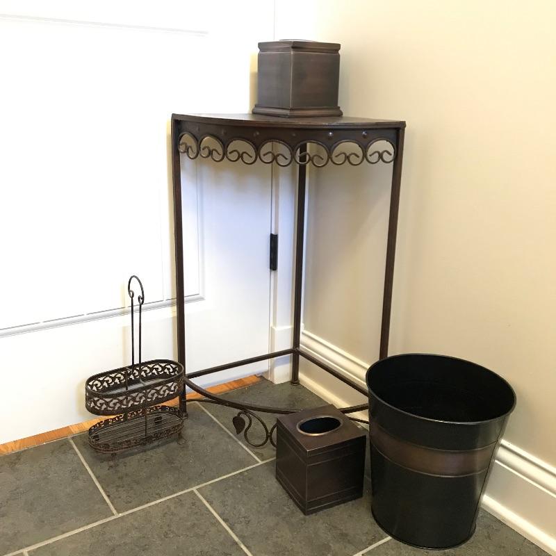 Lovely metal collection for your home! Nice lightweight metal corner table with a rustic wrought iron look. Piece measures approximately 13” x 13” x 27”. A nice small two section handled caddy looks great with the table. Collection also includes two tissue box covers with a brushed metal look and a matching refuse can. Refuse can has some dirt and rust inside that would be easily hidden with a liner. See photos. No shipping.