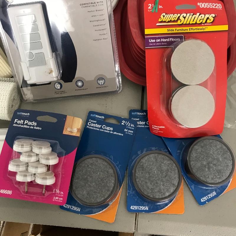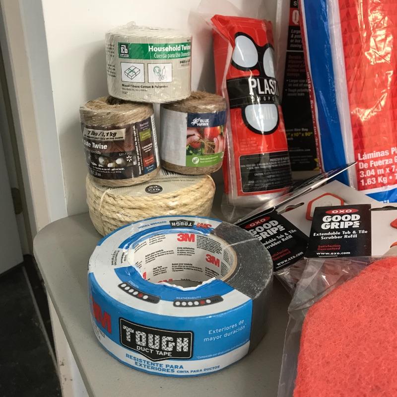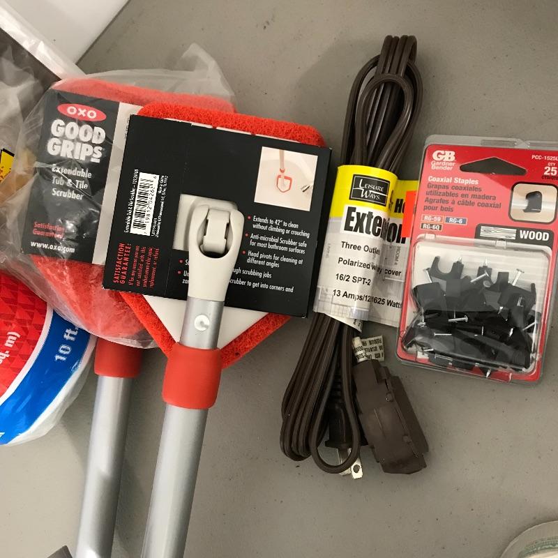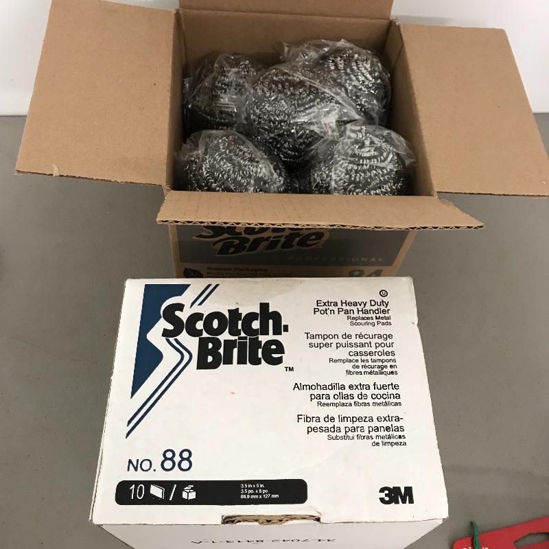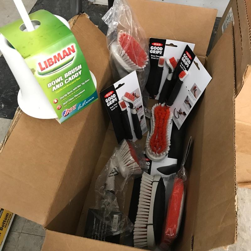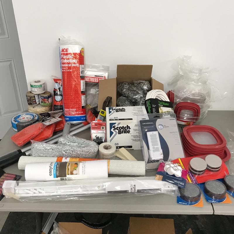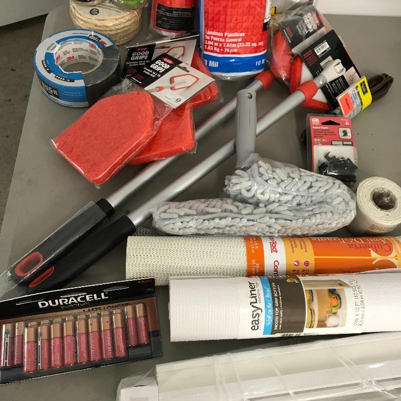 Large lot of useful household needs, most unused and in packaging. Let’s begin with a Rubbermaid food storage set and a fan cleaning attachment. Lot also includes two extendable tile scrubbers with extra pads, various sized cleaning brushes by oxo Good Grips, plastic sheeting, stainless steel scrubbers and cabinet liners. Twenty pack of Duracell AA20 Quantum batteries, twine/rope, super duct tape and more! Both Scotch Brite boxes are open, the Pot N Pan case missing one scrubber from box. See photos. No shipping.