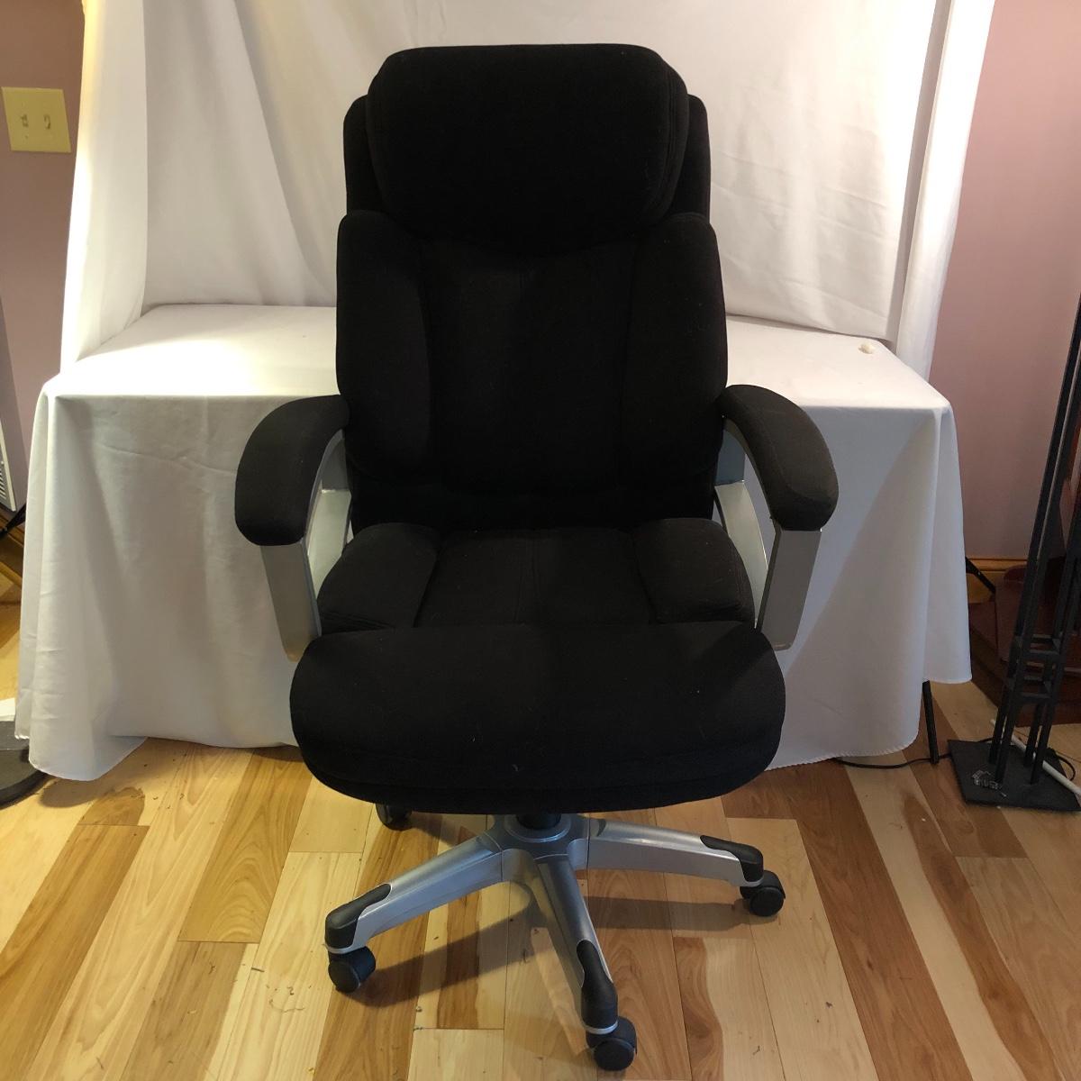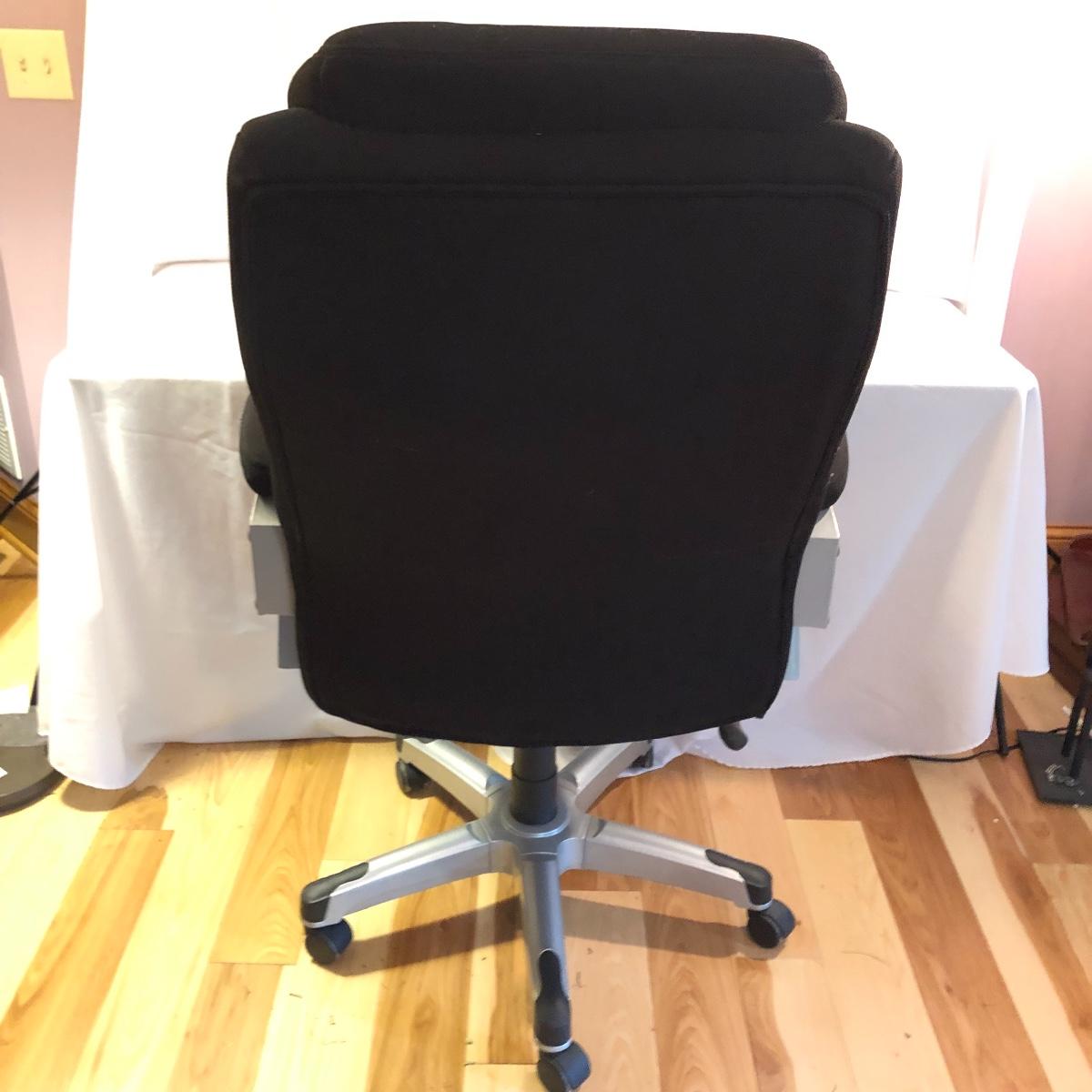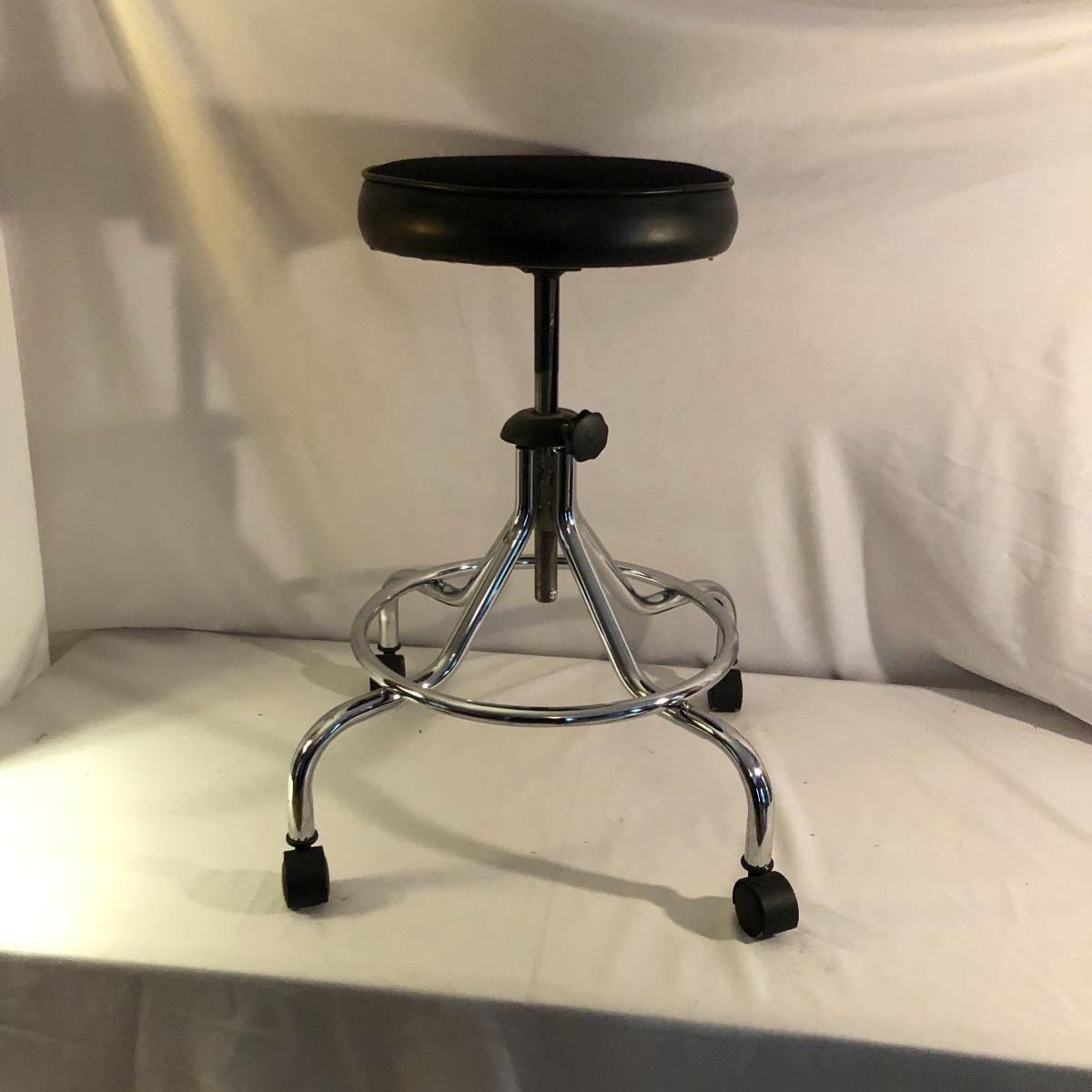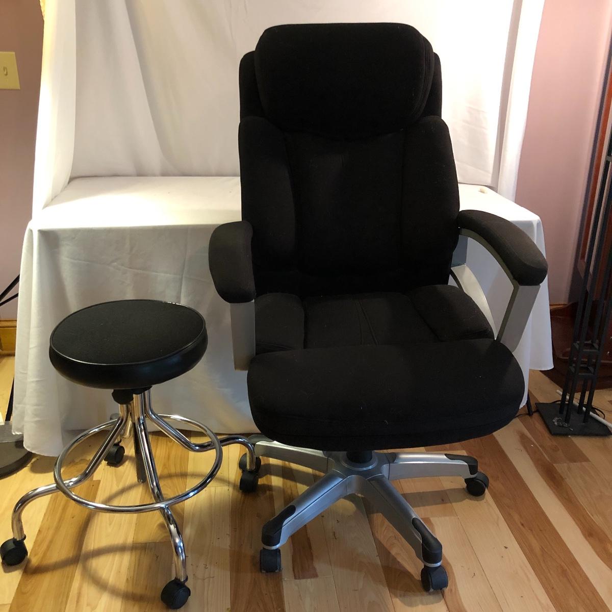 Stay comfortable while you work with this pair of seats. Lot includes large fabric office chair on wheels with adjustable height and a fabric stool on wheels with adjustable height. Office chair measures 30” x 31” x 49” at maximum height.