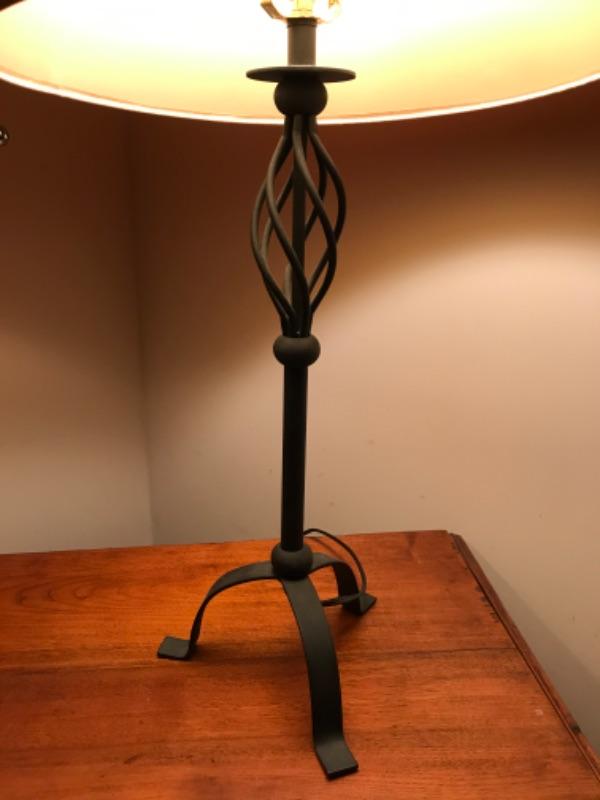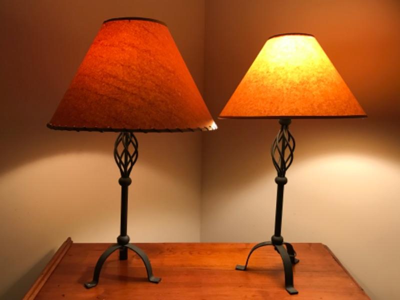 Pair is black metal table lamps. Lamps match but shades do not. One lamp measures 28” tall with shade and the other measures 29-1/2” tall with shade