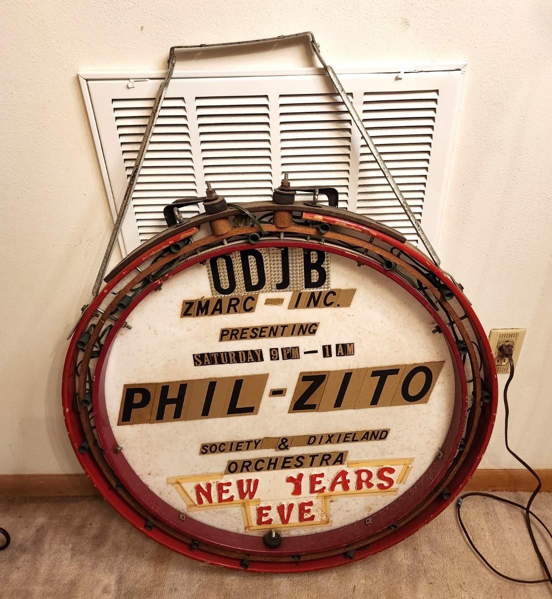 Interesting piece of New Orleans music memorabilia - vintage New Year's Eve promotional sign made from a drum top - promotion Phil Zito's Society and Dixieland Orchestra. Zito (b. 1913 - d. 1998) was a noted Dixieland Jazz drummer and bandleader. He co-founded the Original Dixieland Jazz Band & Foundation in 1935. After WWII, Zito's radio show "Phil Zito's N.O. International City Dixielander" radio show featured a new youngster on the scene (Pete Fountain). The group made a series of recordings on the Columbia label in 1950. A very scarce one of kind piece - has sockets for small bulbs around the edge.