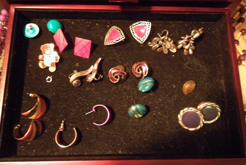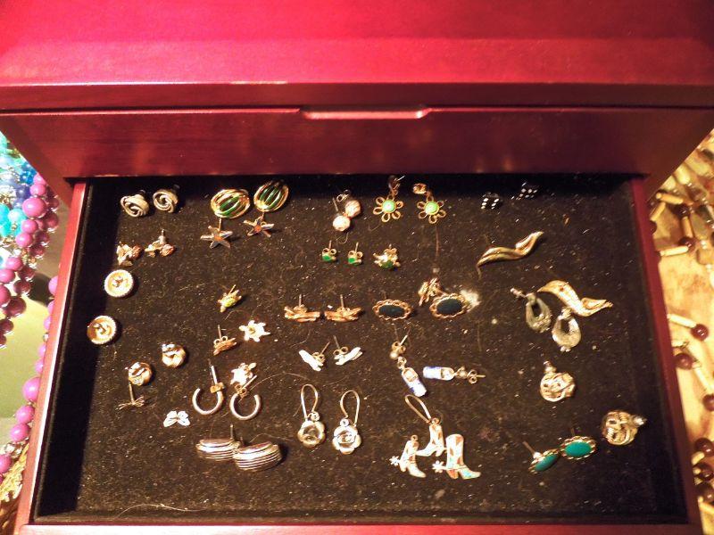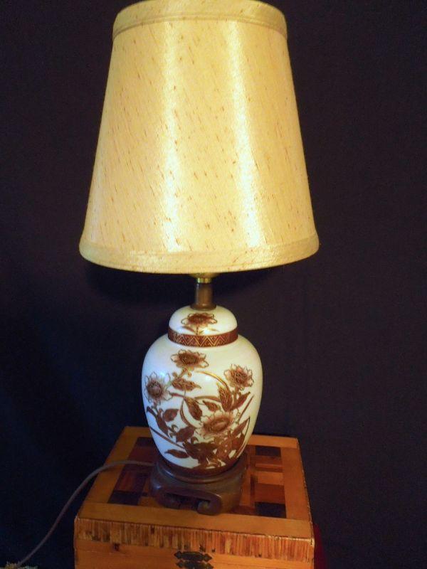 Two wood jewelry boxes, one with 3 drawers, one with paper lining, the other is satin lined leather; a mirrored dresser oval tray; a small ginger jar oriental lamp with silk lampshade and tons of vintage jewelry.