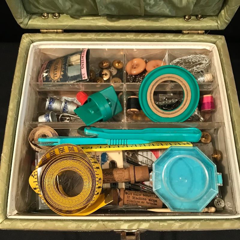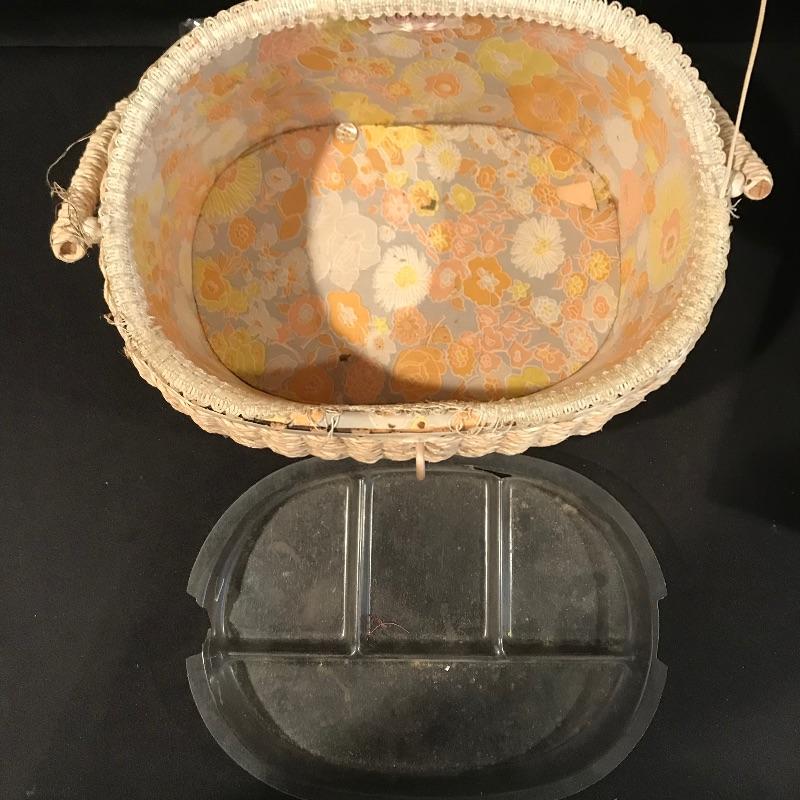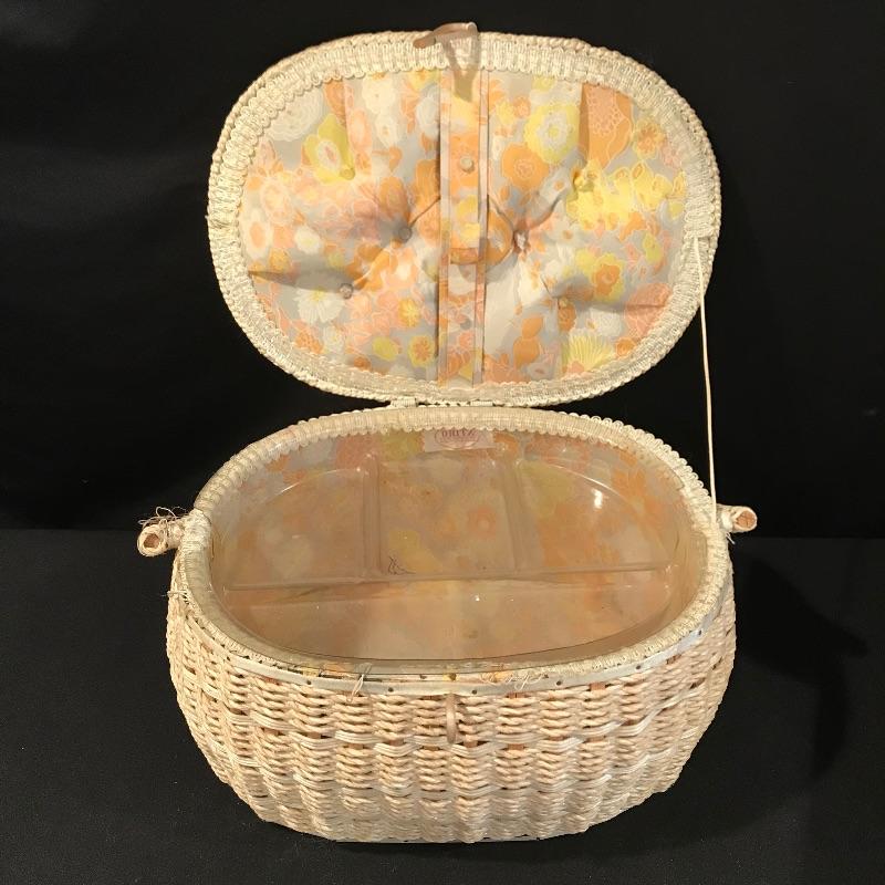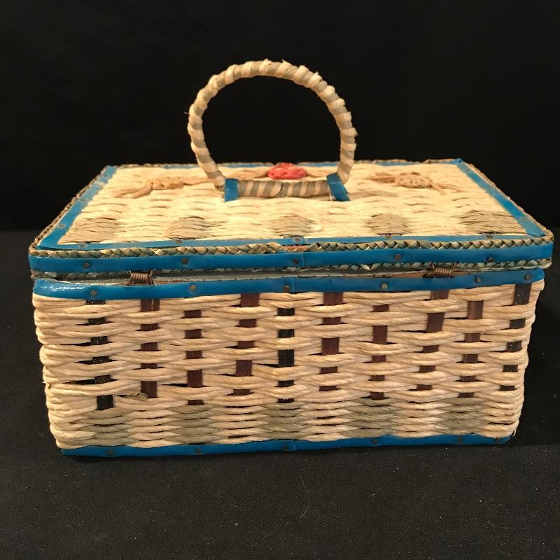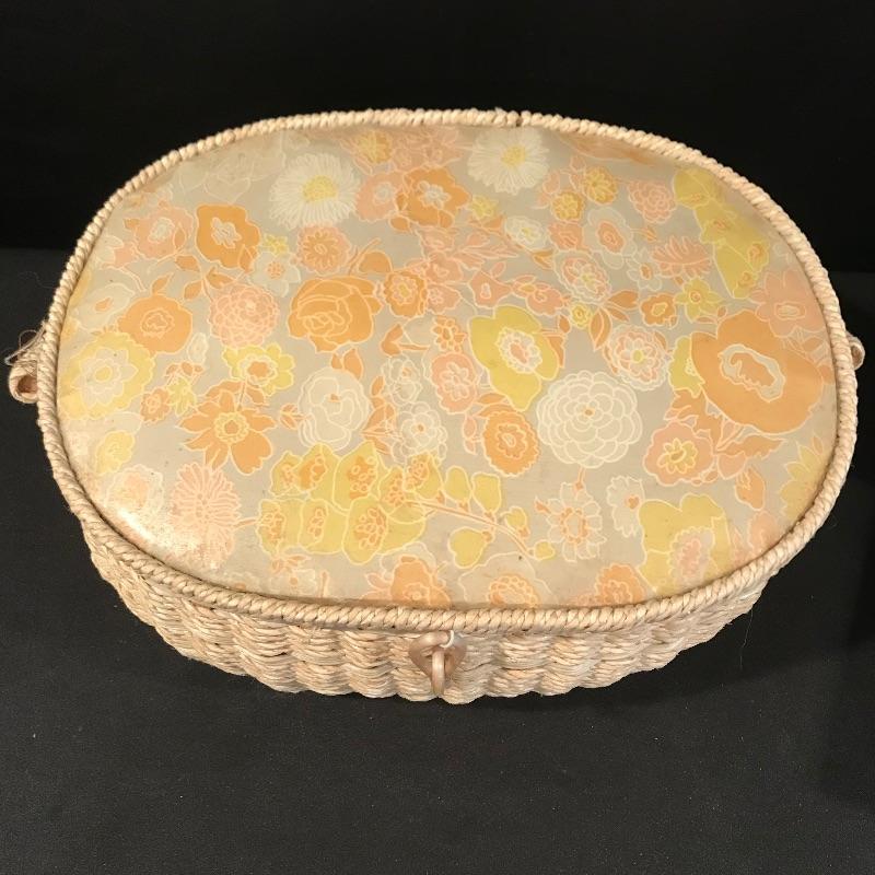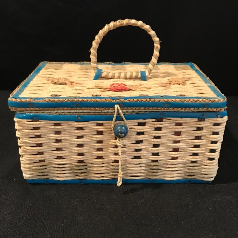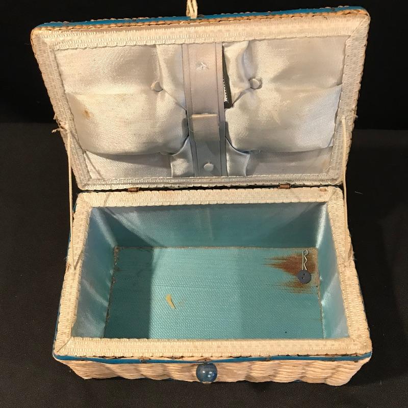 Two woven sewing baskets with cloth lining and a cloth covered sewing box filled with useful sewing equipment and accessories. First, a larger woven ivory basket by Dritz measuring about 11” x 7.5” x 6.5”. The Dritz basket also has a plastic organizer that fits well, but has some damage. The smaller basket is woven from a rope like material with teal accents and floral decor. Lastly a 10” x 8.75” x 5.5” box with a quilted style olive cover. See photos. Shipping available.