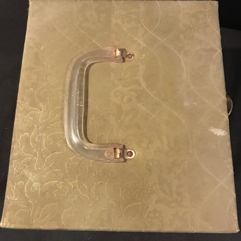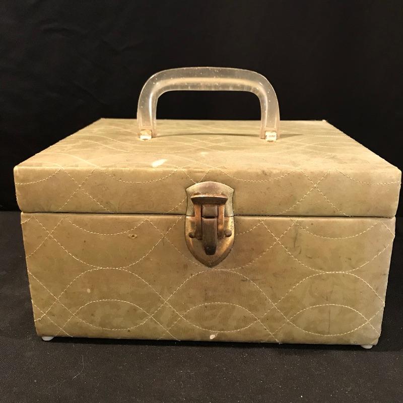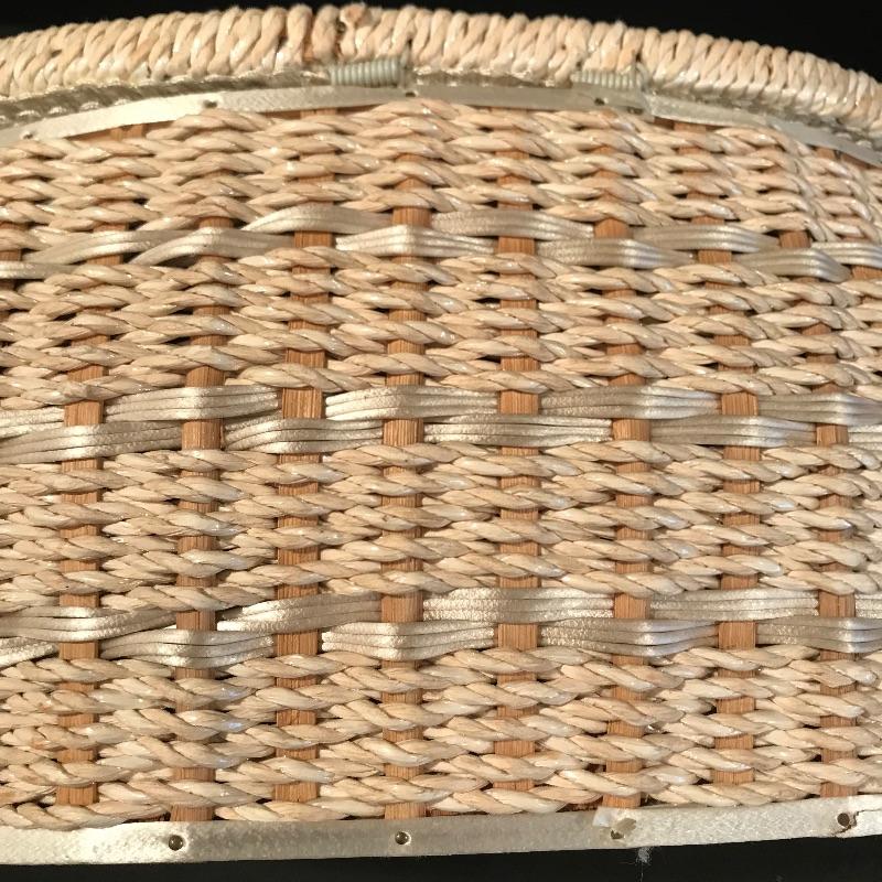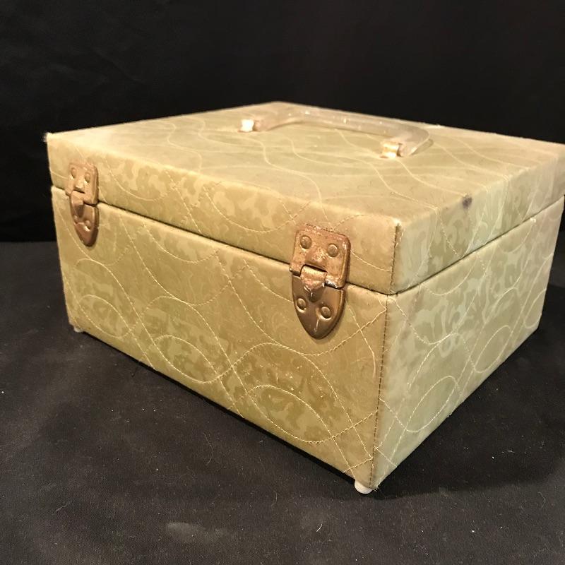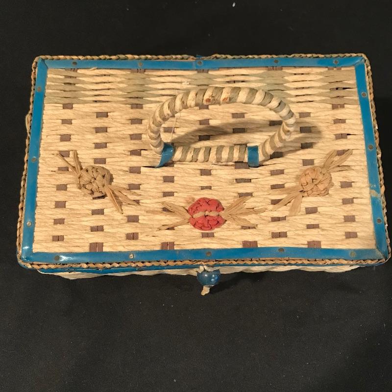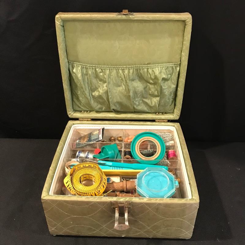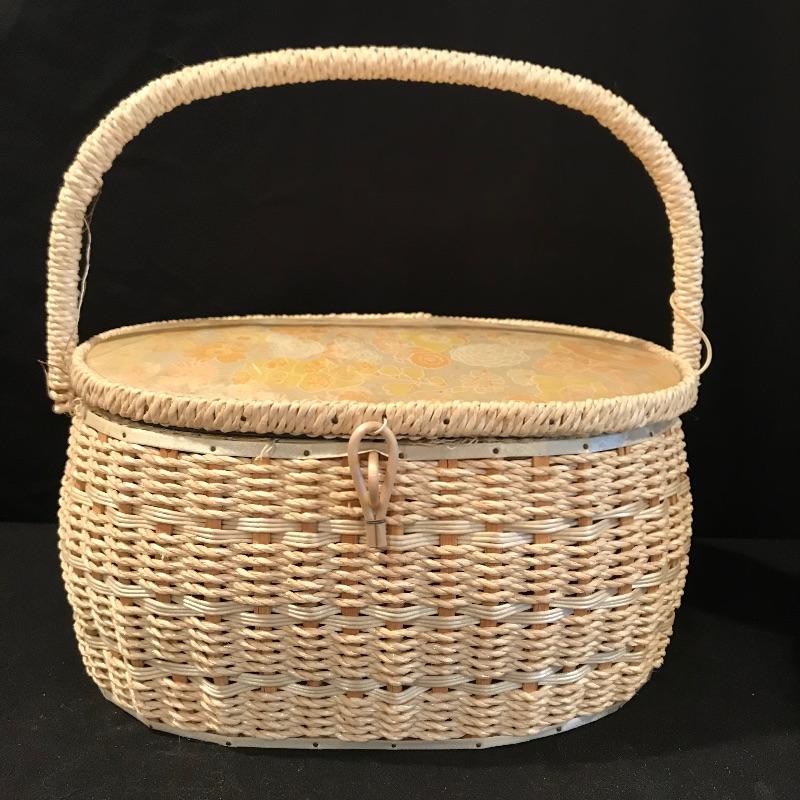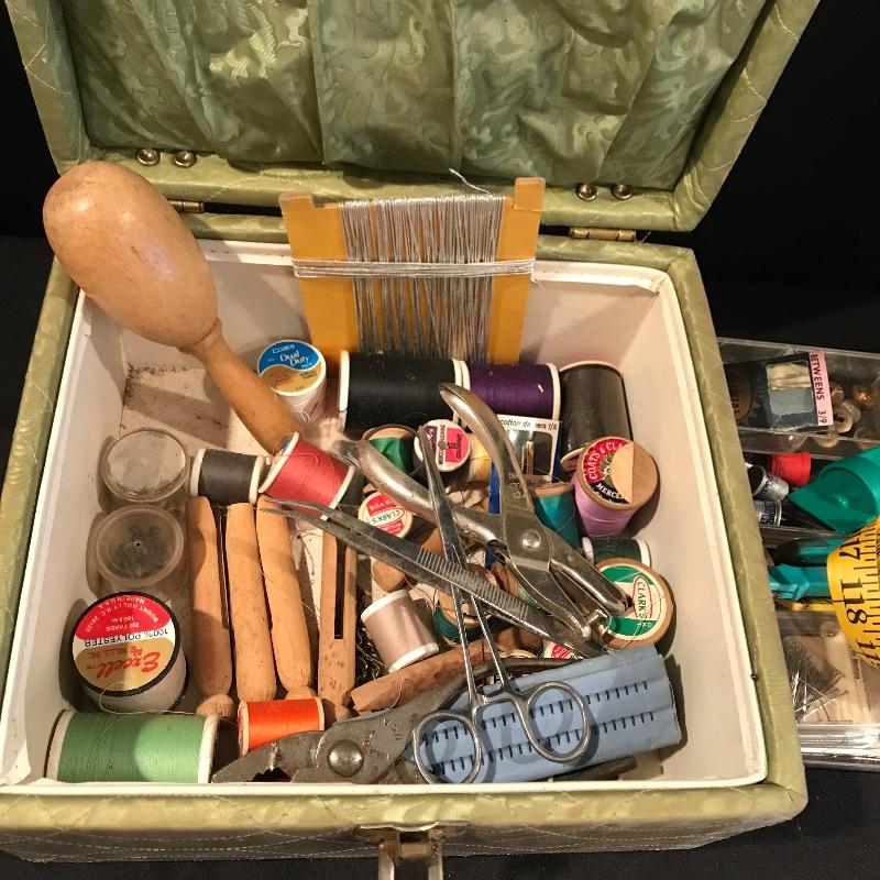 Two woven sewing baskets with cloth lining and a cloth covered sewing box filled with useful sewing equipment and accessories. First, a larger woven ivory basket by Dritz measuring about 11” x 7.5” x 6.5”. The Dritz basket also has a plastic organizer that fits well, but has some damage. The smaller basket is woven from a rope like material with teal accents and floral decor. Lastly a 10” x 8.75” x 5.5” box with a quilted style olive cover. See photos. Shipping available.