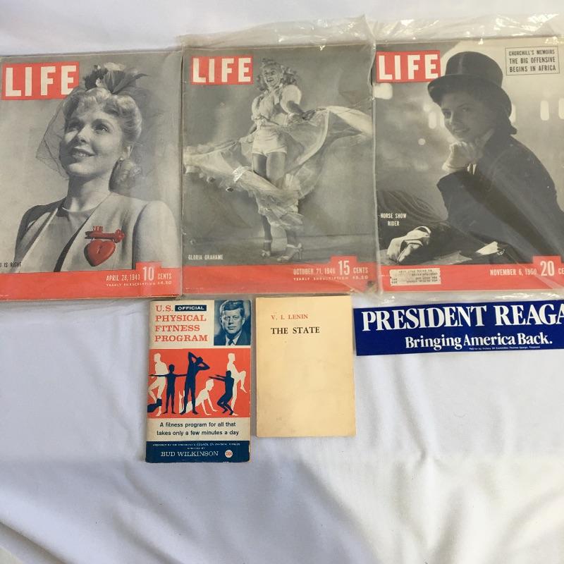 This lot includes two large official Nixon campaign posters and three vintage Life magazines from the years 1941, 1946 and 1950. Also includes a The State (Lenin's lecture reprint), an official US physical fitness program and a Ronald Reagan bumper sticker.