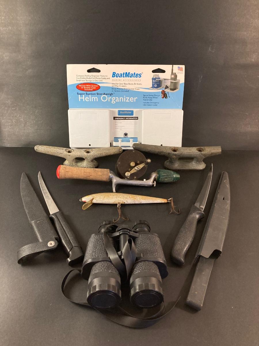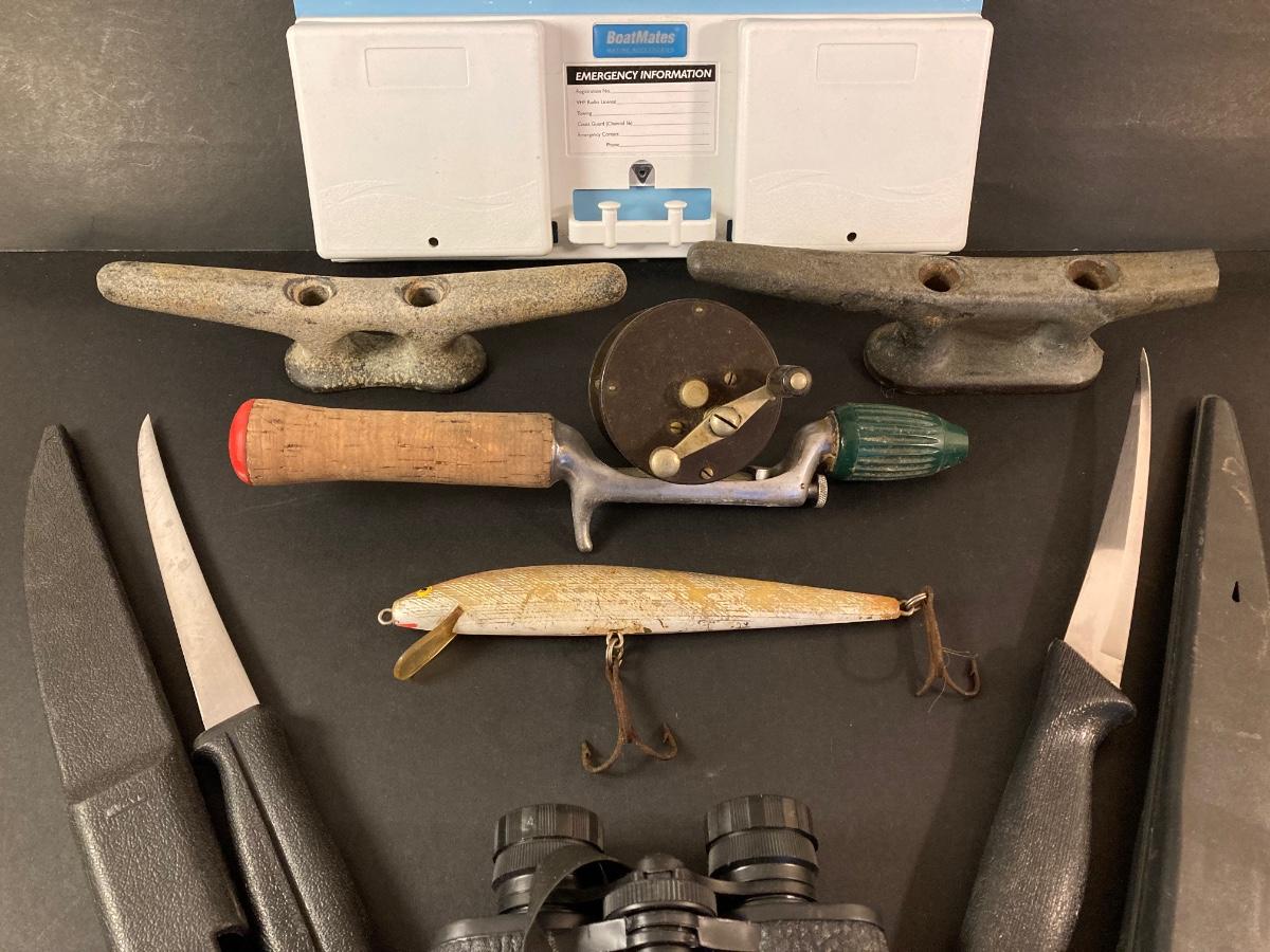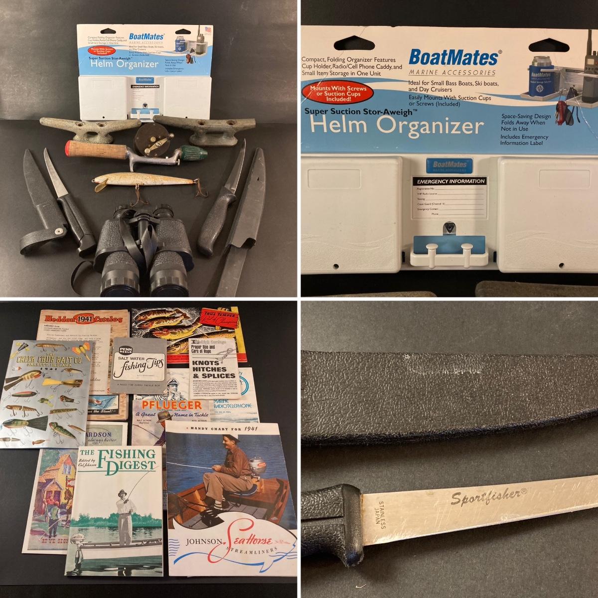LOT 205J: Nautical Collection - Reel, Helm Organizer, Sportfisher Knife, Books, Catalogs and More