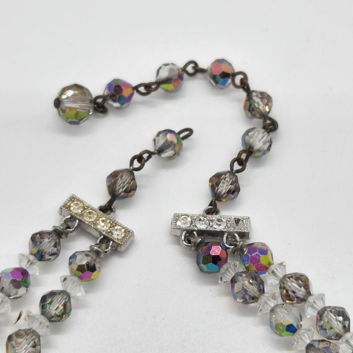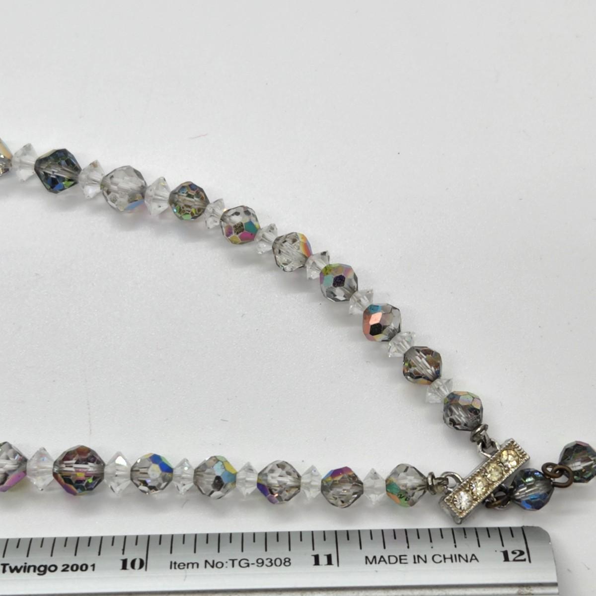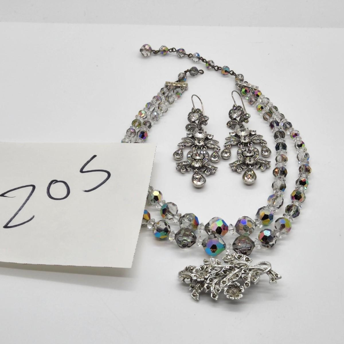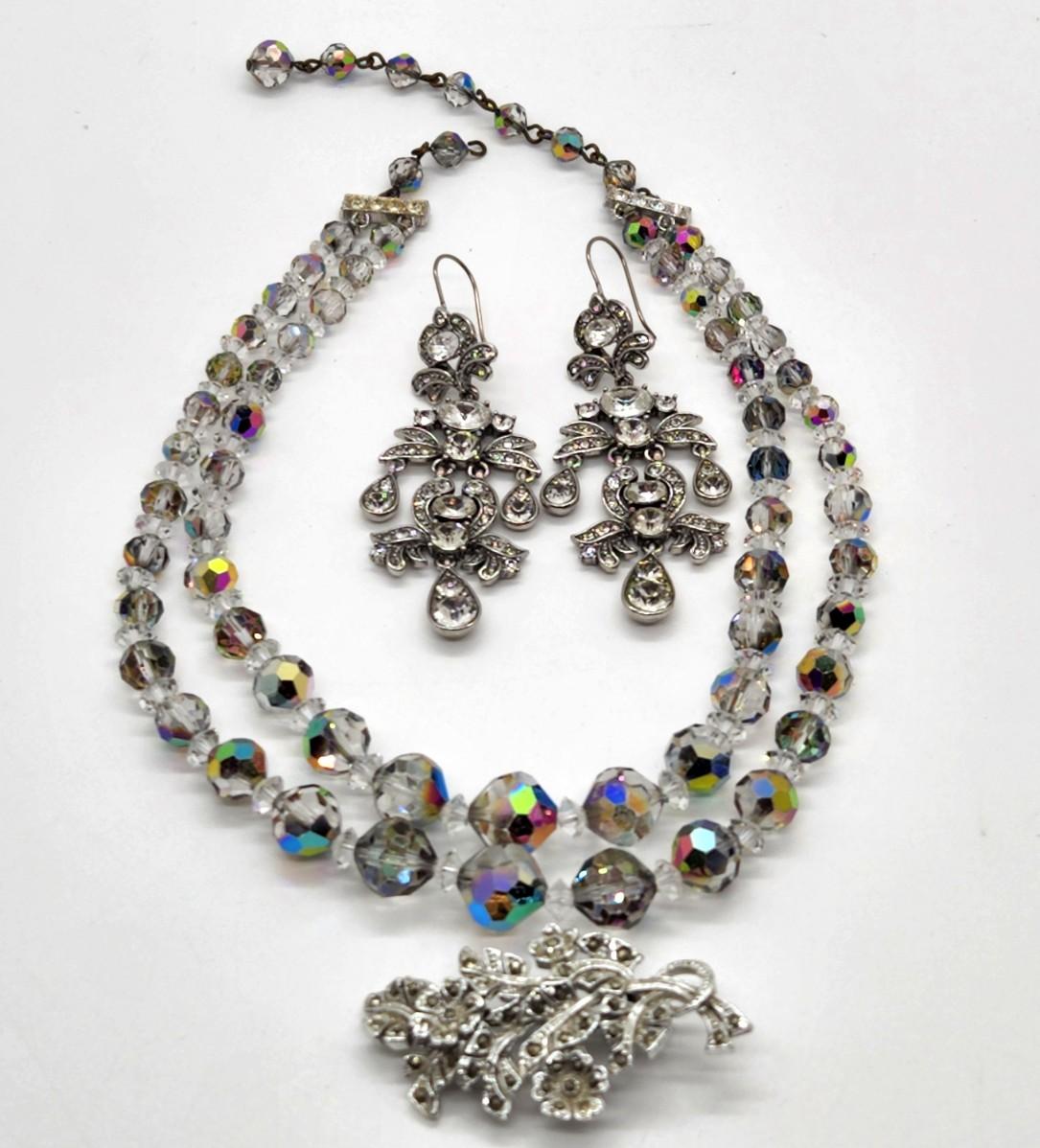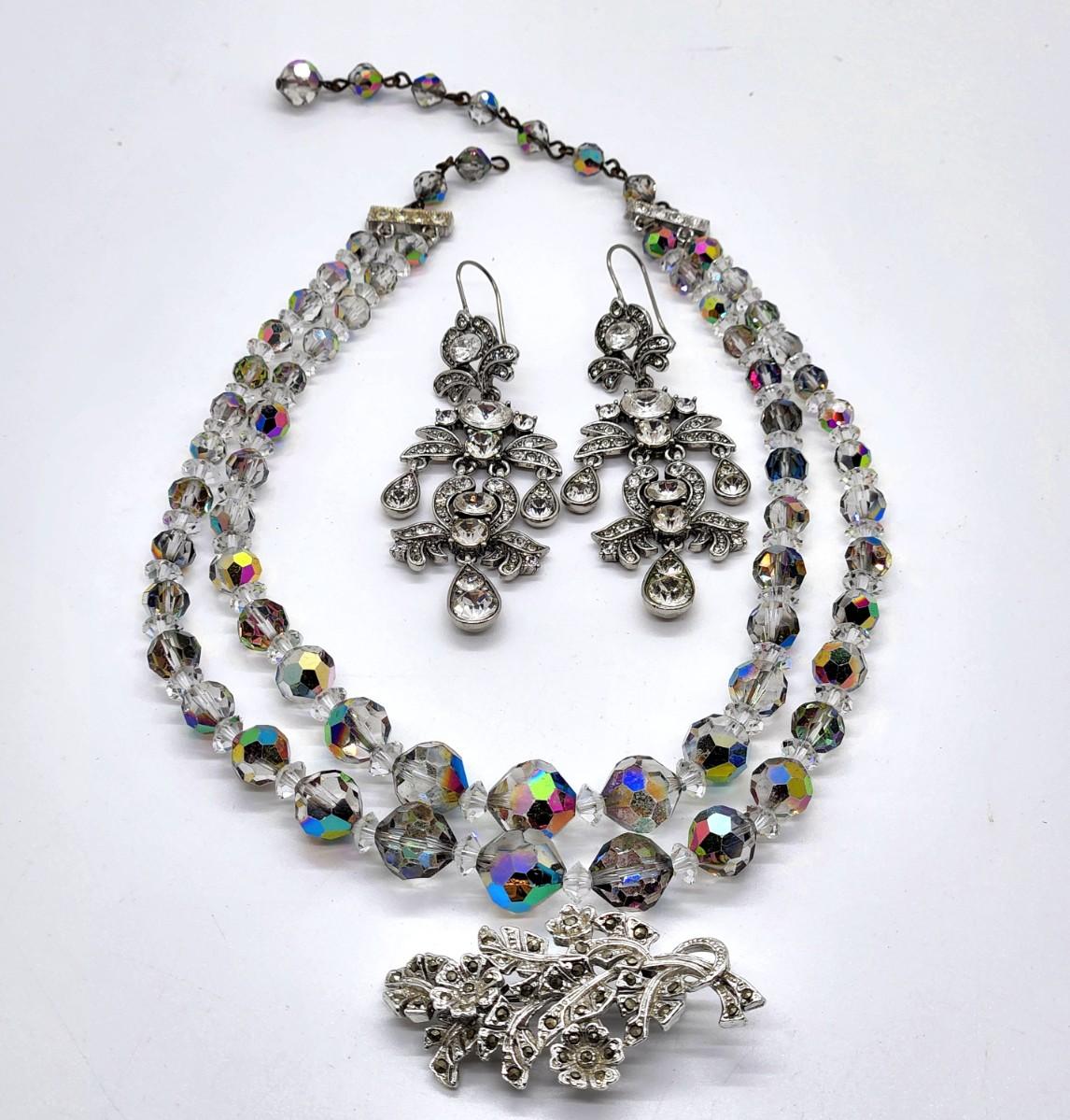 In this collection you are getting an adjustable aurora borealis necklace w/missing clasp hook, rhinestone chandelier earrings and a marcasite pin.